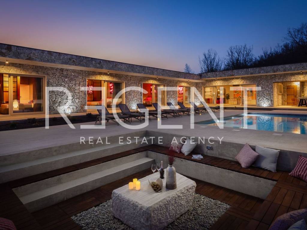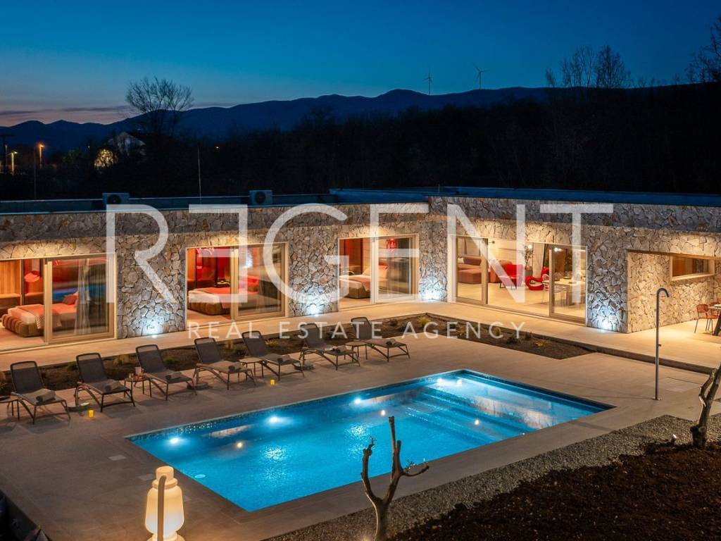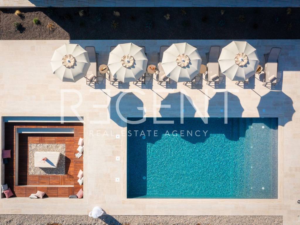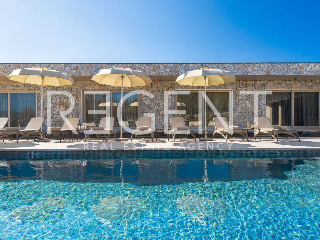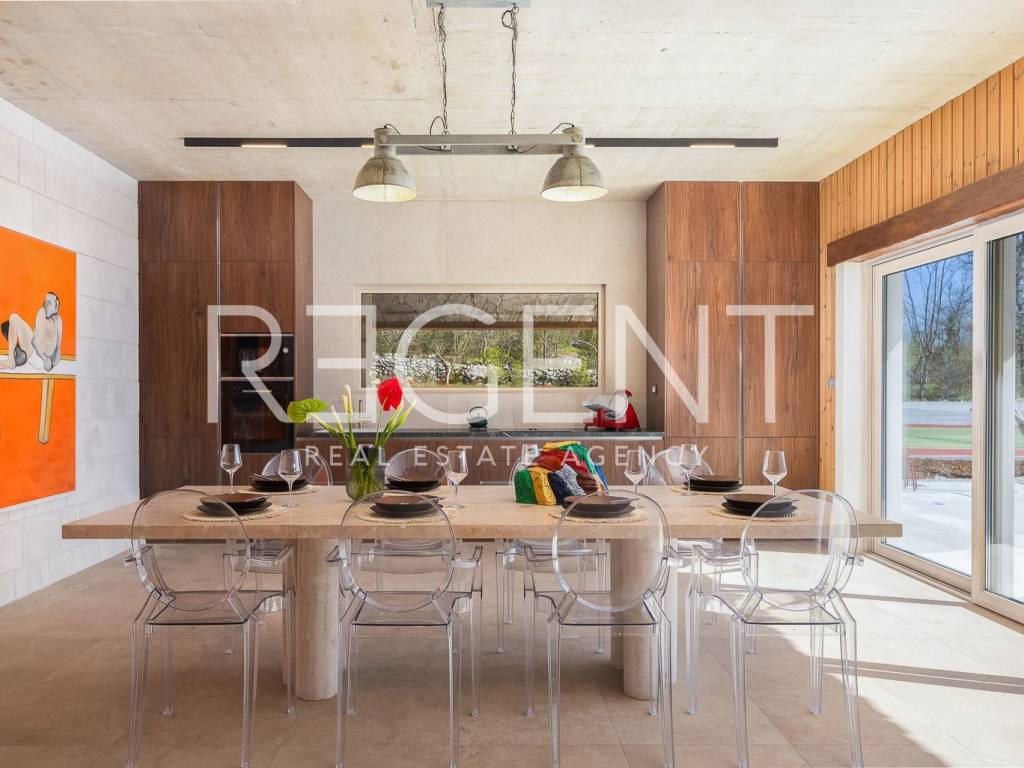 The newly built Mediterranean villa is located in a peaceful natural environment, not far from Split, on a large plot of 3,000 m². The villa is ideal for those seeking complete privacy, luxury and spacious outdoor space, and also represents an excellent investment for tourist rental. The living space of 240 m² is designed in an open space concept that combines industrial style with a Mediterranean atmosphere. On the ground floor there is a large living room with a kitchen and dining room, open to a covered terrace with a summer kitchen, fireplace and "fire pit" zone. The villa has four bedrooms, each with its own bathroom, and the interior is decorated with a combination of stone, concrete and wood. High-quality aluminum joinery includes entrance doors 4 meters high and large sliding walls that ensure an open view of the environment. The outdoor areas are paved with travertine, with ambient LED lighting. The garden includes a heated pool of 45 m² with a heat pump, a tennis court measuring 17 × 34 m with artificial grass and floodlights, a sun deck and a large terrace of 250 m². Additional amenities include an outdoor shower with hot water, an outdoor toilet, automatic irrigation and landscaped horticulture. The parking space provides space for 5–6 vehicles. The villa has underfloor heating with separate regulation per room, two Panasonic air conditioners, Hans Grohe bathroom equipment and video surveillance. Energy certificate A confirms high efficiency. The location offers perfect peace and nature, with simultaneous proximity to Split, the sea and all necessary amenities. This is an ideal opportunity for those who want a luxury property for personal use or high-end tourist rental. The villa is ready to move into immediately. For more information and to arrange a viewing, feel free to contact us.