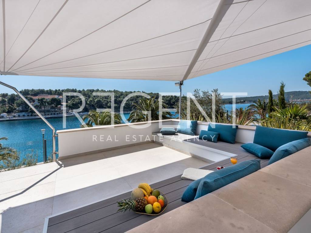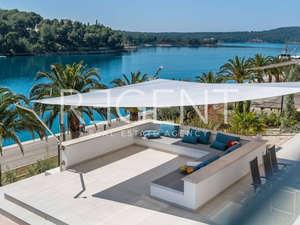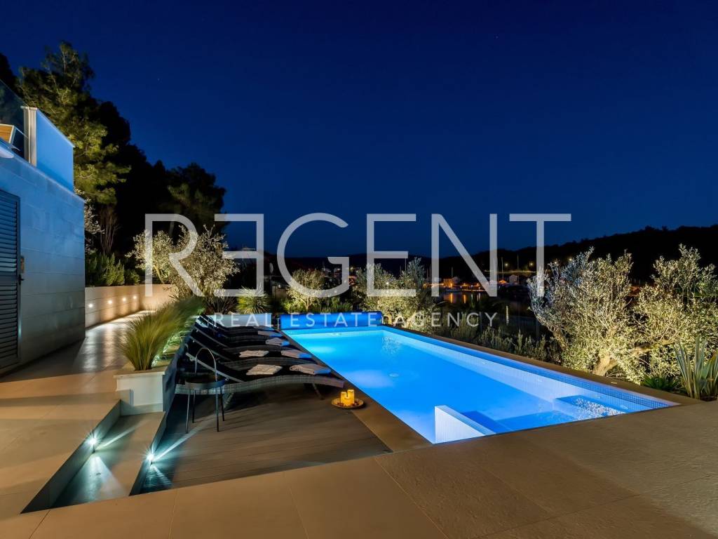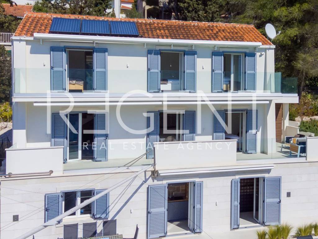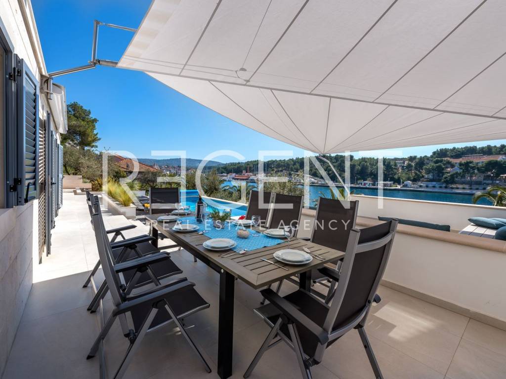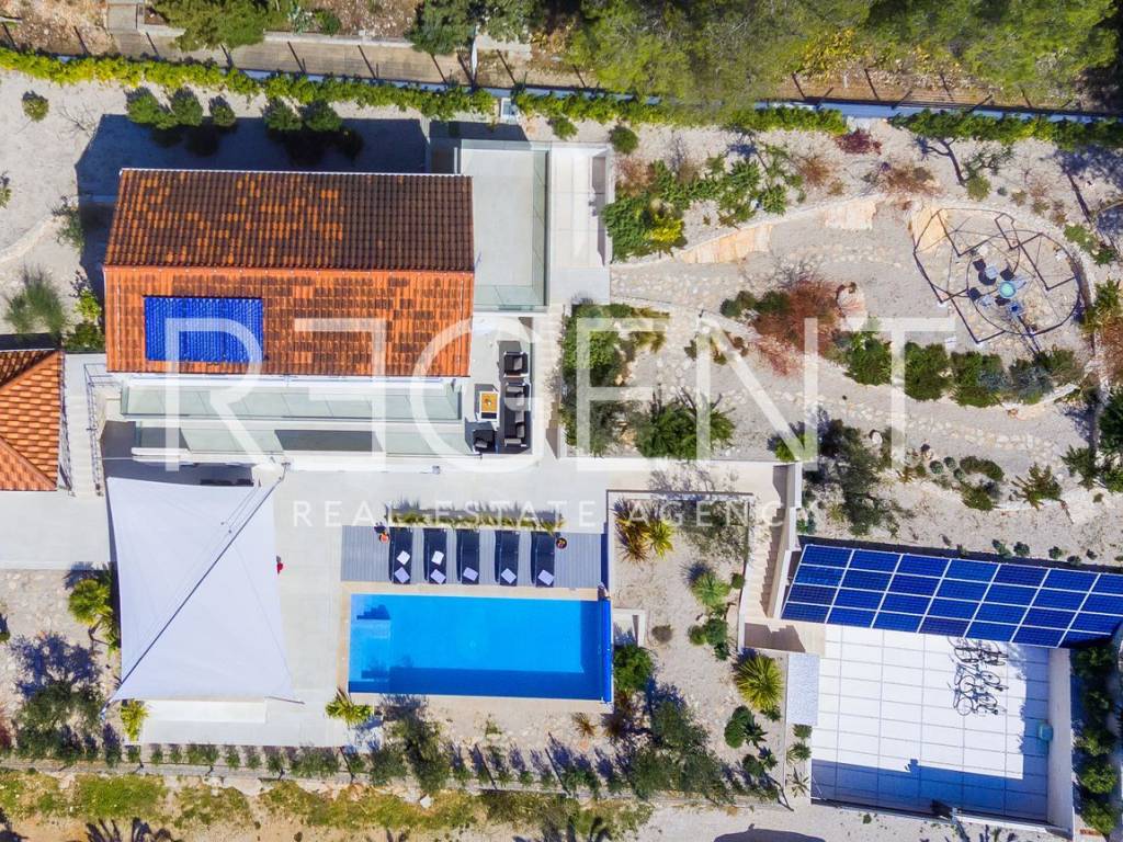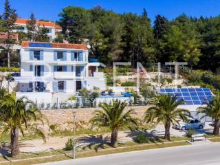 Beautiful modern villa located in Milna on Brač, first row to the sea, with a total living area of 264 m2, located on a plot of 1055 m2. The villa consists of three floors: GROUND FLOOR: storage room, tavern, sauna with bathroom, access to the terrace where there is an outdoor kitchen with a swimming pool. FIRST FLOOR: living room with kitchen and dining room, bedroom, bathroom, hallway, storage room, terrace with a beautiful sea view. SECOND FLOOR: bedroom 2 with bathroom, bedroom 3 with bathroom, staircase, balcony. The villa contains a heat pump, solar panels, smart home system, outdoor swimming pool and covered parking. Location: First row to the sea, close to the beach, and all essential amenities. Contact us for more information!