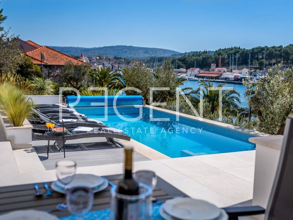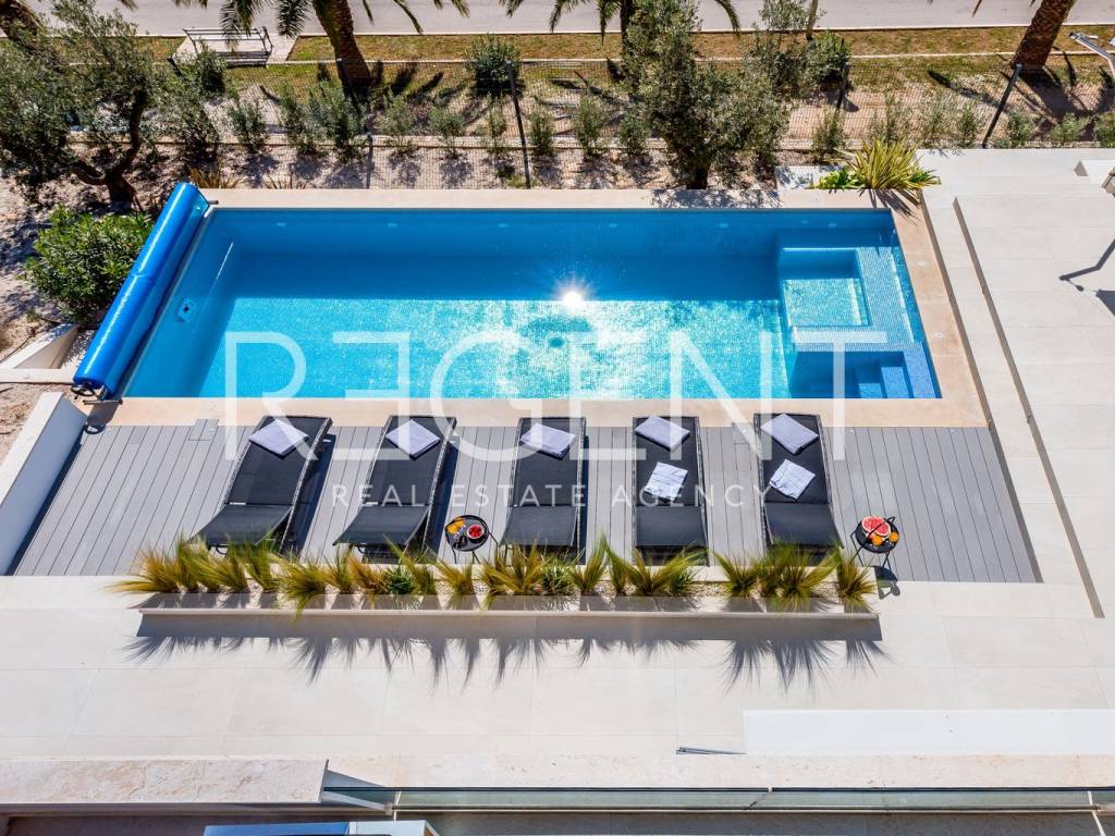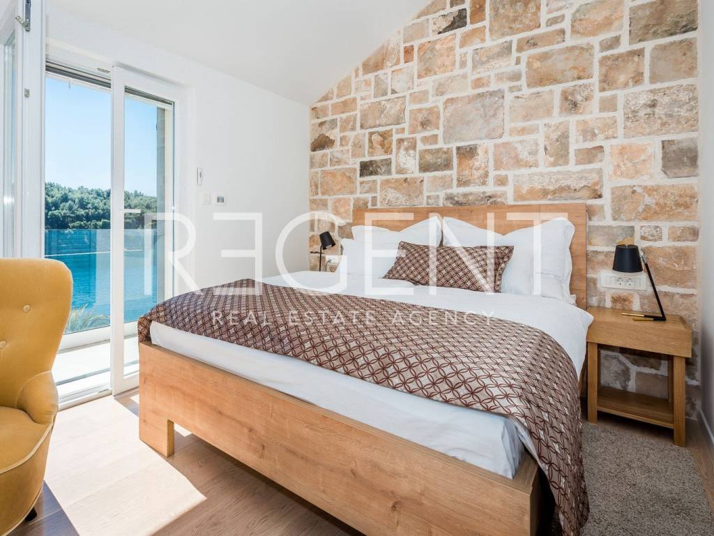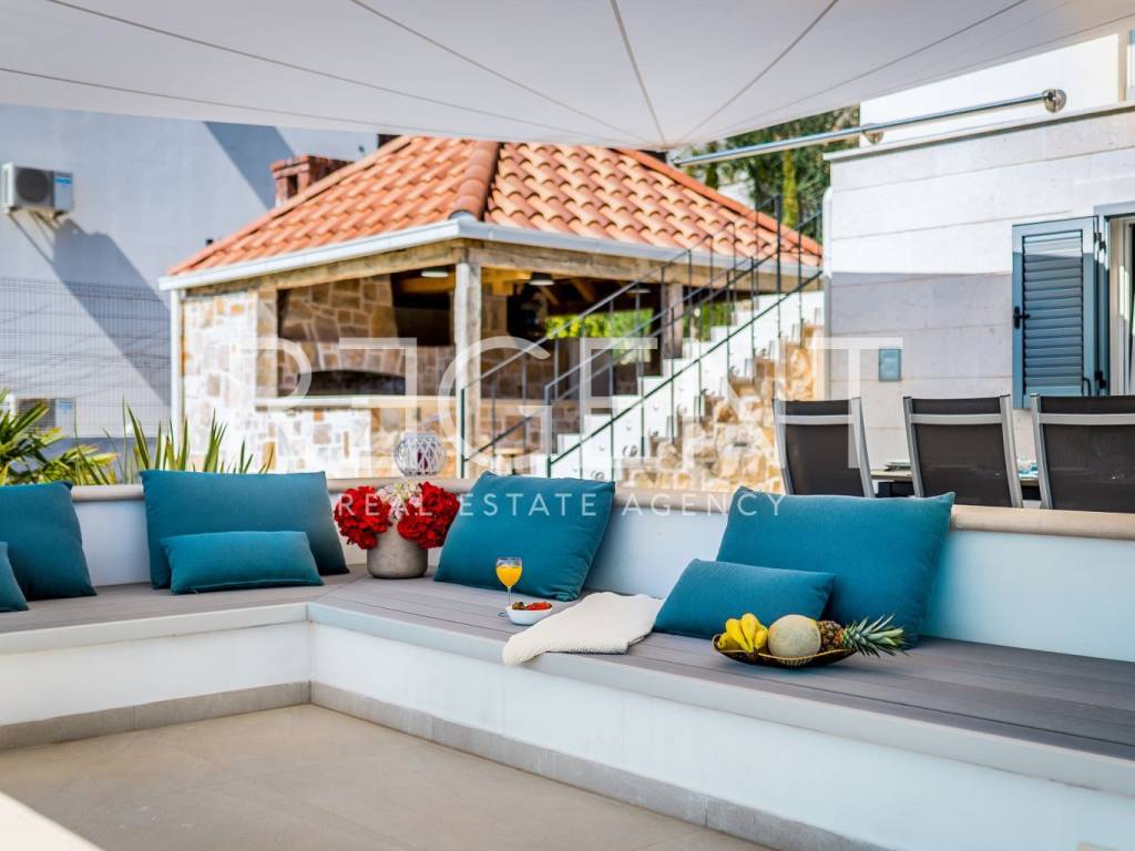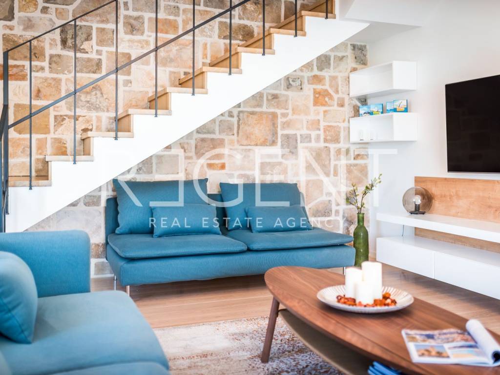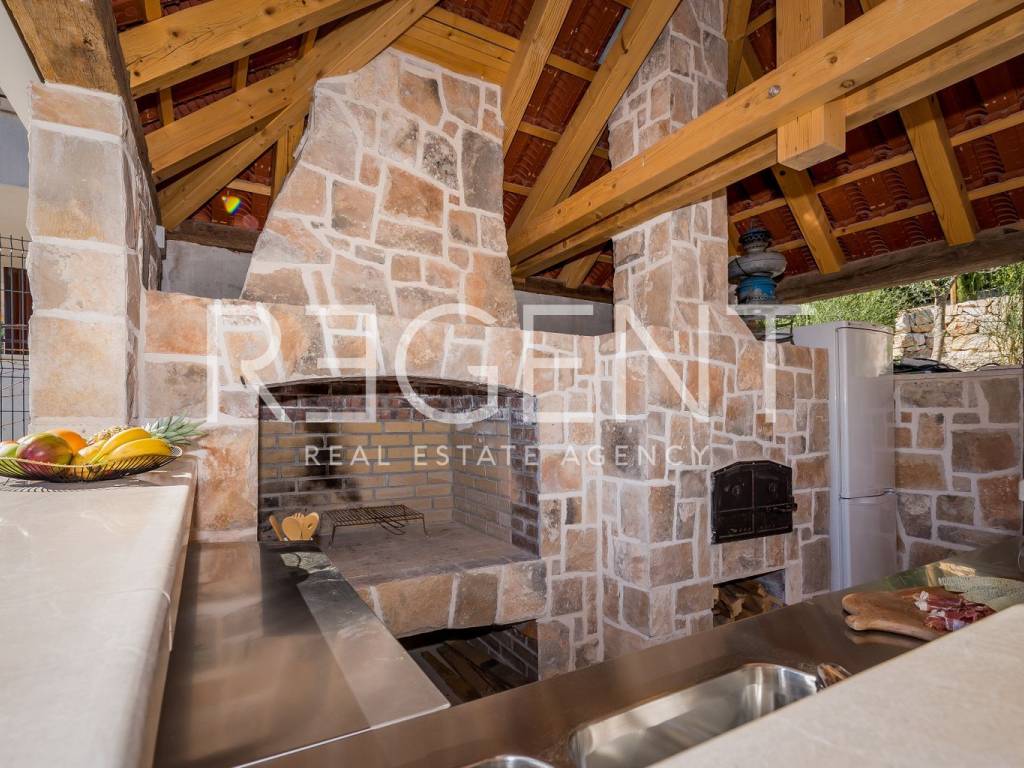 Beautiful modern villa located in Milna on Brač, first row to the sea, with a total living area of 264 m2, located on a plot of 1055 m2. The villa consists of three floors: GROUND FLOOR: storage room, tavern, sauna with bathroom, access to the terrace where there is an outdoor kitchen with a swimming pool. FIRST FLOOR: living room with kitchen and dining room, bedroom, bathroom, hallway, storage room, terrace with a beautiful sea view. SECOND FLOOR: bedroom 2 with bathroom, bedroom 3 with bathroom, staircase, balcony. The villa contains a heat pump, solar panels, smart home system, outdoor swimming pool and covered parking. Location: First row to the sea, close to the beach, and all essential amenities. Contact us for more information!