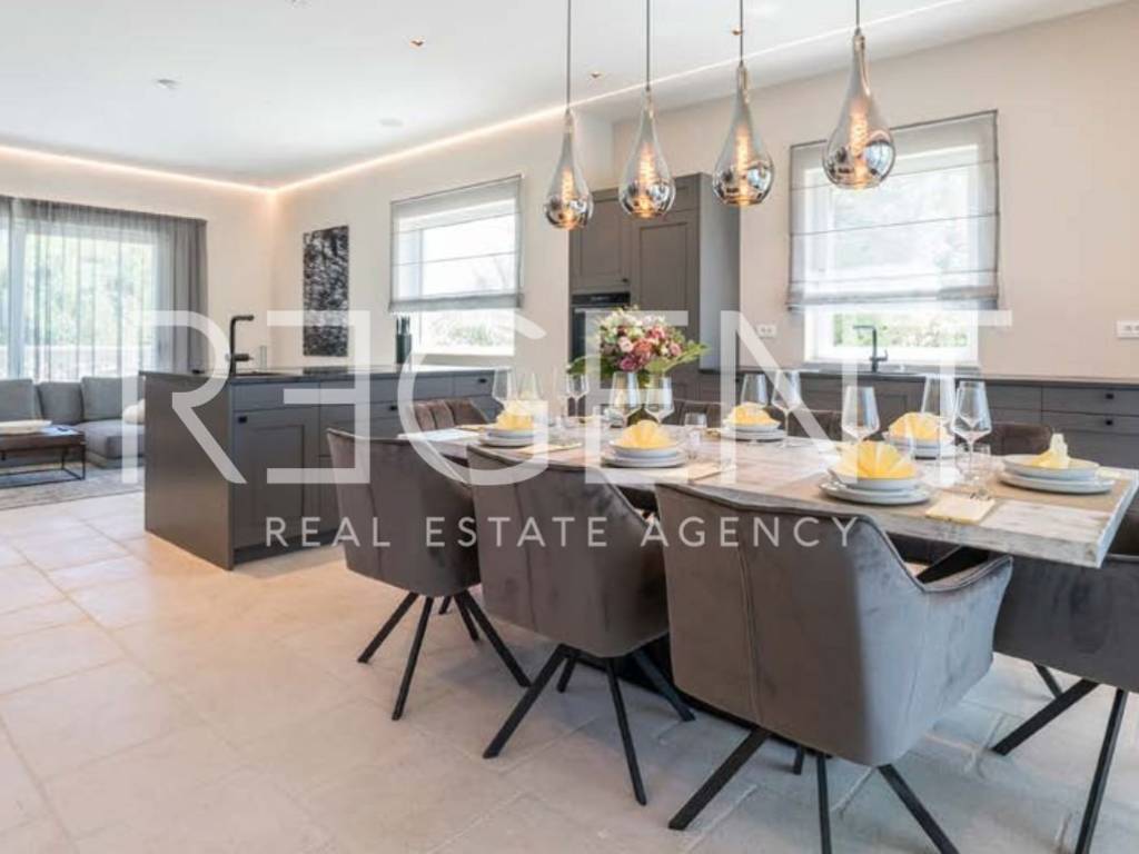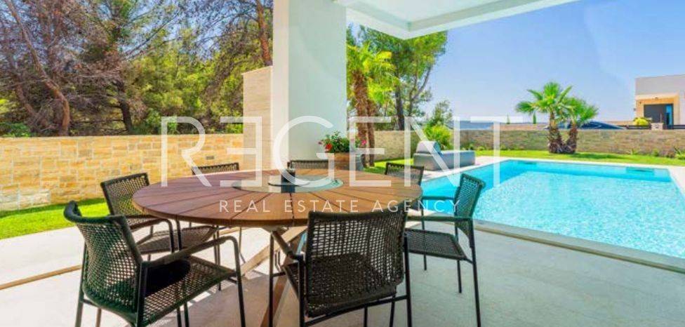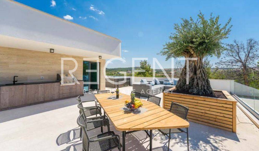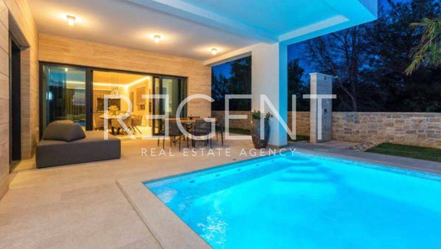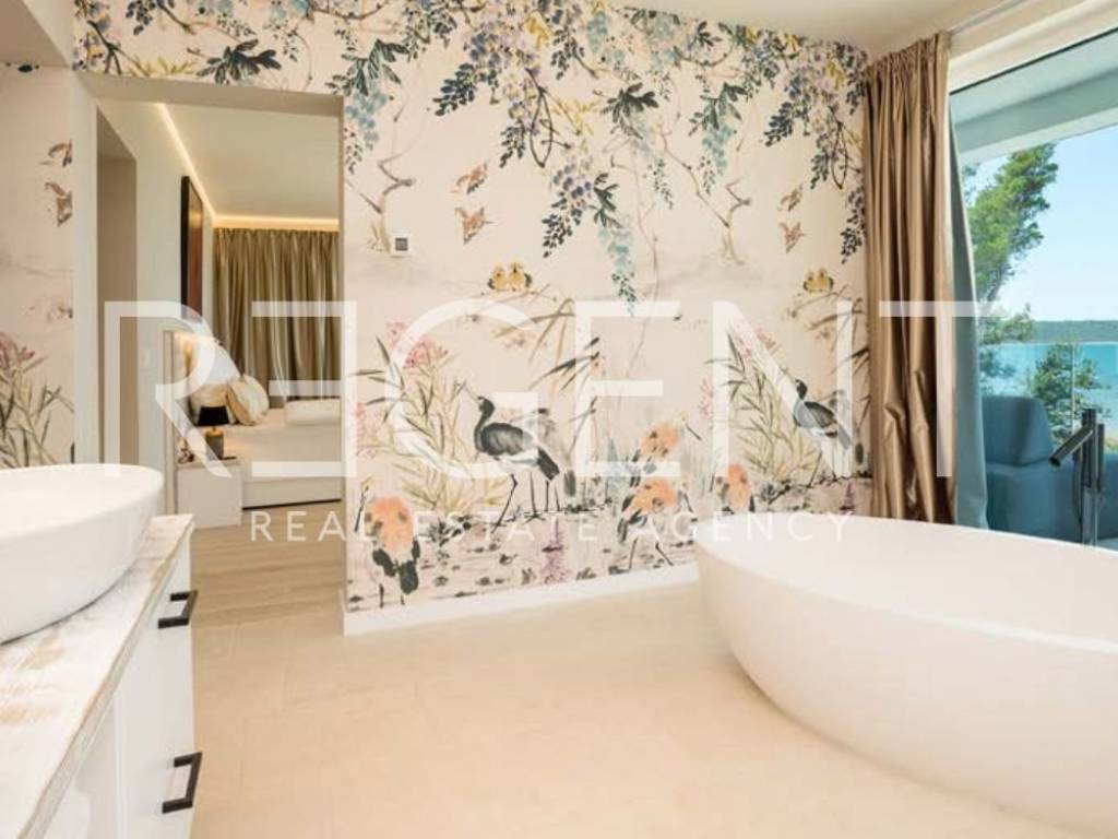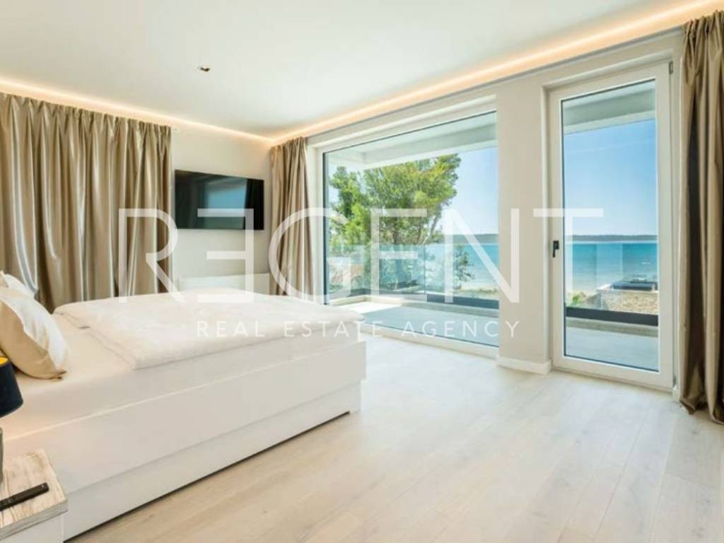 Exclusive villa located on the beach in Ljubač, in an excellent location in northern Dalmatia. The property extends over three floors and offers luxurious living and relaxation space, ideal for buyers looking for privacy, comfort and direct contact with the sea. The villa has a total living area of 329 m² and consists of three bedrooms, each with a wardrobe and its own bathroom. On the ground floor there is a fitness room with access to the terrace and a 35 m² swimming pool, as well as a spacious living room with a kitchen and dining room. On the second floor there is a roof terrace of 110 m² with a wellness area, which includes a sauna, jacuzzi, outdoor kitchen and dining area with a panoramic view of the sea and Velebit. The interior is decorated with luxurious natural materials, and the villa is equipped with a multimedia system, video surveillance and automatic garden irrigation. The property is located in the quiet town of Ljubač, just 20 km from Zadar and the international airport. The proximity of historical Nin, the island of Pag and the Krka National Park makes this location perfect for a luxury vacation or life by the sea. The beach is located in front of the villa itself, and all the amenities needed for everyday life are available nearby. The building was completed in October 2022, and the land occupies an area of 560 m². The villa has two outdoor parking spaces, while an XXL garage with an e-mobility connection is available as an option. The property is sold fully equipped and ready for occupancy. The sale price is 2,750,000 EUR (net). For more information or to arrange a viewing, feel free to contact us.
