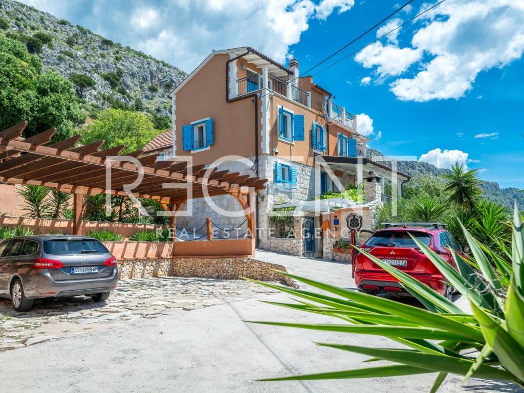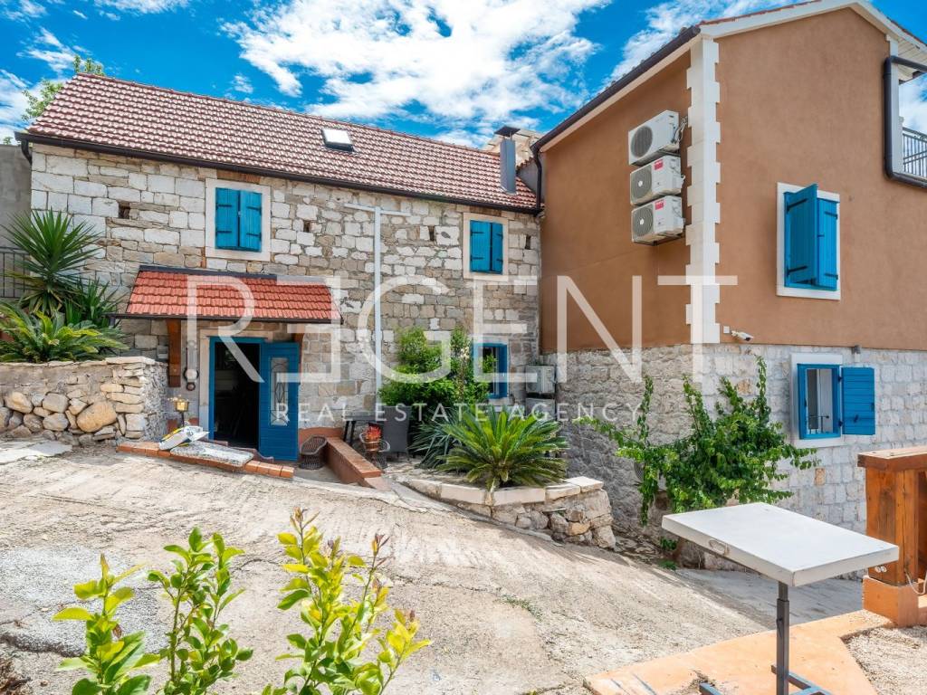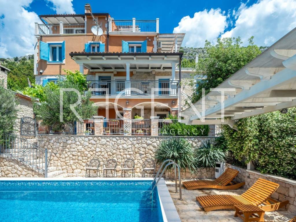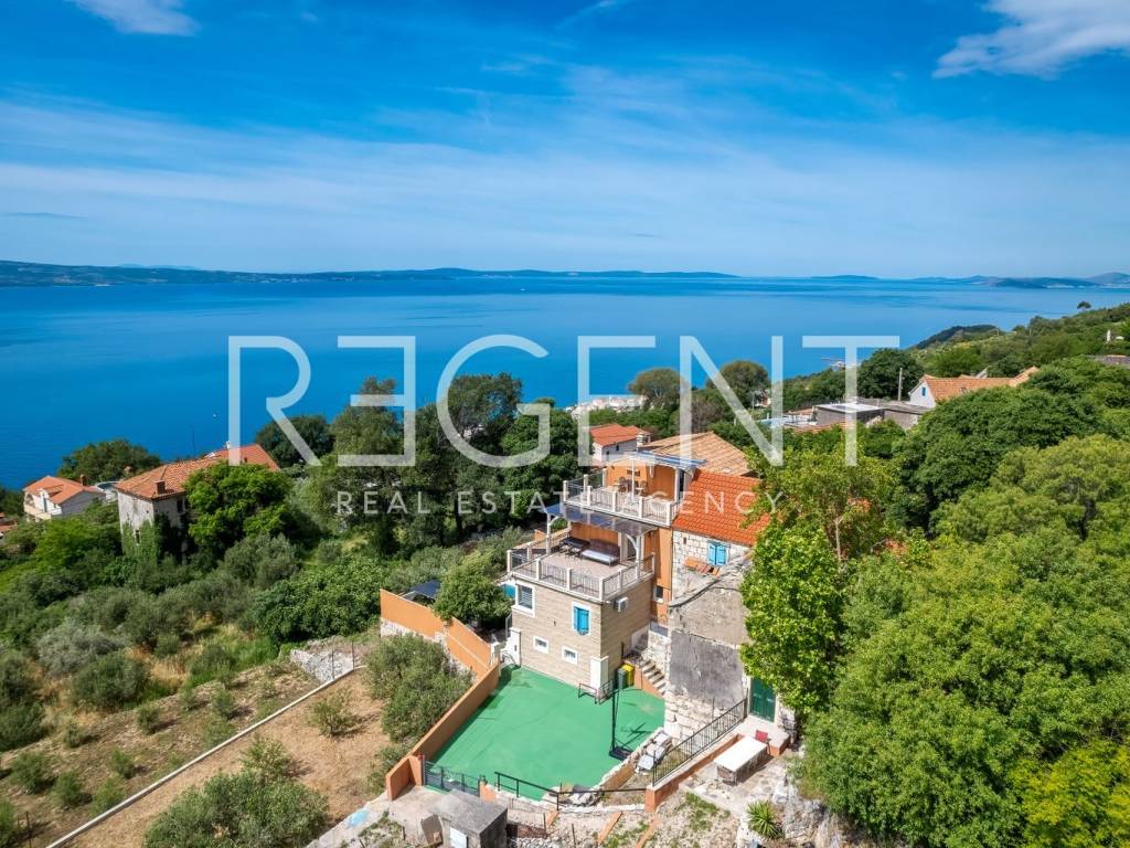In the peaceful town of Krilo Jesenice, only 15 km from Split, lies this authentic villa surrounded by olive groves and untouched nature, with a magnificent sea view. Perfect for those seeking tranquility, a Mediterranean ambiance, and spaciousness, this villa offers an excellent opportunity for family life, a luxurious vacation, or a tourist investment. The villa extends over four floors and includes 10 bedrooms and 6 bathrooms, providing plenty of space and comfort. The ground floor features a large living room, men's and women's toilets, and a fully equipped kitchen – ideal for gatherings and shared moments. Within the same complex, there is an additional, separate object with its own living room, kitchen, a bed for two people, and a toilet, making it ideal as accommodation for guests or staff. The outdoor area of the villa is delightful: a swimming pool surrounded by greenery, a children's playground, and ample parking guarantee outdoor enjoyment and maximum functionality. The entire property is decorated in an authentic Dalmatian style with lots of stone and natural details, providing a feeling of warmth and connection with the environment. This villa represents a combination of privacy, nature, and proximity to the city – a rarity on the market. For any further information and viewings, we are at your disposal.