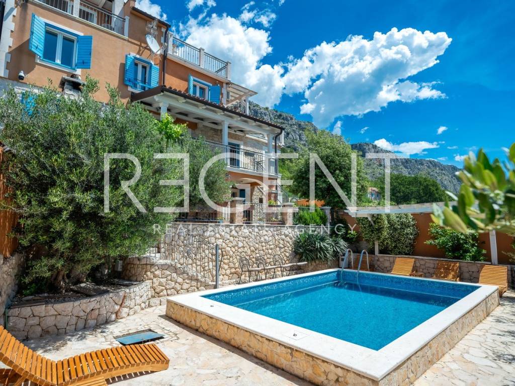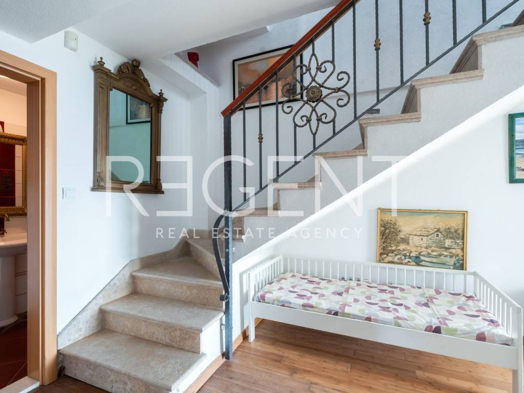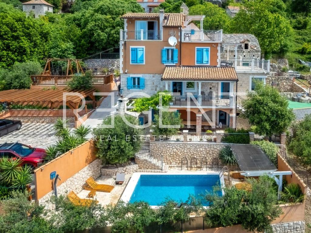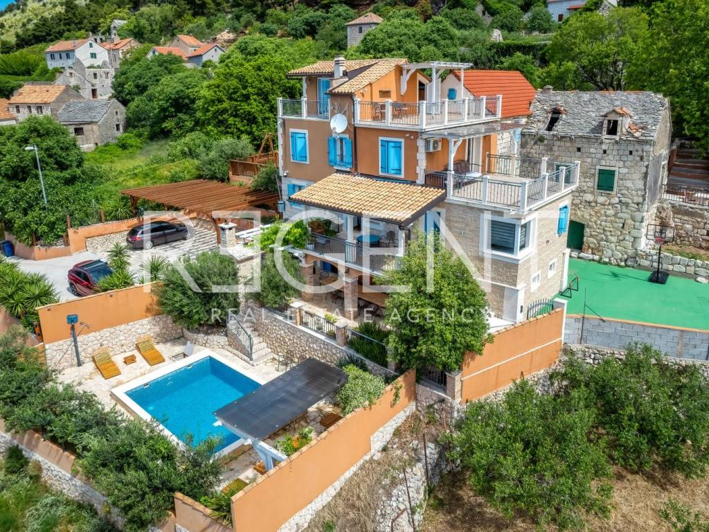 In the peaceful town of Krilo Jesenice, only 15 km from Split, lies this authentic villa surrounded by olive groves and untouched nature, with a magnificent sea view. Perfect for those seeking tranquility, a Mediterranean ambiance, and spaciousness, this villa offers an excellent opportunity for family life, a luxurious vacation, or a tourist investment. The villa extends over four floors and includes 10 bedrooms and 6 bathrooms, providing plenty of space and comfort. The ground floor features a large living room, men's and women's toilets, and a fully equipped kitchen – ideal for gatherings and shared moments. Within the same complex, there is an additional, separate object with its own living room, kitchen, a bed for two people, and a toilet, making it ideal as accommodation for guests or staff. The outdoor area of the villa is delightful: a swimming pool surrounded by greenery, a children's playground, and ample parking guarantee outdoor enjoyment and maximum functionality. The entire property is decorated in an authentic Dalmatian style with lots of stone and natural details, providing a feeling of warmth and connection with the environment. This villa represents a combination of privacy, nature, and proximity to the city – a rarity on the market. For any further information and viewings, we are at your disposal.