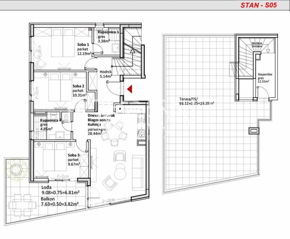 We are mediating the sale of a penthouse located in an excellent location in Sukošan, near Zadar. The unique location in the first row by the sea makes this apartment an ideal investment for future investors in tourism. The apartment is located on the top floor of a building under construction, and consists of two floors. The first consists of a hallway with a total net area of 5.14m2, two bathrooms of 3.38m2 and 4.85m2, an open space area of 28.44m2 which includes a living room, kitchen and dining room, three bedrooms of 10.31m2, 9.67m2 and 12.19m2, a loggia of 6.81m2 and a balcony of 3.81m2. The apartment also includes a staircase of 12.55m2 leading to the second floor, where there is a spacious roof terrace of 23.28m2. The apartment is equipped with air conditioning and underfloor heating in the bathroom. The apartment also comes with an outdoor parking space that is included in the price. ***The project includes three residential buildings with fifteen apartments, each with one parking space. Each building consists of three floors - ground floor, first, second floor and roof terrace that belongs to the penthouse. The first and second buildings contain six residential units of different sizes and number of rooms, while the third building consists of three larger apartments. The ground floor apartments also contain a swimming pool and a spacious terrace in the yard. The first building offers a parking space in the garage for an additional fee, while the remaining two contain an outdoor parking space which is included in the price. Luxurious penthouses that offer complete privacy due to the internal staircase, roof terrace on the second floor of the apartment and a beautiful open view of the sea, and spacious apartments on the ground floor that offer a garden and swimming pool are an exceptional opportunity for future investors in tourism. All residential units are equipped with high-quality materials, underfloor heating and air conditioning, and the location in the immediate vicinity of beautiful beaches and all the facilities needed for everyday life are an opportunity for a peaceful and practical life throughout the year.***