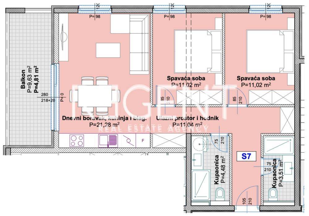 We mediate in the sale of a two-room apartment in a new building located on the first floor of a building in beautiful Makarska. The apartment consists of an open space of 22.12 m2 with access to a loggia of 9.87 m2, two bedrooms of 13.43 m2 and 12.25 m2, a bathroom of 5.60 m2 and an entrance area of 4.32 m2. The equipment of the apartments meets the highest standards, including reinforced concrete construction with earthquake-resistant foundations, energy efficiency according to the highest standards, and top-quality aluminum carpentry. The building is equipped with an elevator, and all windows and doors are made of high-quality PVC, equipped with thermal and sound insulation, which guarantees an energy-efficient and quiet environment. The bathrooms are equipped with sanitary equipment and 1st class tiles, which further emphasizes the luxurious impression of the space. With the apartment, it is possible to buy a garage parking space at a price of 1600 euros per m2, an outdoor parking space at a price of 10,000 euros and a storage room at a price of 5,000 euros. This apartment is an ideal investment for future tourist activities due to the proximity of beaches, the town square, schools, kindergartens and shops, as well as for a quiet life for couples and families not far from the city. For all other inquiries, feel free to contact us!
