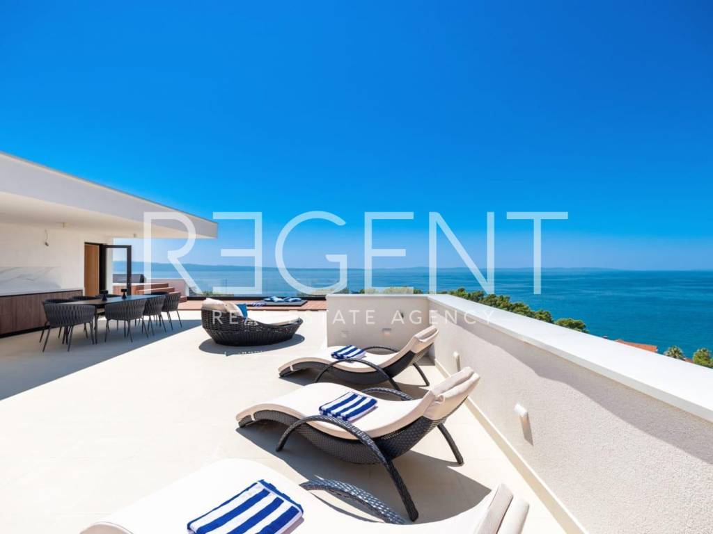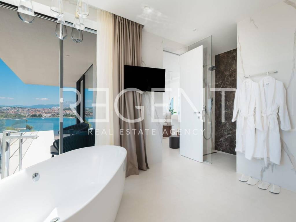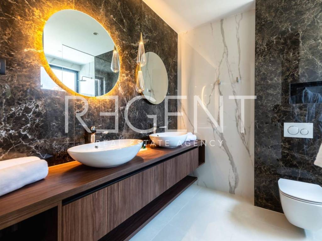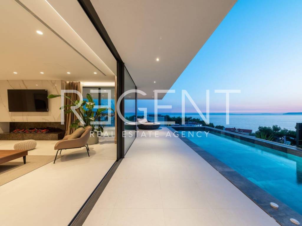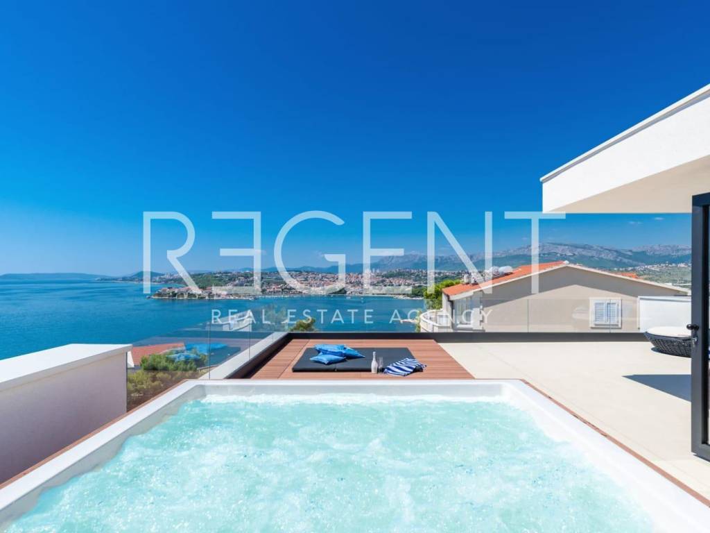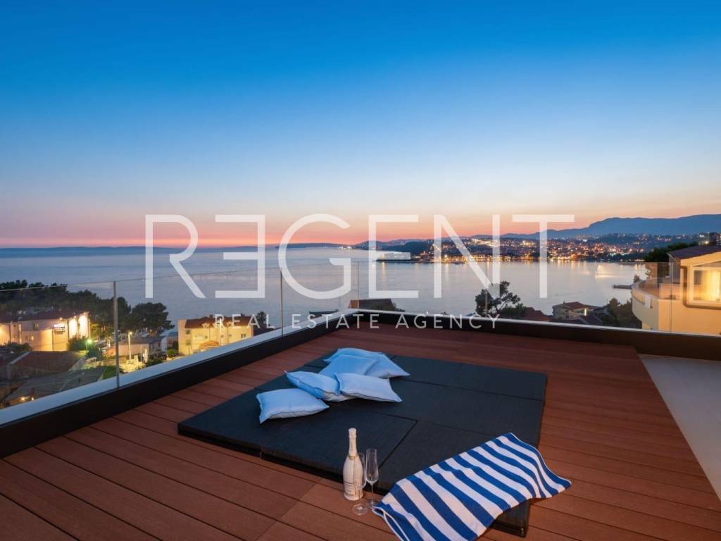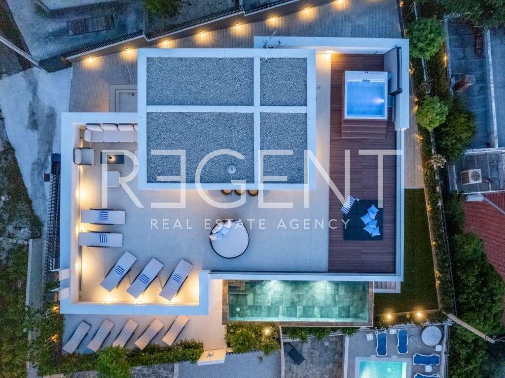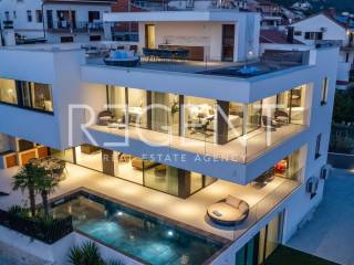 We mediate in the sale of a luxury villa located in a quiet private location near Split, in Podstrana with a beautiful sea view. The land area is 594 m2, the floor plan of the house is 175 m2, with 390 m2 of internal space, and 175 m2 of passable terrace. House description: BASEMENT 150 m2: – garage, studio, game room, toilet and bathroom, gym, tavern, storage room, laundry room. Internal stairs are through all floors. GROUND FLOOR 120 m2: – kitchen, living room, toilet, children's playroom. There is access to the terrace with a swimming pool and fireplace, on that part on the other side of the house there is parking for 1 vehicle. FIRST FLOOR 120 m2: – 4 bedrooms, each of which has its own toilet, the master room has its own bathroom and walk-in closet. SECOND FLOOR – access to a spacious terrace of 170 m2 with a jacuzzi, sauna and sunbathing area with an outdoor bar that offers an incredible view of the sea. The interior of the house is equipped with luxurious furniture, while the exterior consists of a beautifully decorated garden with a garden with a swimming pool, jacuzzi, sauna, sunbathing area and outdoor bar in front of which there is an exceptional view of the sea and islands.
