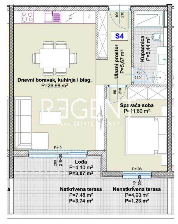 We mediate in the sale of a one-room apartment in a new building, which is located in an excellent location in beautiful Makarska. The apartment is located on the ground floor of the building, and contains an open space area of 26.98m2 which includes a living room, kitchen and dining room with access to a loggia of 3.08m2 and a covered terrace of 3.52m2, a bedroom of 11.60m2 with access to another covered terrace of 1.16m2, a bathroom of 5.44m2 and a hallway with an entrance area of 5.67m2. The equipment of the apartments meets the highest standards, including reinforced concrete construction with earthquake-resistant foundations, energy efficiency according to the highest standards and top-quality aluminum carpentry. The building is equipped with an elevator, while all windows and doors are made of high-quality PVC, equipped with thermal and sound insulation, which guarantees an energy-efficient and quiet environment. The bathrooms are equipped with sanitary equipment and 1st class tiles, which further emphasizes the luxurious impression of the space. Along with the apartment, it is possible to buy a garage parking space at a price of 1600 euros per m2, an outdoor parking space at a price of 10000 euros and a storage room at a price of 5000 euros. This apartment is an ideal investment for future tourist activities due to its proximity to beaches, the city square, schools, kindergartens and shops, as well as for a peaceful life for couples and families not far from the city. For all other inquiries, feel free to contact us!