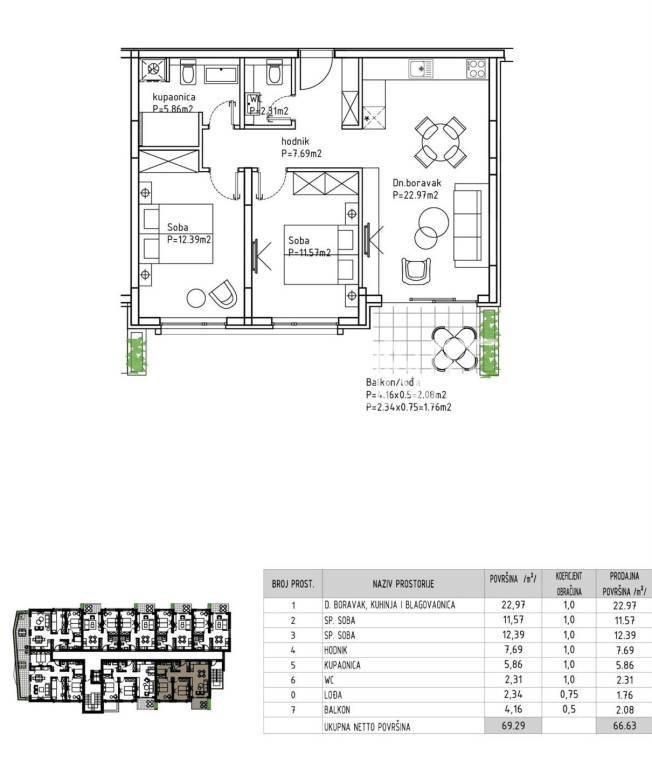 We are mediating the sale of a two-room apartment in a new building located in beautiful Makarska. The apartment is located in an excellent location, close to the sea, shops and all the necessary facilities for everyday life. The area of the apartment is 66.63 m2 and is located on the first floor of the building, and consists of a hallway with a total area of 7.69 m2, a bathroom with a total area of 5.86 m2, an additional toilet with a total area of 2.31 m2, two bedrooms with a total area of 12.39 m2, 11.57 m2, living room, kitchen with dining room with a total area of 22.97 m2 and a balcony with a total area of 2.09 m2. The apartment also has a garage parking space which is not included in the price. The price of a garage space on the first floor is 25,000 euros, while on the second floor it is 22,500 euros. Due to its orientation, this apartment is filled with natural light and offers the possibility of enjoying the Mediterranean sun on the spacious terrace. The apartment is fully air-conditioned, and the bathrooms are covered with underfloor heating, which provides additional comfort. This apartment is a perfect combination of comfort and aesthetics, providing you with a home where you will feel peaceful and comfortable, and due to its location, it is also ideal for tourist rental. Experience the picturesque atmosphere of Makarska from the comfort of this modern and practical space!