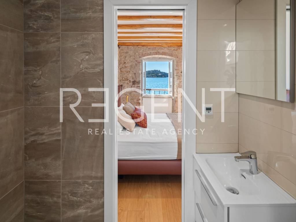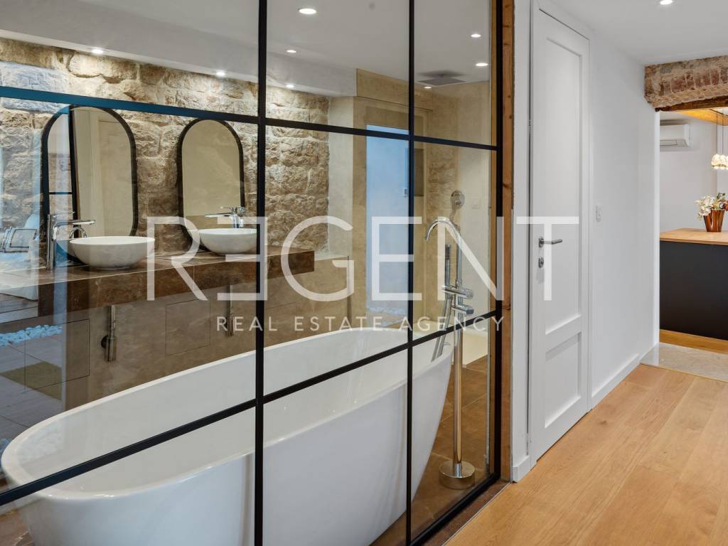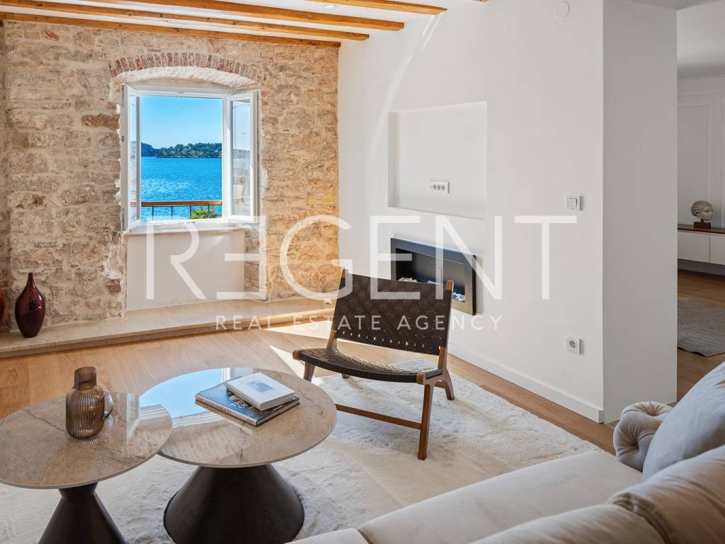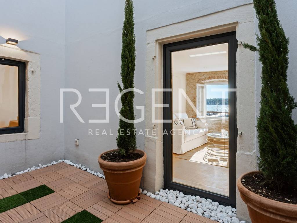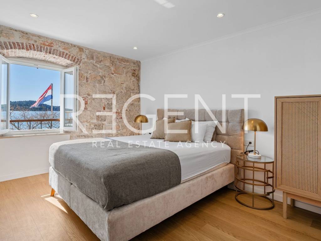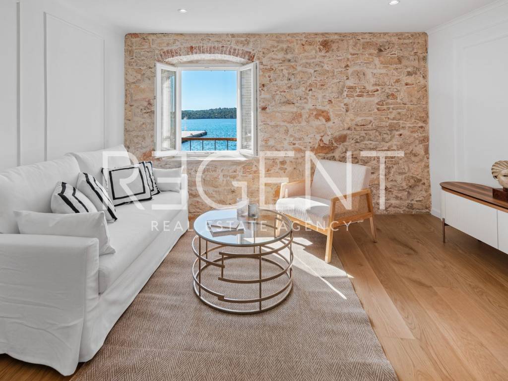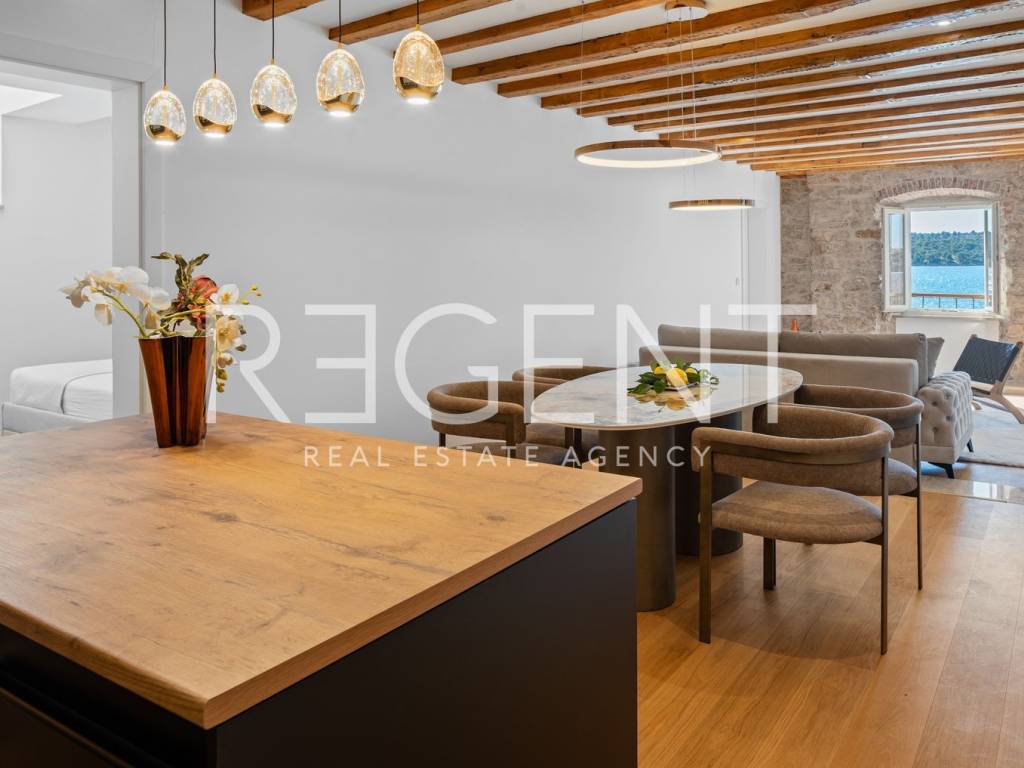 We are mediating the sale of a luxury apartment in an exclusive location in the heart of Sibenik. The apartment is located in the first row to the sea, close to all historical and cultural amenities, as well as those needed for everyday life. The view of the beautiful blue sea allows you to meet the sunset from the comfort of your own home. This beautiful apartment was completely renovated in 2022 and is located on the first floor of a stone house. It consists of three bedrooms, three bathrooms, a spacious living room, kitchen and dining room. What sets this property apart from others is the unique terrace that has access to all the rooms in the apartment, and gives the overall impression an extra touch of elegance, luxury and comfort. The interior design is decorated with a combination of wood and stone in bold earthy colors. The apartment is also characterized by an abundance of light that comes from the spacious terrace and leaves an impression of warmth and comfort. Due to its unique location, this apartment is an ideal investment for future tourist activities.