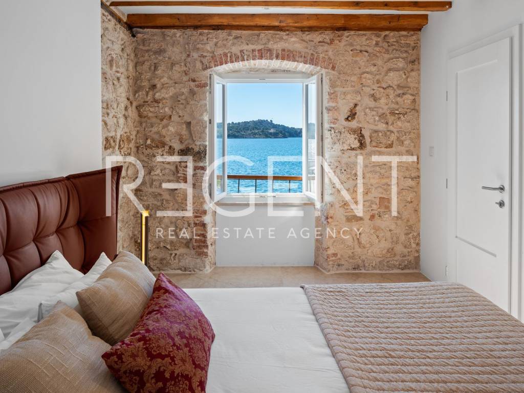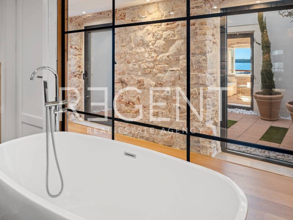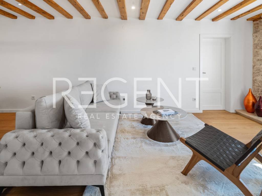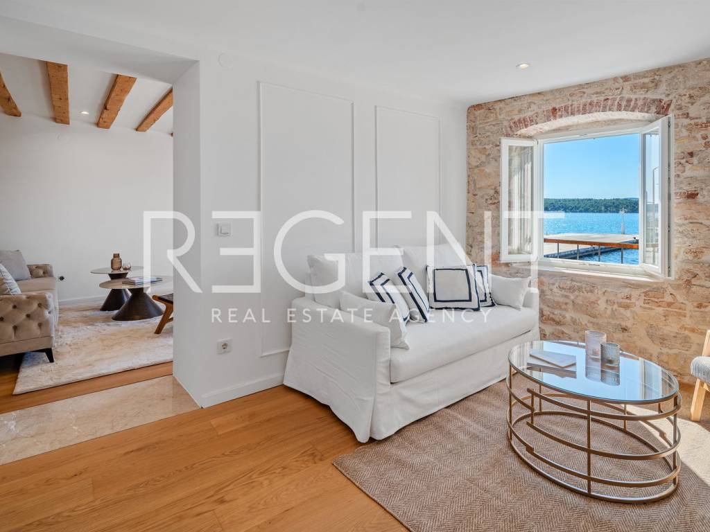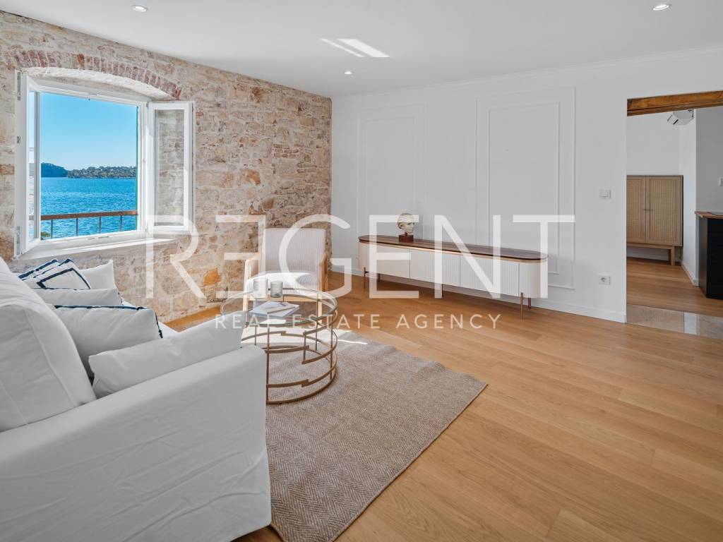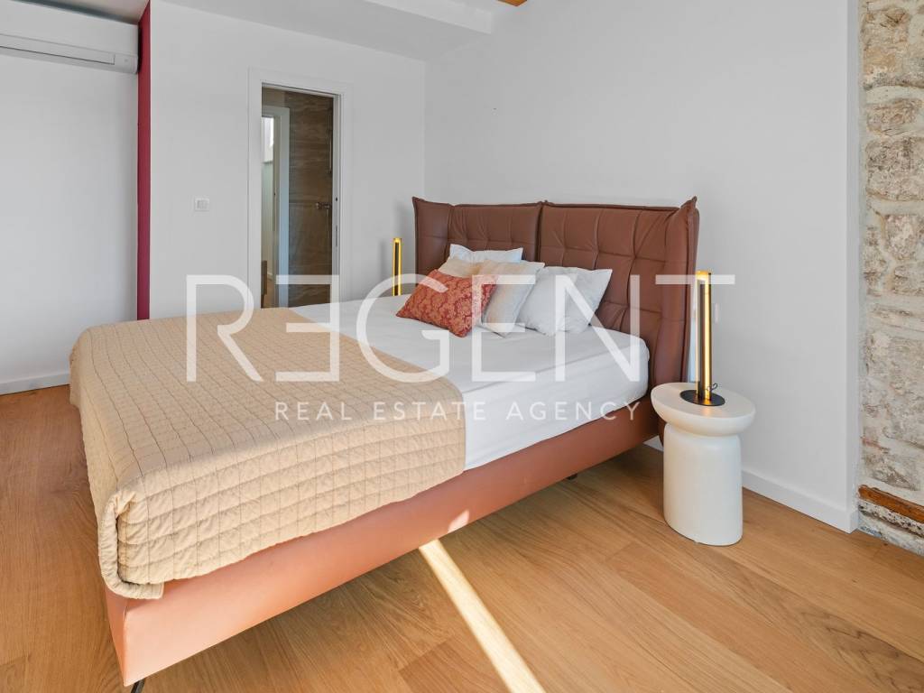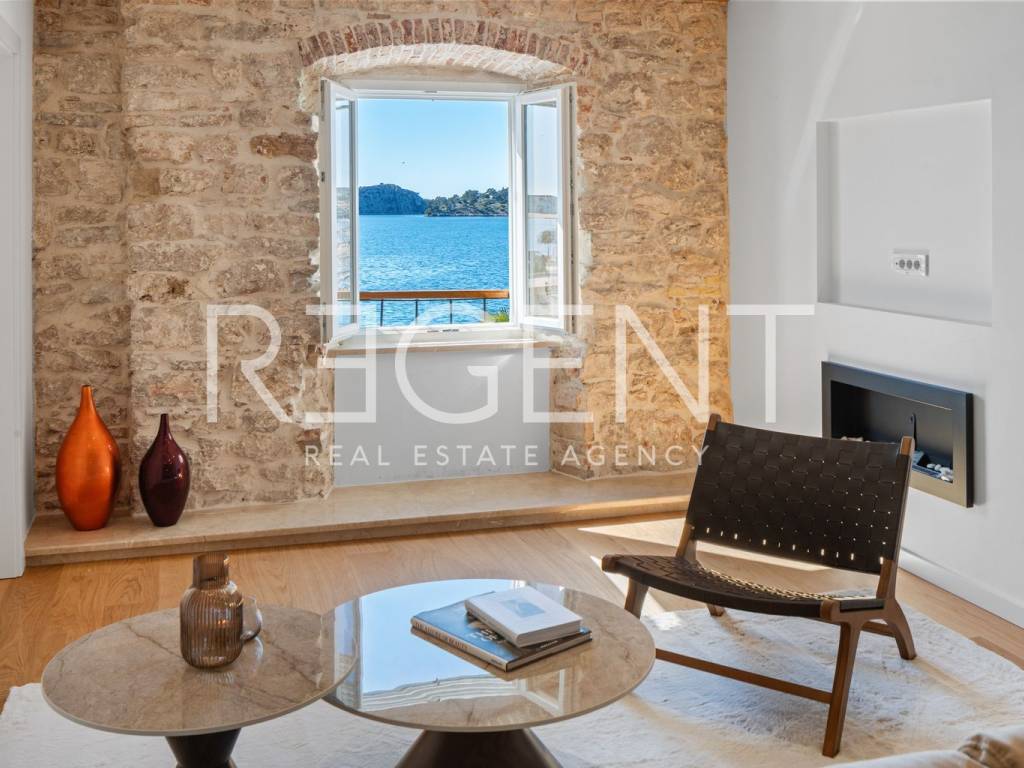 We are mediating the sale of a luxury apartment in an exclusive location in the heart of Sibenik. The apartment is located in the first row to the sea, close to all historical and cultural amenities, as well as those needed for everyday life. The view of the beautiful blue sea allows you to meet the sunset from the comfort of your own home. This beautiful apartment was completely renovated in 2022 and is located on the first floor of a stone house. It consists of three bedrooms, three bathrooms, a spacious living room, kitchen and dining room. What sets this property apart from others is the unique terrace that has access to all the rooms in the apartment, and gives the overall impression an extra touch of elegance, luxury and comfort. The interior design is decorated with a combination of wood and stone in bold earthy colors. The apartment is also characterized by an abundance of light that comes from the spacious terrace and leaves an impression of warmth and comfort. Due to its unique location, this apartment is an ideal investment for future tourist activities.