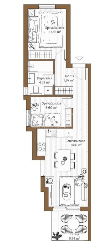 In a new building located between Kaštel Lukšić and Kaštel Kambelovac, in a quiet residential area below the main road, there is a two-room apartment with an open sea view. The apartment has a total net area of 51.32 m² and a covered terrace of 5.94 m² which is connected to the living area. The layout of the apartment is practical and includes a hallway, two bedrooms, a bathroom and an open space kitchen, dining room and living room with access to the terrace. Thanks to its orientation and terrace, the apartment has plenty of natural light and outdoor space for everyday living. The apartment will be equipped with high-quality PVC windows, anti-burglary entrance doors and air conditioning. The floor coverings will be made of a combination of ceramics and parquet. Nearby are a school, kindergarten, shops, ballet school, winery and public transport, and the sea and promenade can be reached in a few minutes' drive. The location is suitable for everyday life, but also for investment in rent. The start of construction is planned for September 2025, and the completion of the works is scheduled for the end of 2026. Payment can be agreed in phases, according to the dynamics of construction. It is also possible to buy through a loan with a minimum of 40% own participation. For more information or to arrange a viewing, feel free to contact us.