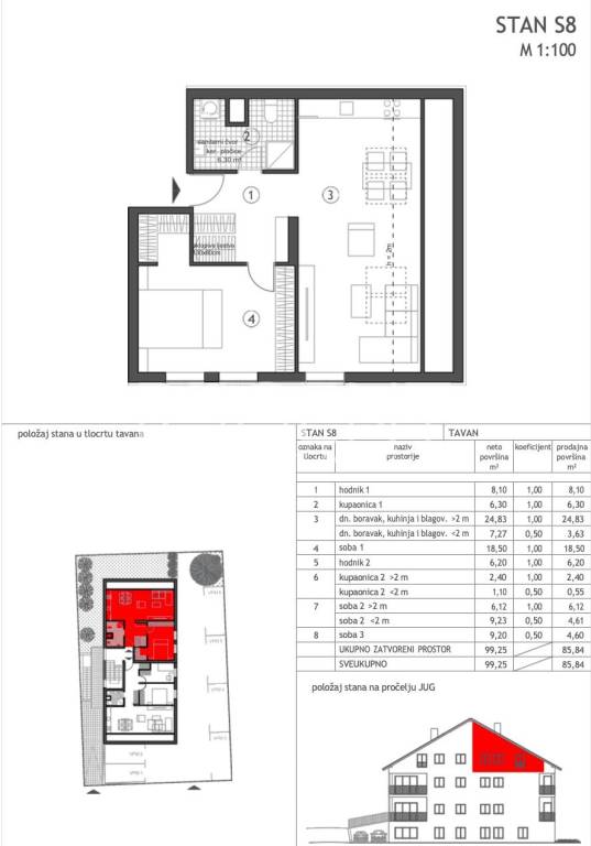 For sale is a four-room apartment with a gallery of 85.84 m² in Sesvete, located on the third floor of a residential building, only a 20-minute drive from the center of Zagreb. The apartment has a functional layout and is ideal for everyday life. It consists of a hallway, bathroom, bedroom, open space kitchen, dining room and living room and a gallery that has a total of 25 m2, of which 5 m2 is below 2 meters of ceiling height. A bathroom is designed on the gallery and two bedrooms are defined in the floor plan. Possibility of buying a parking space at a price of €20,000. The location of the apartment is very practical, with easily accessible facilities such as shops, school, kindergarten and public transport.  For additional information or to arrange a viewing, feel free to contact us!