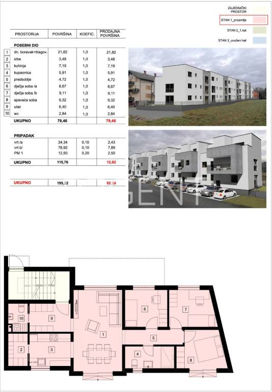 In a quiet part of Sesvete, there is a four-room apartment on the ground floor of a modern new building, perfect for family life. The project consists of three smaller buildings with a harmonious design, each with three apartments - on the ground floor, on the first floor and on the recessed floor - which guarantees peace, privacy and a pleasant neighborhood. The apartment has a total net area of ​​92.28 m², and a living area of ​​79.46 m². It consists of a spacious living room with a kitchen and dining room, three bedrooms, a bathroom, a separate toilet, an entrance area, a hallway and a pantry. From the living area, there is an exit to the garden which provides privacy and an ideal space for rest or play for children. The building is built according to modern construction standards and is located in a quiet street, excellently connected to the rest of the city. In the immediate vicinity there are a school, a kindergarten, shops and public transport, which further contributes to the quality of everyday life. The price is 3,400 EUR/m², including VAT and an outdoor parking space. For more information, feel free to contact us.
