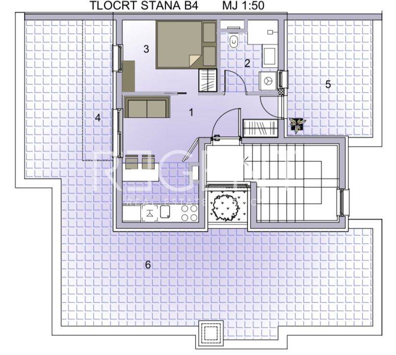 Exclusive penthouse located on the top floor of a modern new building, perfect for those who want to enjoy privacy, comfort and a view. Apartment B4 has a living area of 41 m² and consists of a living room with kitchen and dining area, one bedroom and a bathroom. The special feature of this unit is a terrace of 61 m² which extends the living space and provides an ideal place for rest, socializing and enjoying the outdoors with a partial sea view. The apartment also comes with its own parking space and storage room within the building. The apartment is equipped with quality PVC joinery, ceramic floors and air conditioning, and due to its position and terrace, it is ideal as a second home, a luxury apartment or a tourist investment. Completion of construction is expected within 12 to 14 months, and move-in is possible immediately after the completion of works. For more information or to arrange a viewing, feel free to contact us.