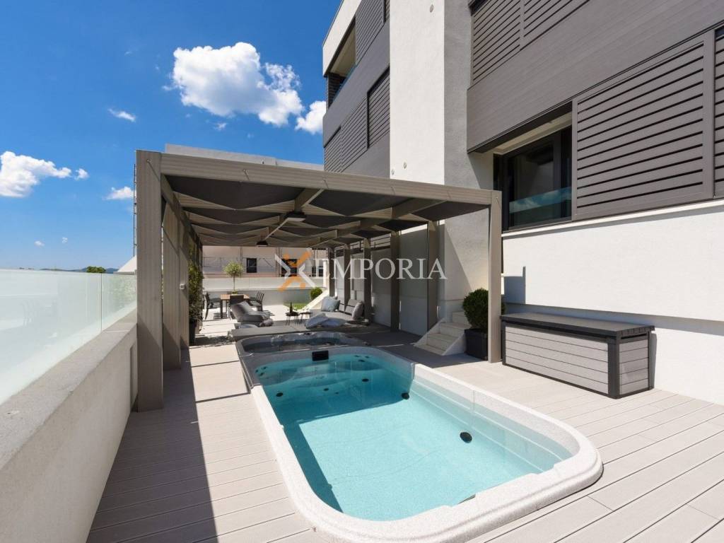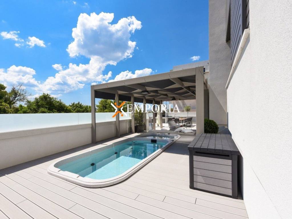 This modernly decorated apartment is located in the attractive Borik district of Zadar, only 470 m from the sea and 2,2 km from the city center. Situated on the ground floor of a quality building, the apartment offers a functional layout, a private garden of 50,15 m², a pool and a jacuzzi covered by a pergola, which creates an ideal space for relaxation and spending time outdoors.The layout consists of a hallway, two bedrooms – each with its own bathroom – an additional WC, a kitchen with dining area and a living room, and a loggia. The net usable area is 65,94 m², while the total net area including accessory parts is 83,01 m². The apartment also includes two outdoor parking spaces and a 5,33 m² storage room.The buyer does not pay real estate transfer tax.