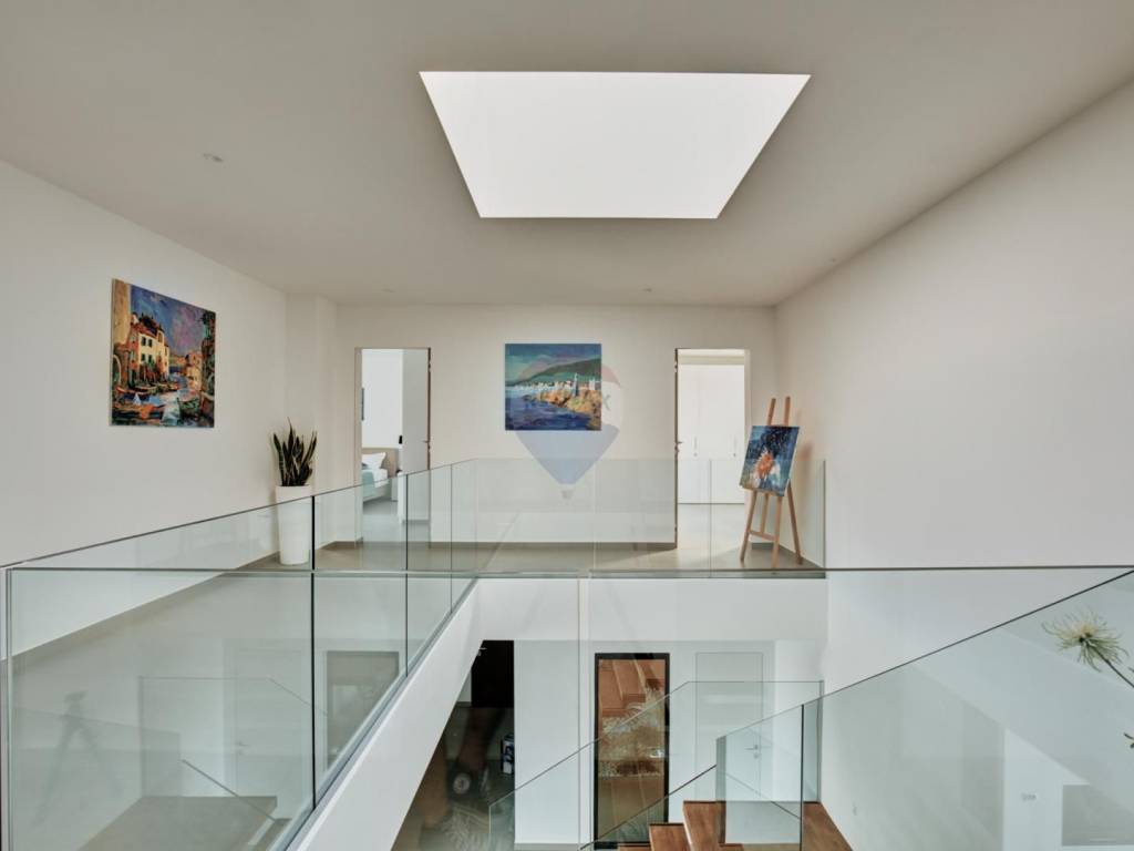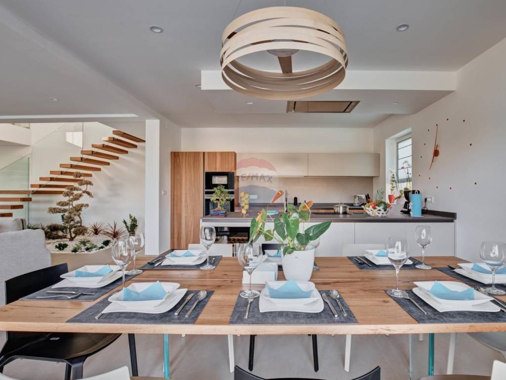On the ground floor of the villa there is a kitchen with dining room, living room, fireplace that provides additional atmosphere, bathroom, playroom, wellness and storage. The internal floating stairs under which there is a beautifully landscaped garden, we come to the second floor of the villa where there are four bedrooms with private bathrooms and balconies and a laundry room.