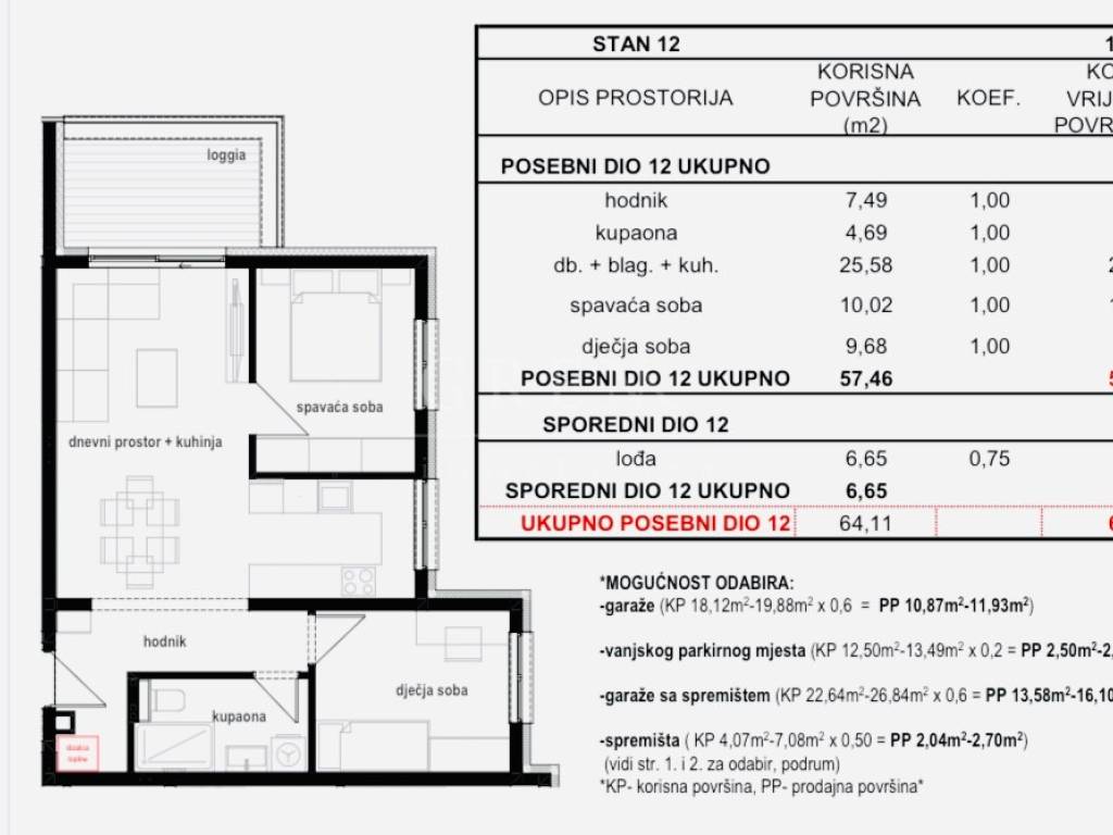 TROSOBAN STAN 12, 1 KAT – SESVETE (62,45m2 lođa,(garaža+ostava nisu uračunati u cijenu stana))