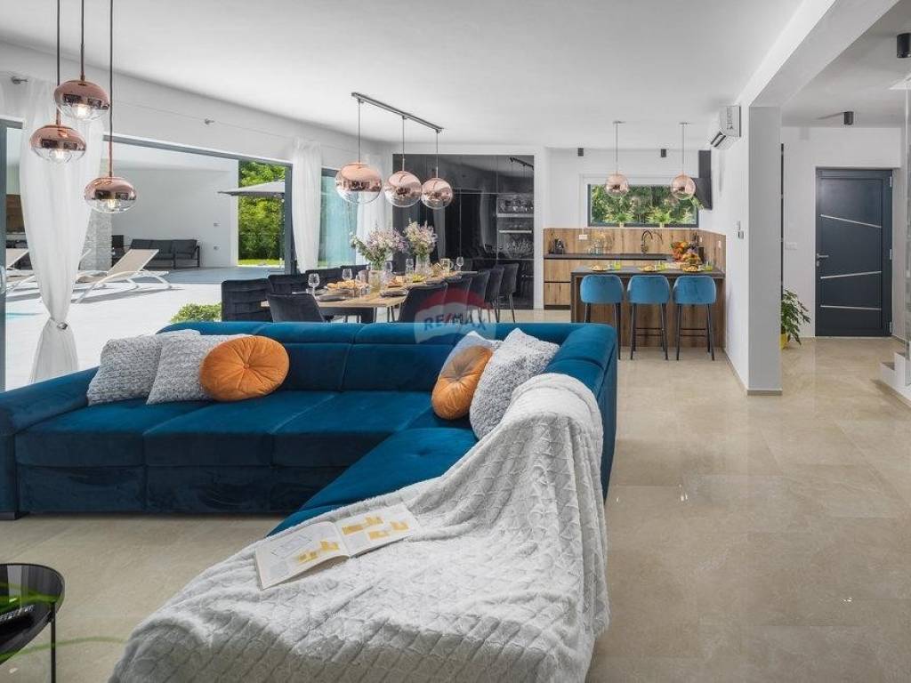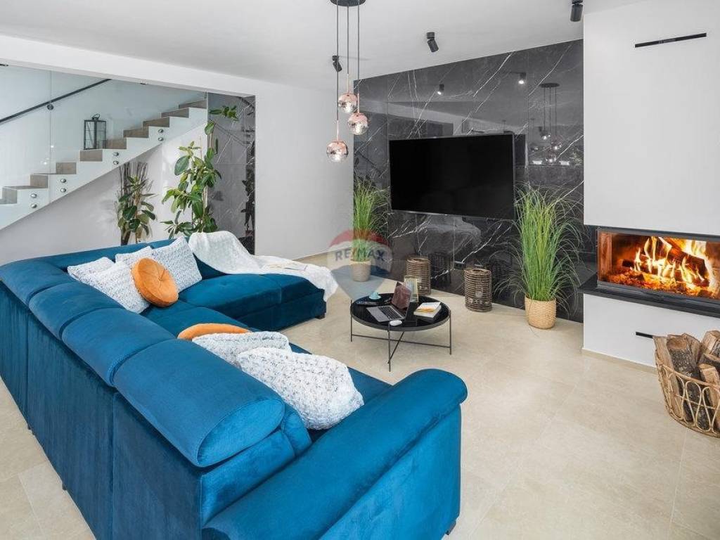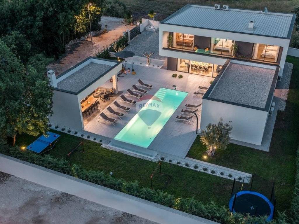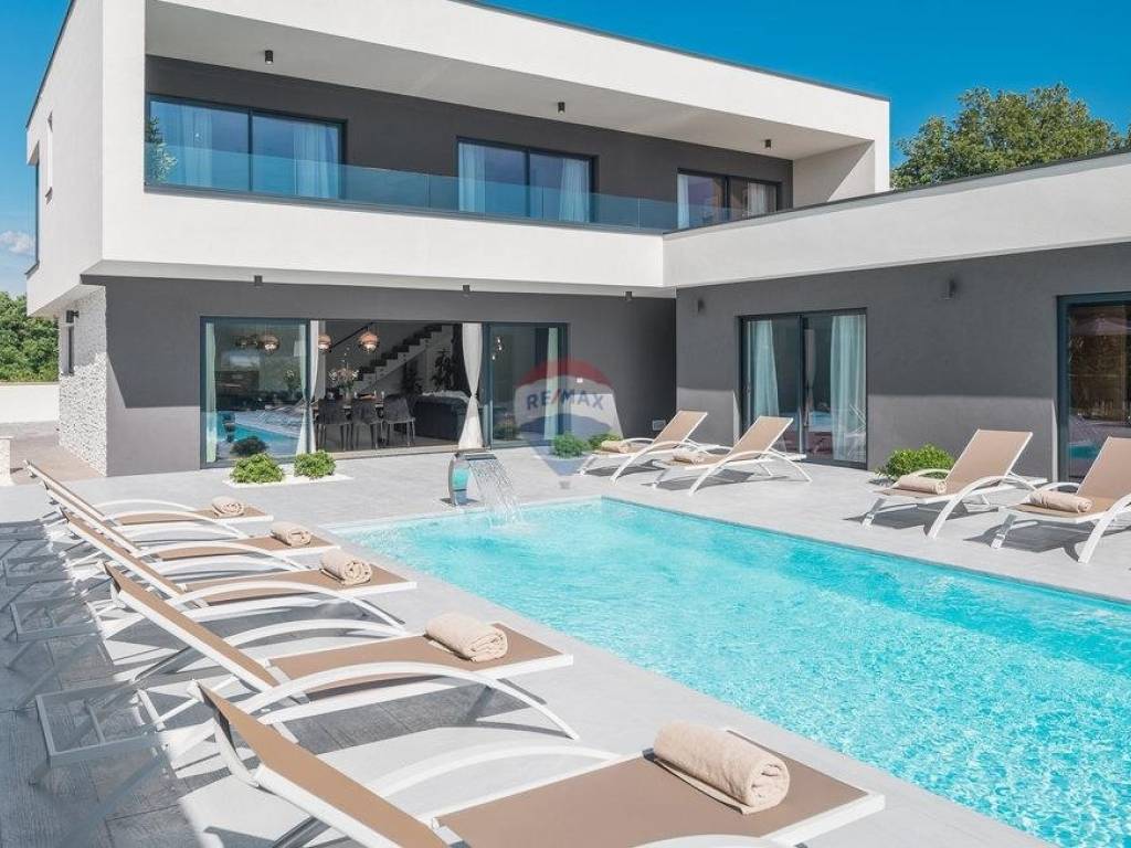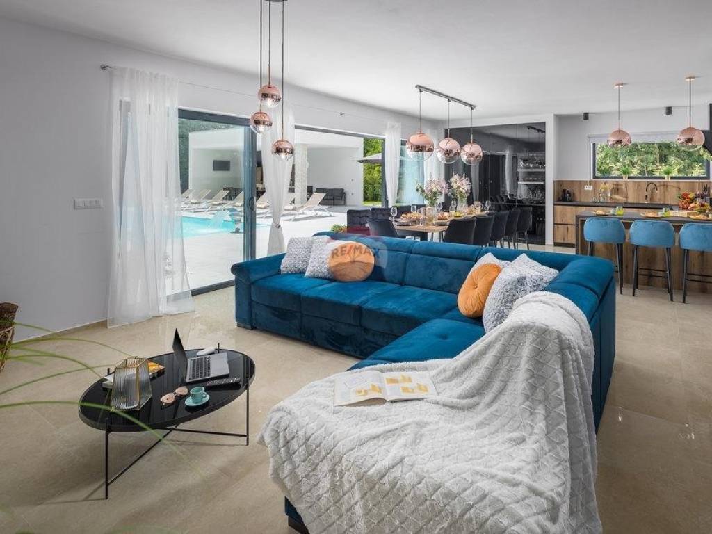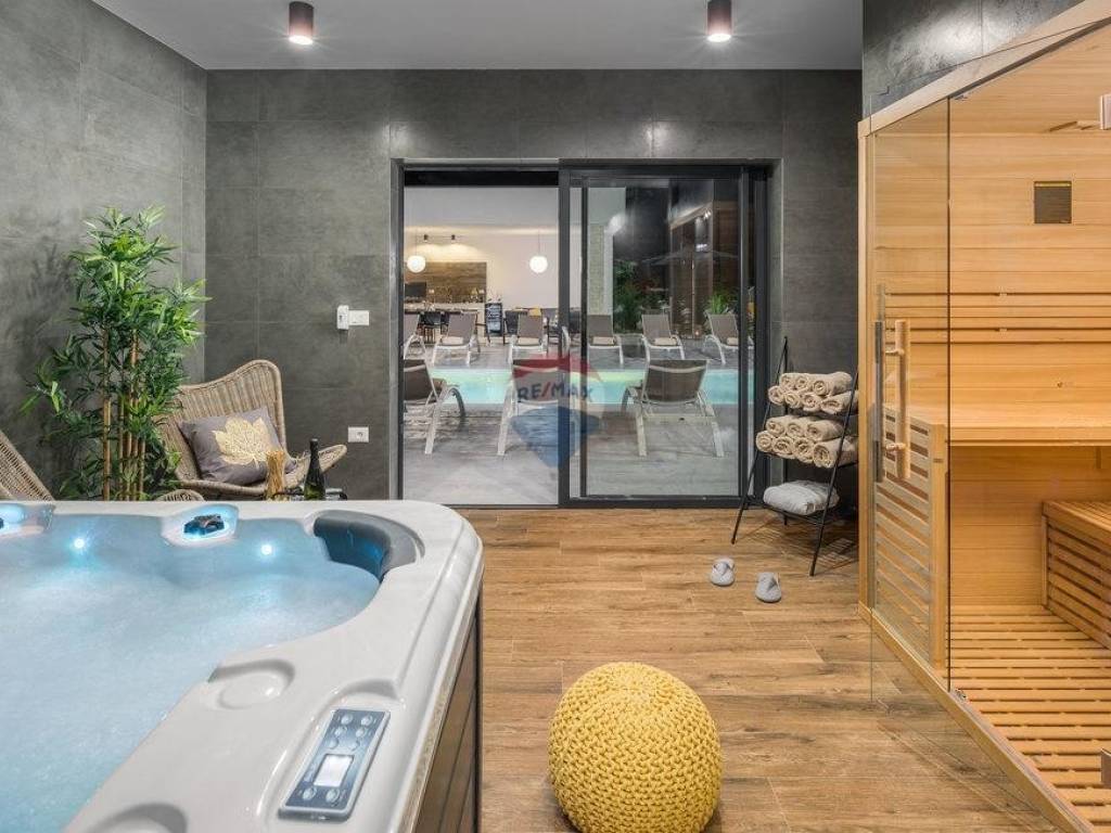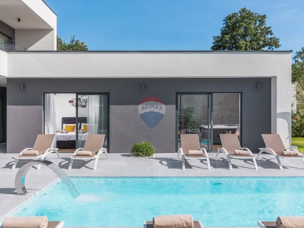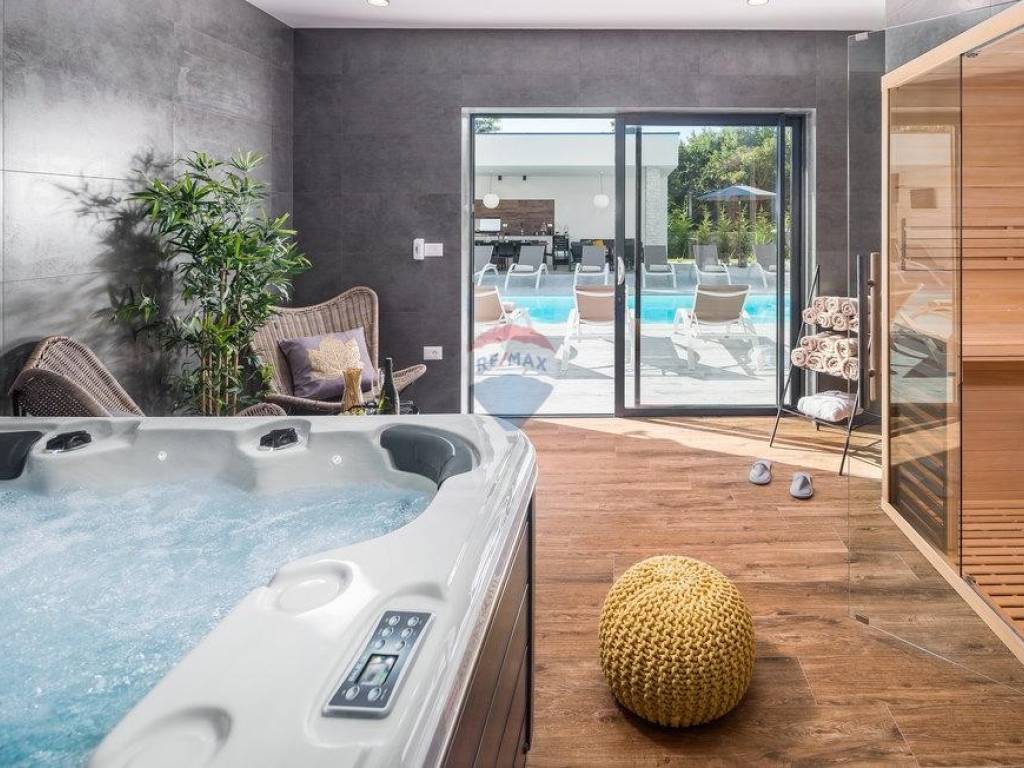 For sale: a modern luxury villa built in 2021, located in a quiet part of Istria. The property offers 307 m² of living space, five bedrooms each with an en-suite bathroom, a wellness area with sauna and whirlpool, and a spacious kitchen and living room with a fireplace.