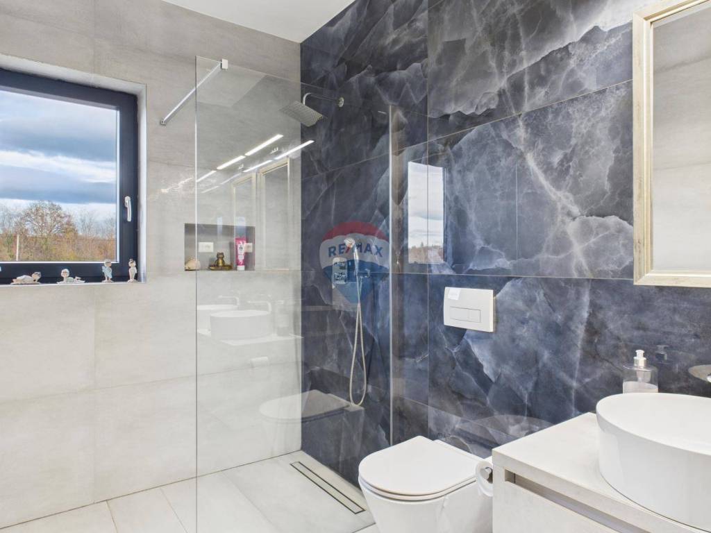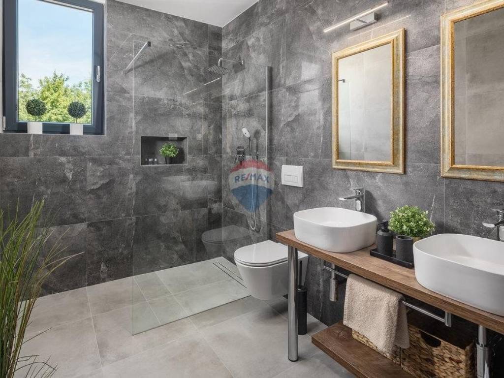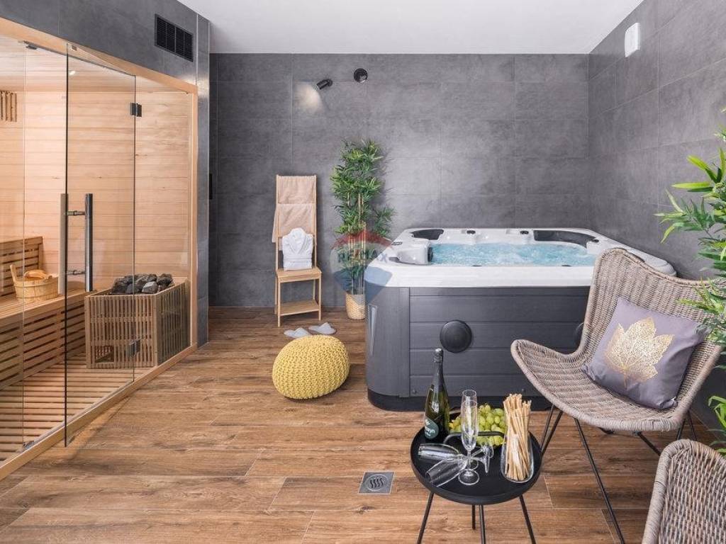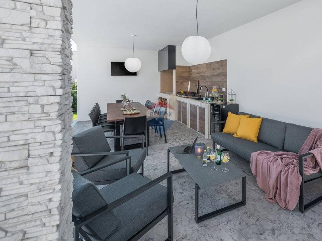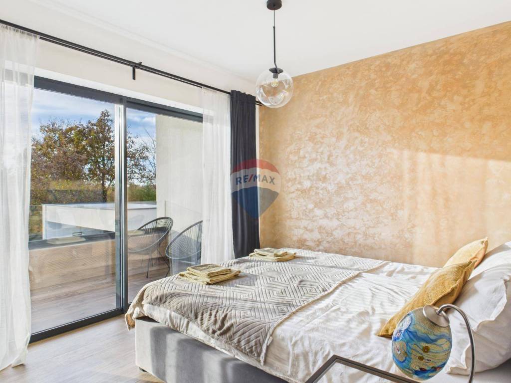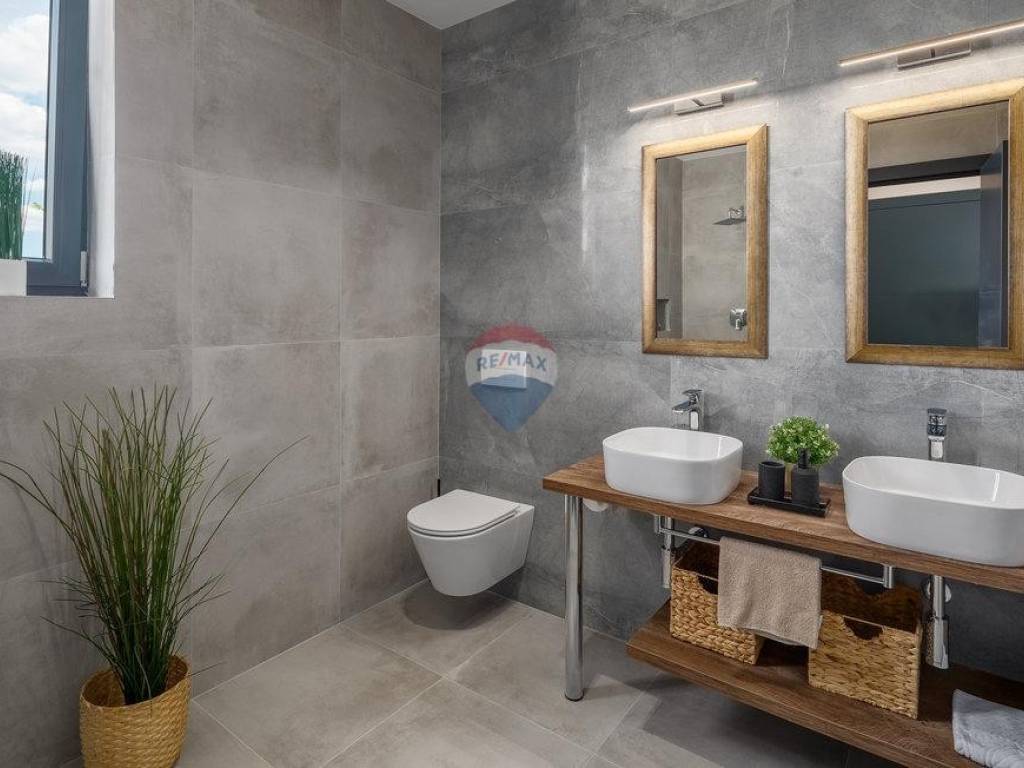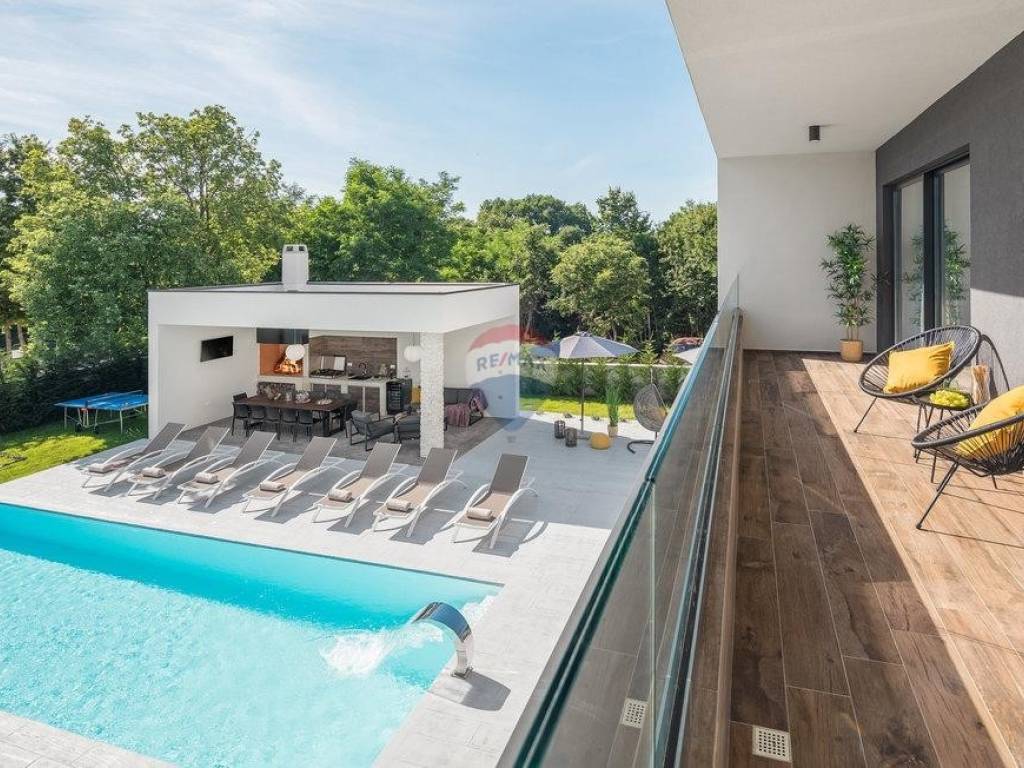 For sale: a modern luxury villa built in 2021, located in a quiet part of Istria. The property offers 307 m² of living space, five bedrooms each with an en-suite bathroom, a wellness area with sauna and whirlpool, and a spacious kitchen and living room with a fireplace.