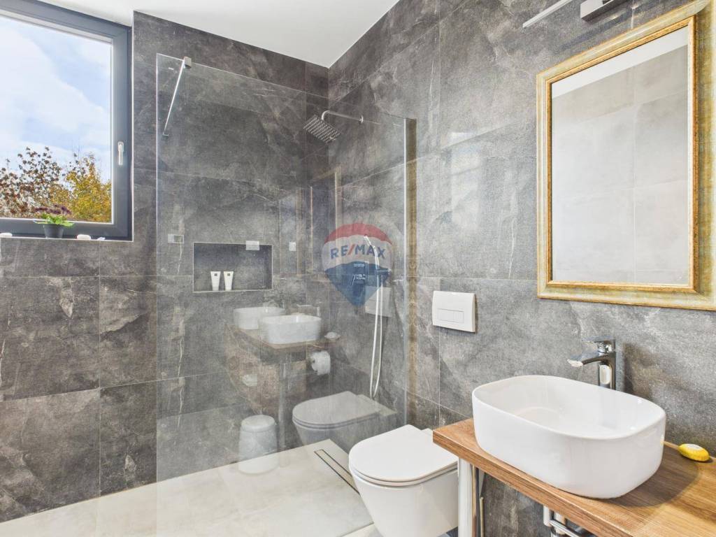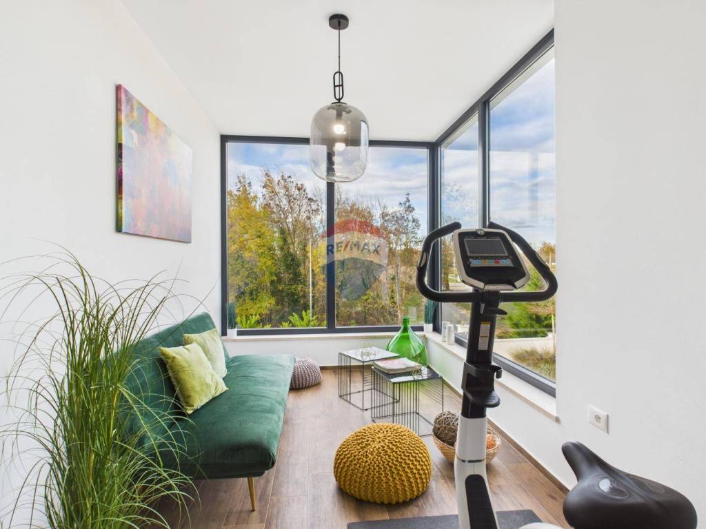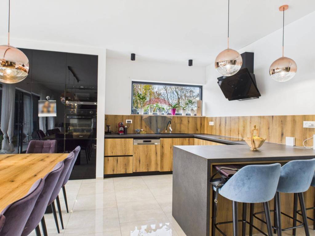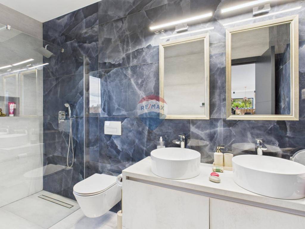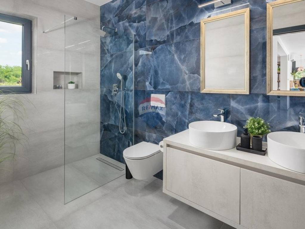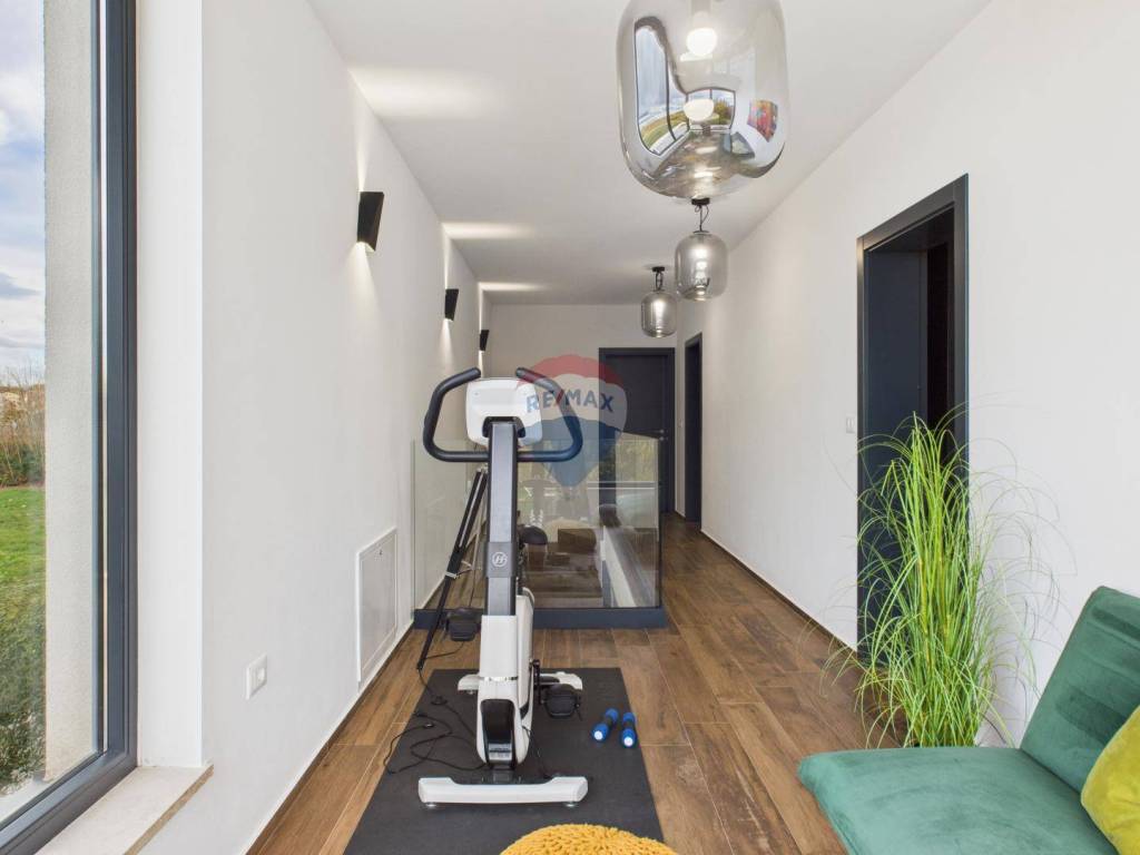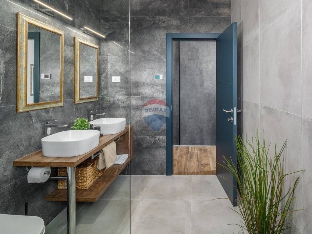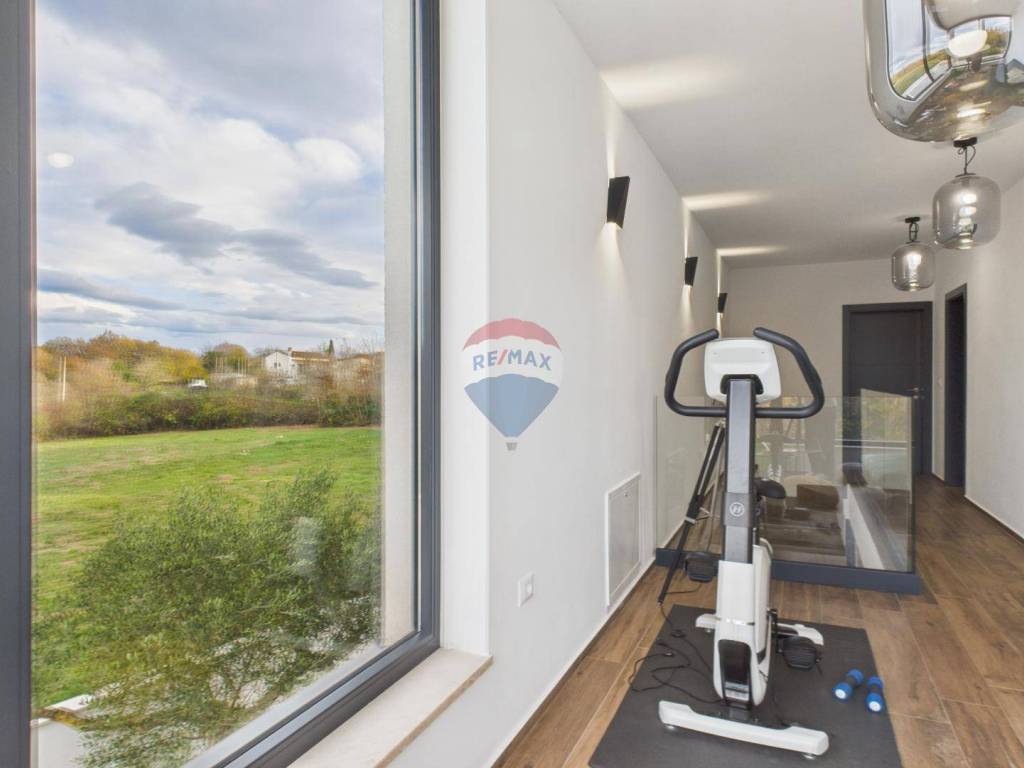 For sale: a modern luxury villa built in 2021, located in a quiet part of Istria. The property offers 307 m² of living space, five bedrooms each with an en-suite bathroom, a wellness area with sauna and whirlpool, and a spacious kitchen and living room with a fireplace.