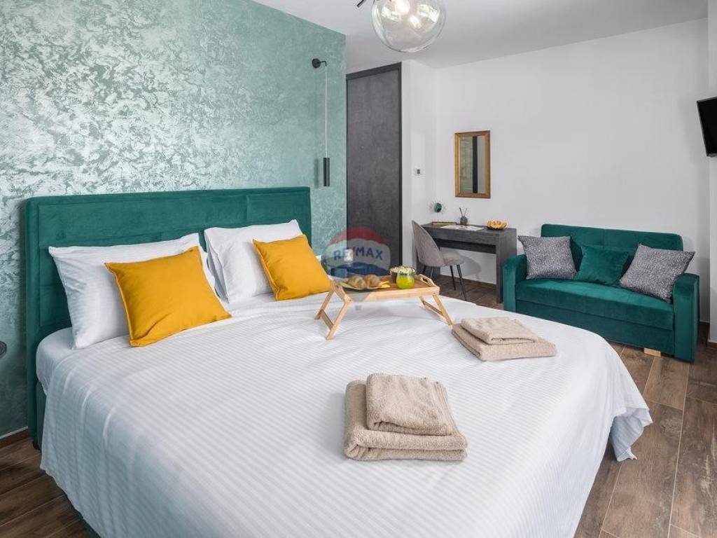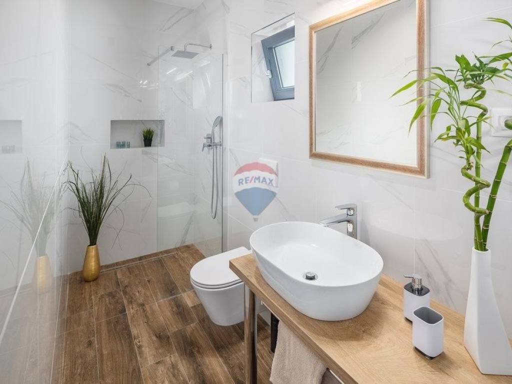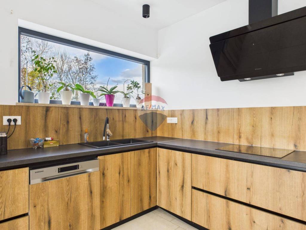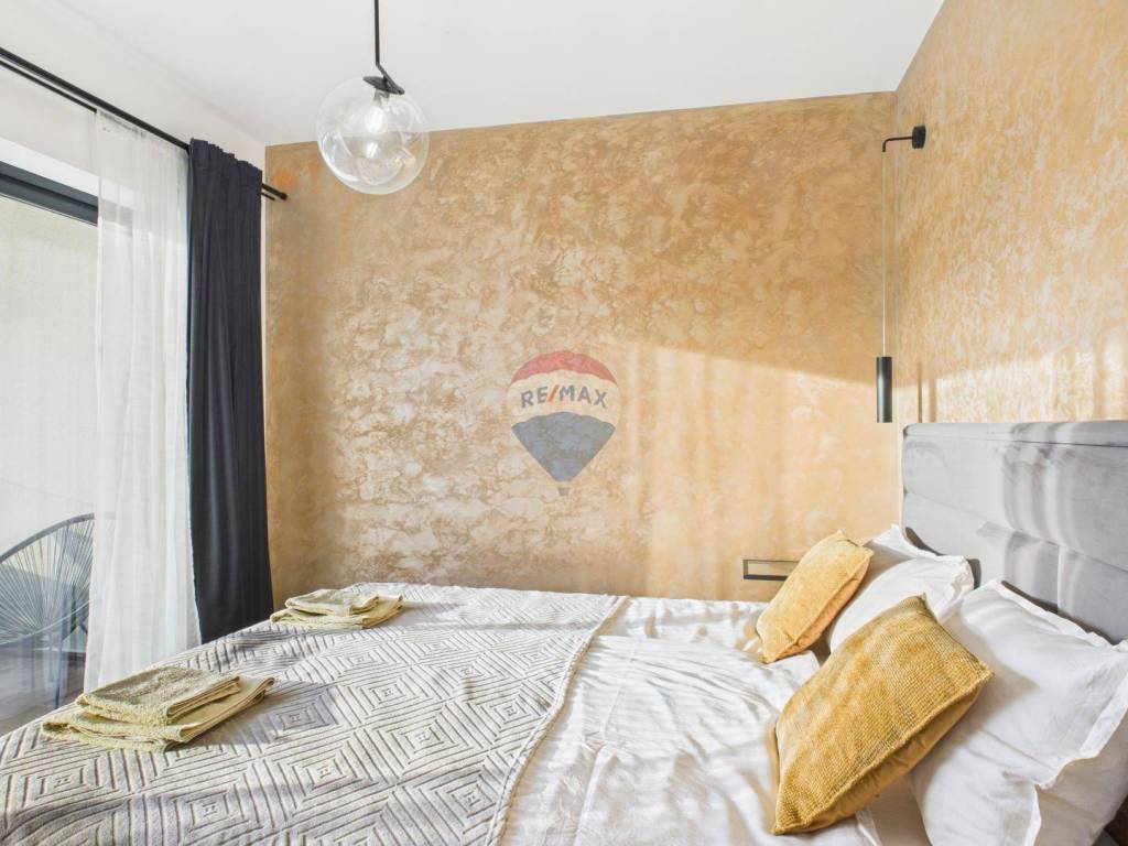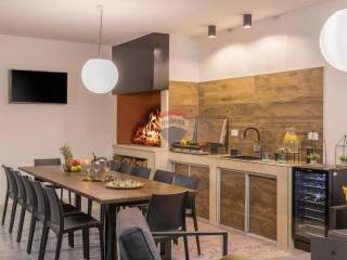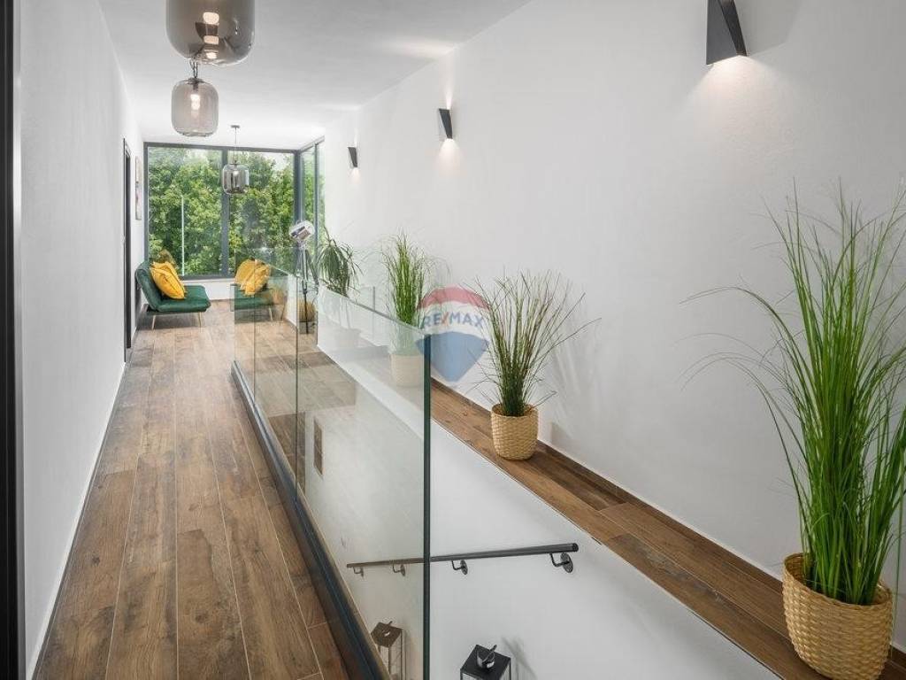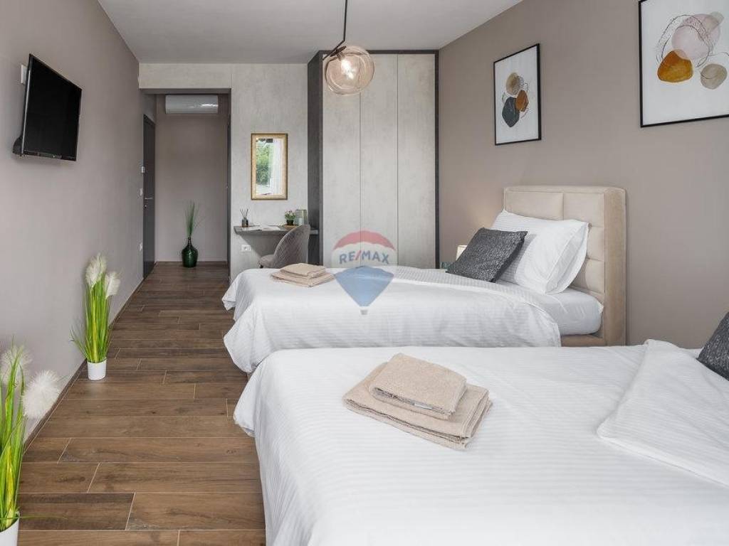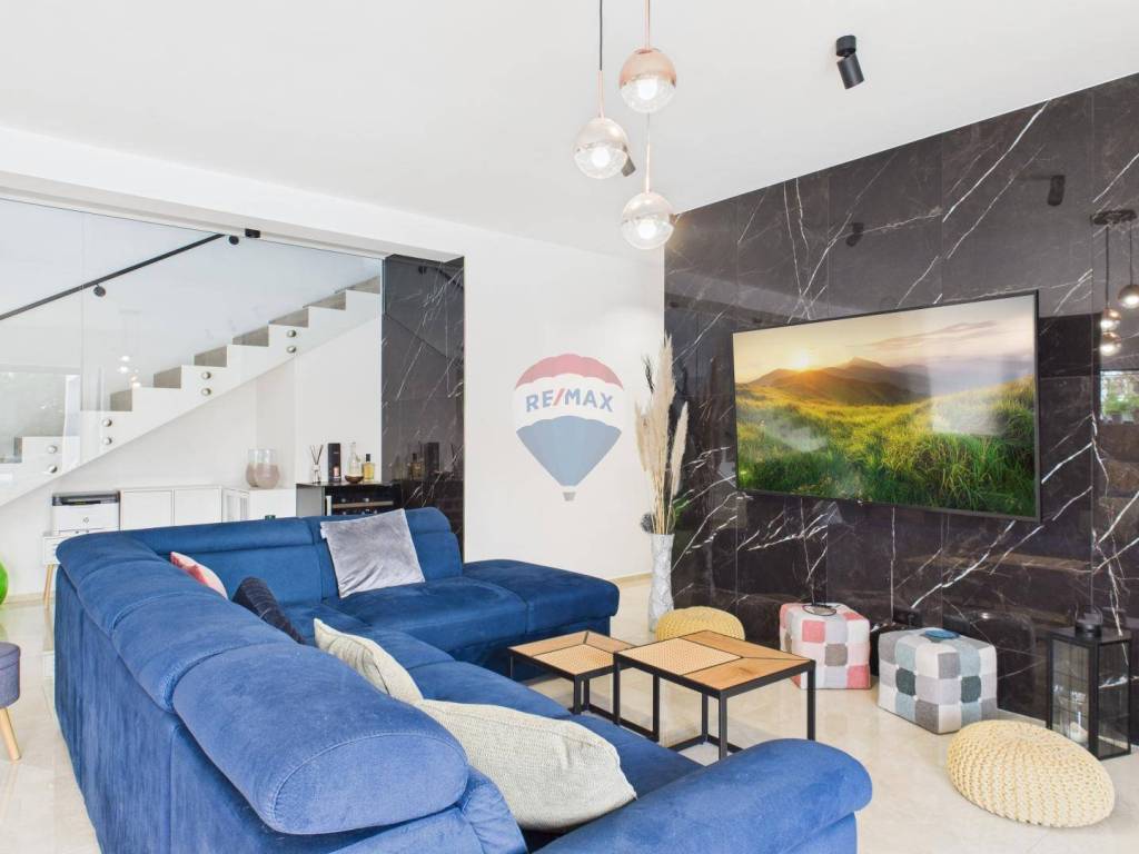 For sale: a modern luxury villa built in 2021, located in a quiet part of Istria. The property offers 307 m² of living space, five bedrooms each with an en-suite bathroom, a wellness area with sauna and whirlpool, and a spacious kitchen and living room with a fireplace.