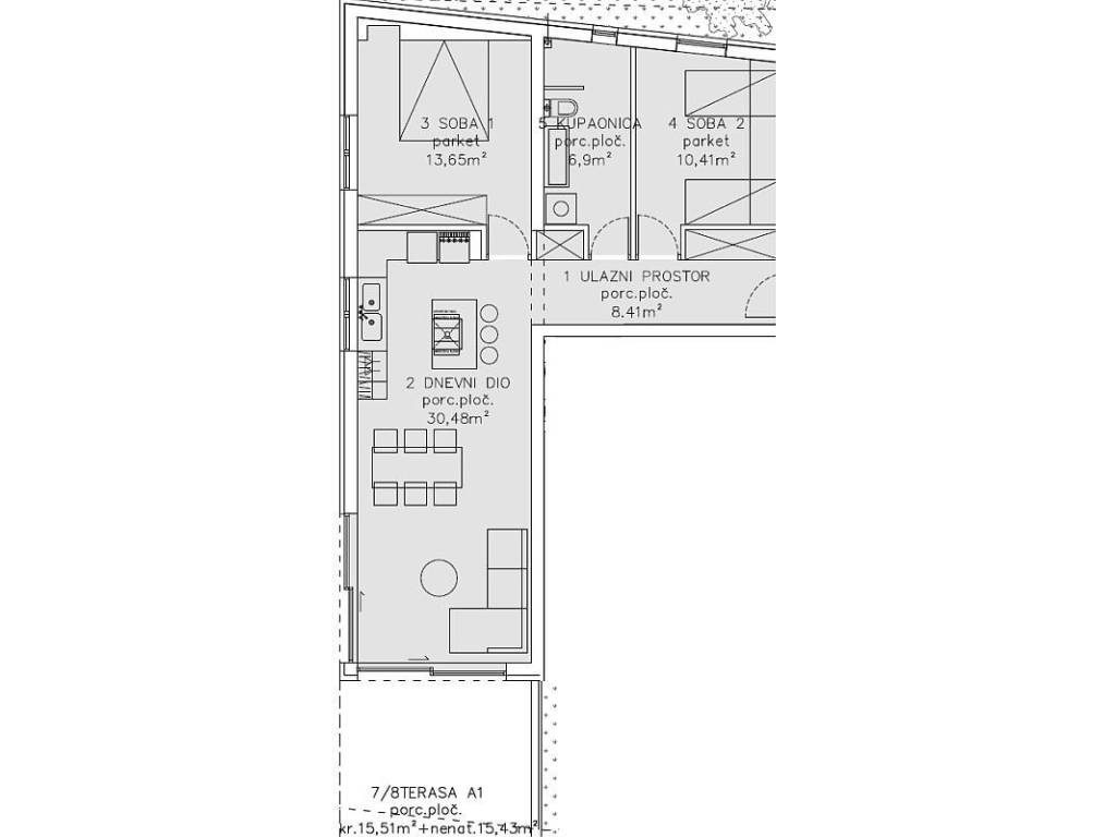A beautiful modern apartment for sale, in an attractive location, with a view of the sea. The apartment is located on the ground floor of a newly built building. The apartment has a total living area of almost 72m2 and about 12m2 of outdoor space through a covered and uncovered terrace. It consists of a hallway, two spacious bedrooms, a bathroom and a toilet, and a large open-concept living room that combines the kitchen, dining room and living room. This room leads to a large terrace with a magnificent view of the sea. The price of the apartment includes a storage room and a garage parking space. Only the highest quality materials were used in the construction of the apartment. Motorized roller shutters were installed on the shutters and mosquito nets were installed on all windows. Electric underfloor heating was installed throughout the entire apartment, except under the furniture. This apartment is an excellent investment, whether for tourist rental or for a family vacation.
