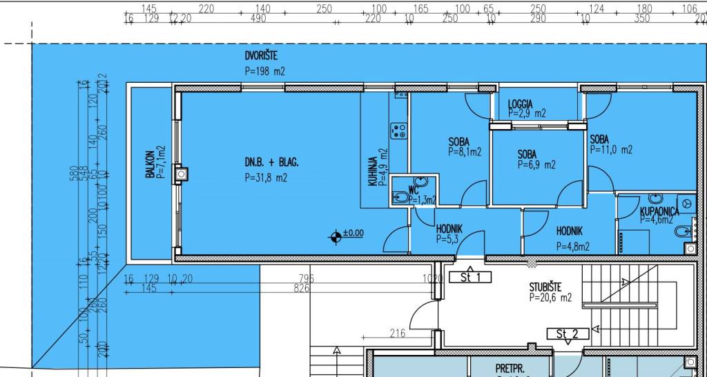 Zagreb, Jarun, prekrasan četverosoban stan smješten u visokom prizemlju kvalitetne novogradnje s uporabnom dozvolom.Stan A1 zatvorene površine 78,7 m2 sastoji se od ulaznog hodnika, prostranog dnevnog boravka s kuhinjom i blagovaonicom te izlazom na balkon površine 7,10 m2 (3,55), dvorište površine 198 m2 (19,80), tri spavaće sobe od kojih jedna izlazi na loggiu površine 2,9 m2 (2,18) i kupaonice. Ukupno obračunski NKP 104,23 m2. Mogućnost kupnje garažnog parkirnog mjesta i spremišta.Za ovu novogradnju zaslužan je investitor s dugom tradicijom i bogatim iskustvom u građevinarstvu.Vrhunska gradnja, etažno plinsko podno grijanje, Weitzer Parkett debljine 11 mm, keramika I klase, PVC stolarija s troslojnim staklima, Samsung klima, električne rolete, kupaonski radijator, portafon.Lokacija je idealna za obitelj s djecom zbog blizine škola, vrtića i rekreativnih sadržaja, te pruža dobru prometnu povezanost s ostalim dijelovima grada. Tramvajska stanica na Horvaćanskoj cesti udaljena je otprilike 10 minuta hoda, autobusna stanica smještena je na Jarunskoj cesti 5 minuta hoda, Jarunski park i jezero Jarun, popularna rekreacijska zona udaljena je otprilike 20 minuta hoda.Kupac ne plaća porez na promet nekretnina.Za sve ostale upite stojimo vam na raspolaganju.