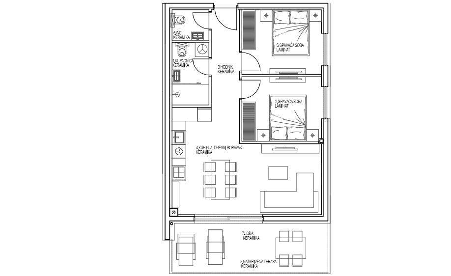 A modern ground floor apartment with a garden is for sale, located in a quiet location in Primošten. Apartment S4 covers an area of ​​72.86 m² and offers two spacious bedrooms, an elegant bathroom, an additional toilet and a spacious and bright living room with a kitchen. The living area provides access to a 12.60 m² terrace and an 80.20 m² garden, ideal for enjoying the outdoors. The apartment also comes with an outdoor parking space.
