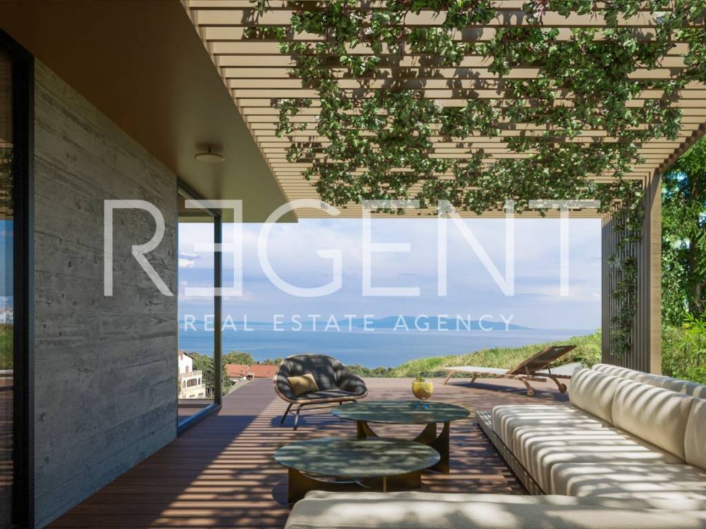 In a quiet settlement, 10 minutes from Opatija and 15 minutes from the center of Rijeka, in a luxury residential complex, there is a four-room apartment on the ground floor with a total area of ​​168 m2. It consists of a large living room, dining room and kitchen, hallway, toilet, laundry room and pantry in the western part of the apartment. The living room is separated from the outside by a large corner glass wall with sills at floor level on a lift-and-slide opening system. When the glass wall is open, you get a unique space that combines the living room and dining room with a spacious outdoor terrace where there is space for a dining table, lounge set and jacuzzi. The pergola covers a total of 49 m2 of terrace. On the eastern part of the apartment there are three bedrooms, two bathrooms, one of which is a master bedroom with a spacious bathroom with a bathtub, a walk-in closet and access to a large terrace. Each room has access to the terrace. The apartment is heated and cooled by a heat pump. Heating is provided by an underfloor heating system that is located in all rooms, and ceiling and wall fan convectors for cooling. The apartment has its own video surveillance and video intercom. The area of ​​the closed space is 134 m2. The total area of ​​the apartment with accessories is 168 m2. For all other information, feel free to contact us!