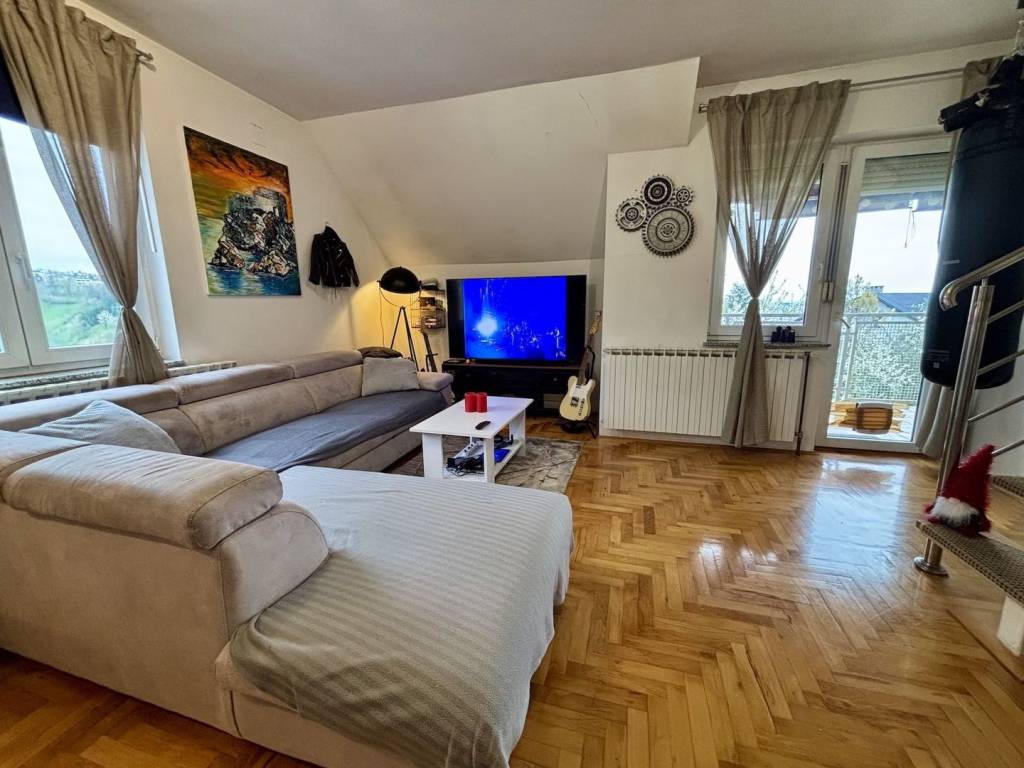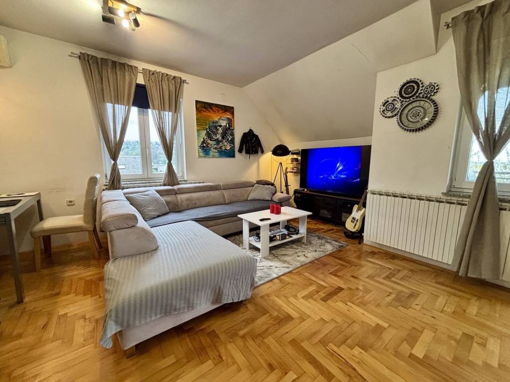 The apartment consists of an open space concept living room connected to the kitchen and dining area, from which you exit onto a beautiful balcony surrounded by greenery, which is quite rare in Zagreb; then 2 bedrooms + a large bedroom in the attic with two large beds; a bathroom with a toilet that was newly renovated 2 years ago; and a storage room in the building’s basement of approx. 3 m².