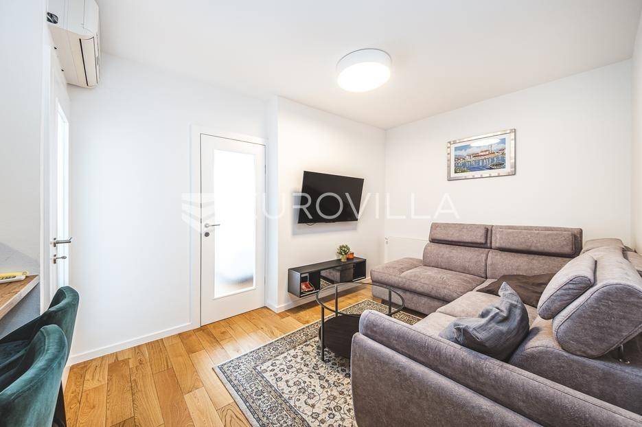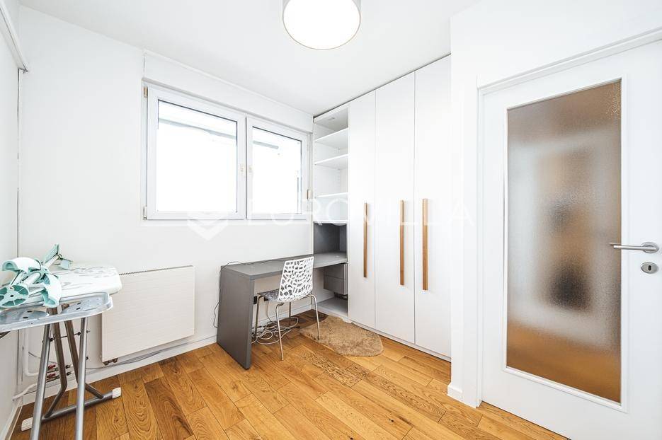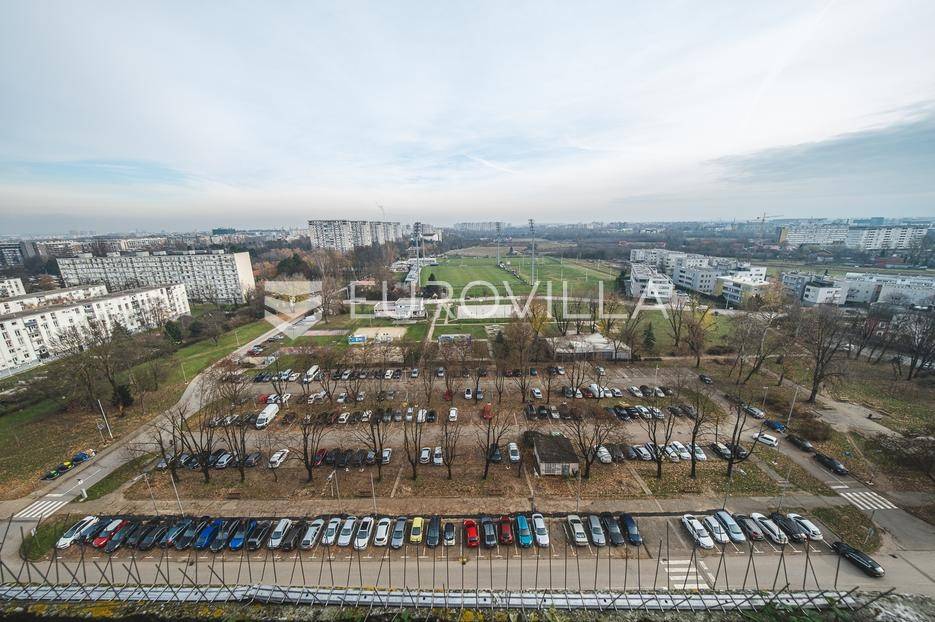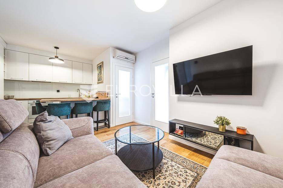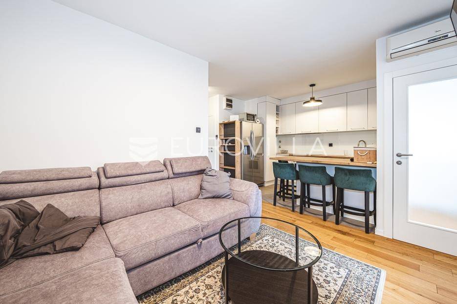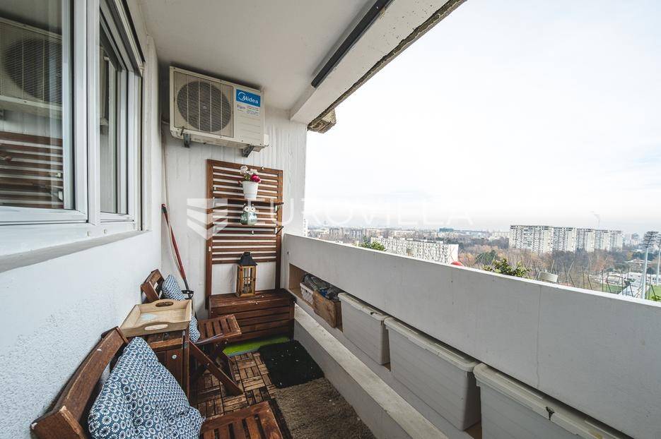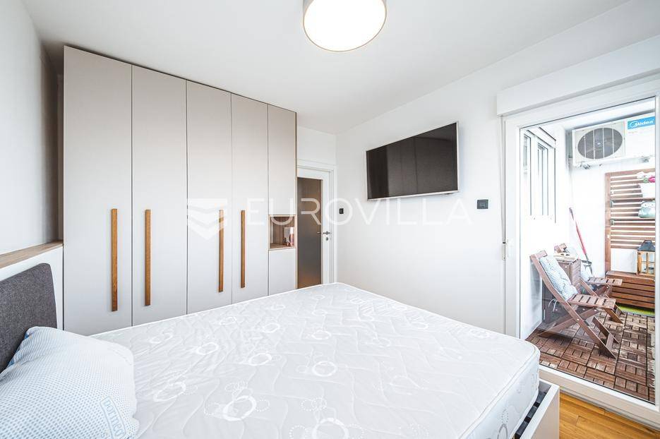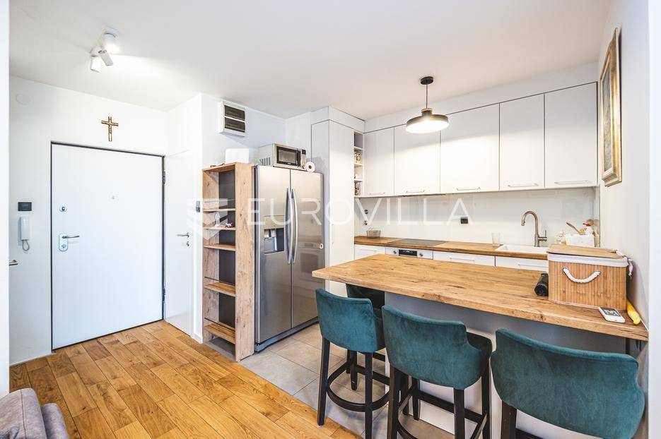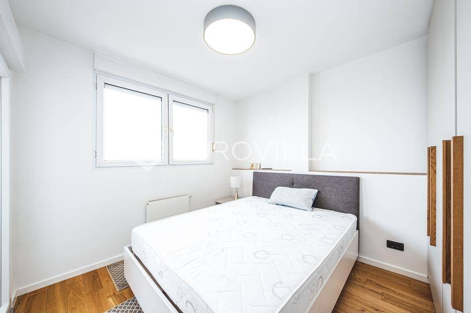 Sastoji se od ulaznog hodnika, dnevnog boravka, kupaonice, kuhinje s otokom, manje radne/ spavaće sobe i velike spavaće sobe s izlazom na balkon.Moderno opremljen, klimatiziran, orijentacije na istok, u blizini Velesajma i Avenue Mall-a.