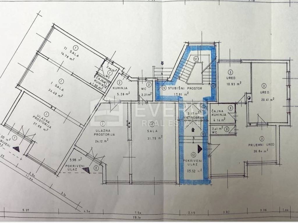 * Prijemnog ureda, dvije kancelarije, prostorije za čajnu kuhinju ili spremište, wc-a, ukupne površine 64,09 m2.