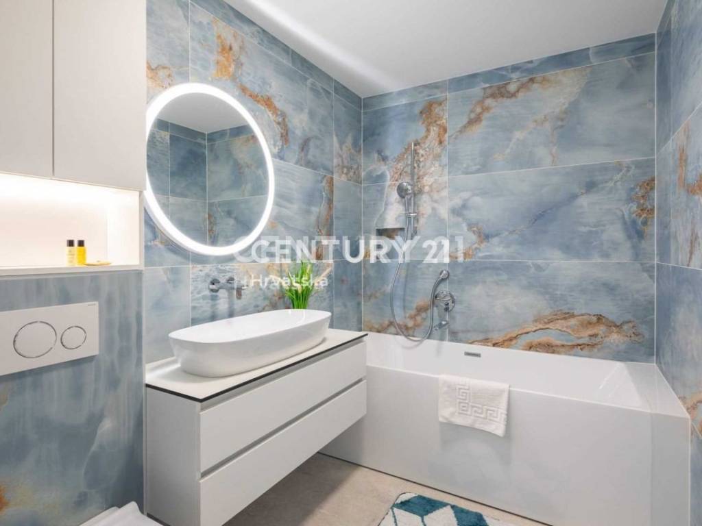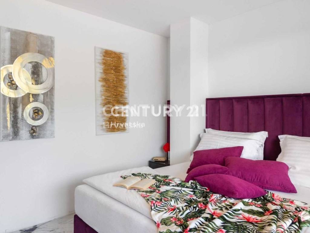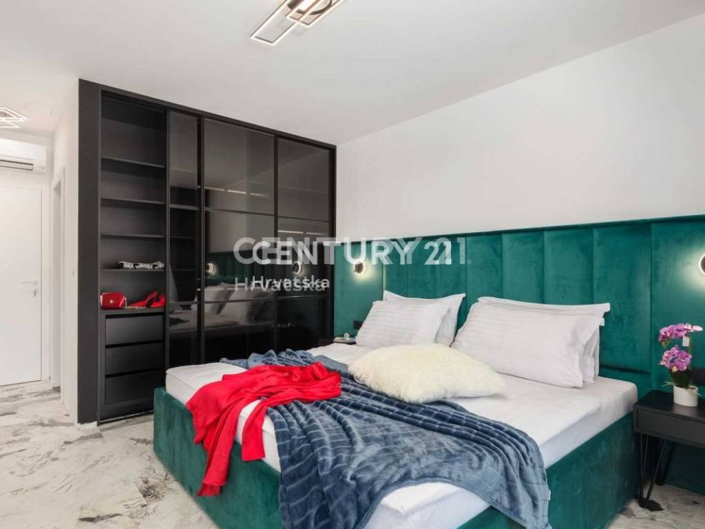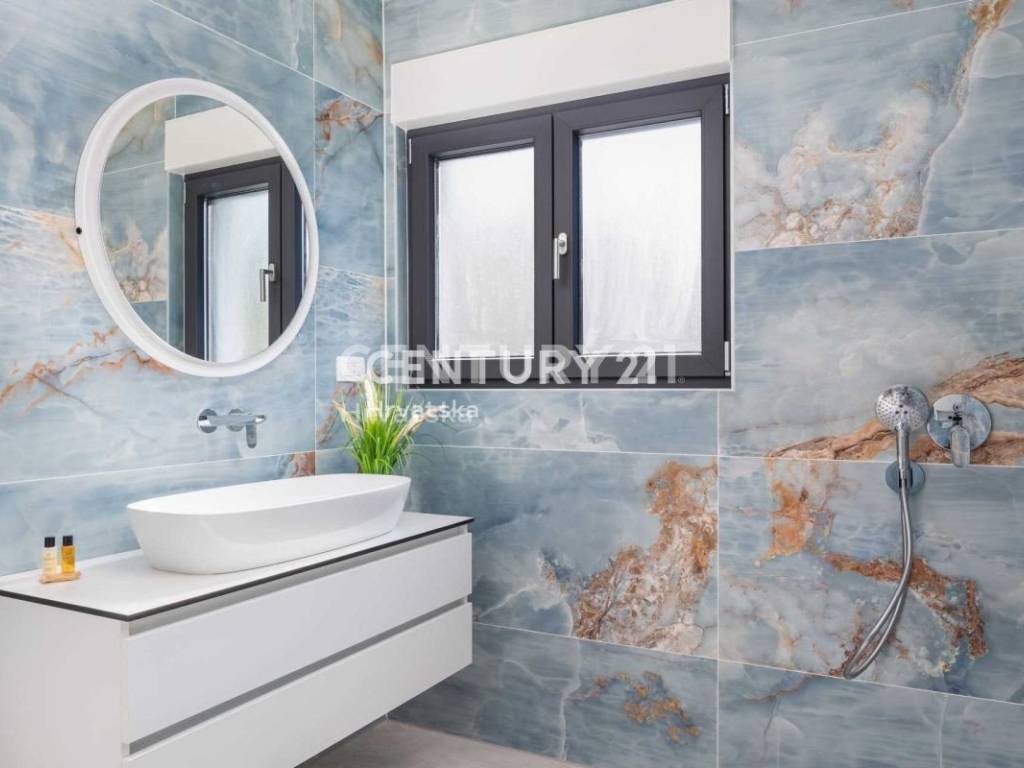 Ekskluzivna vila se sastoji od prizemlja i prvog kata na površini od 200m2 smjestenoj na parceli od 400m2 s bazenom od 40m2 te dva parking mjesta.