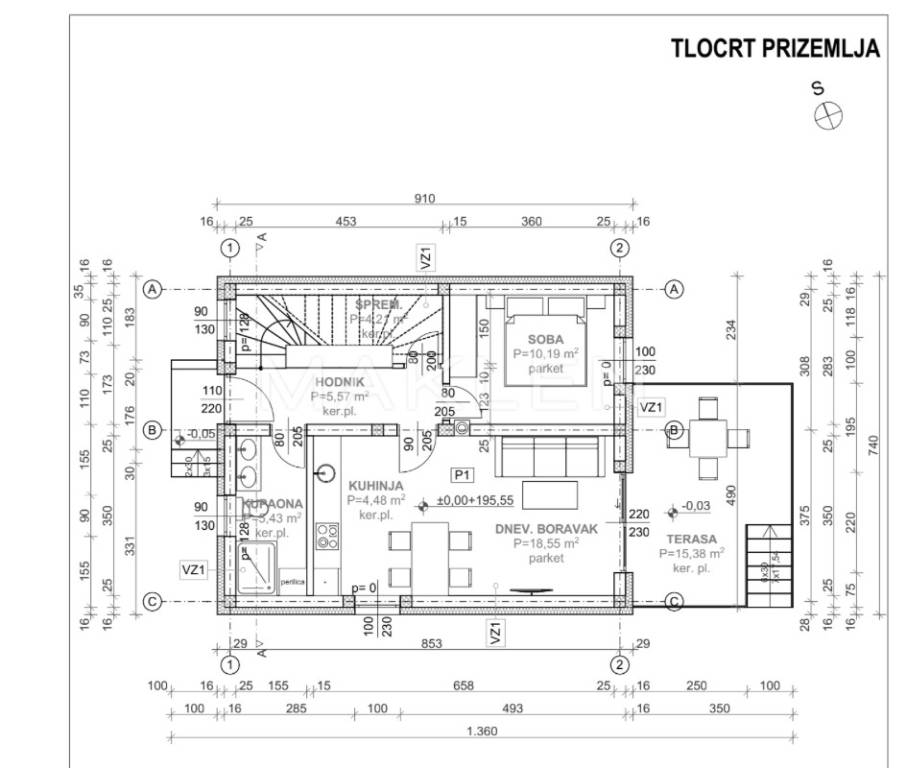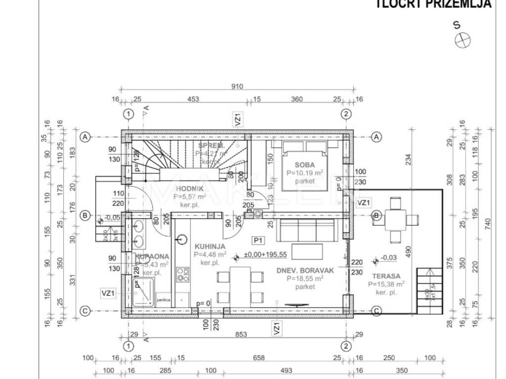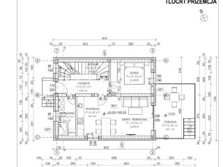 Stambenu jedinicu u prizemlju činiti će slijedeći prostori: hodnik, dnevni boravak s kuhinjom, kupaonica, soba, spremište i nenatkrivena terasa.