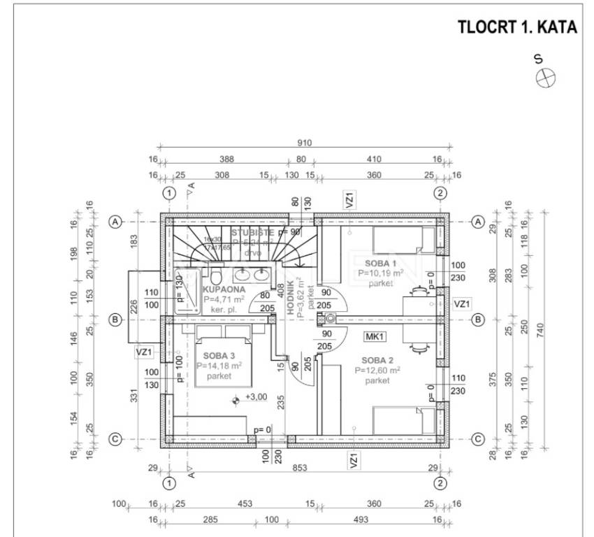 Na 1. katu nalaze se slijedeći prostori: hodnik, stubište, kupaonica i tri sobe.