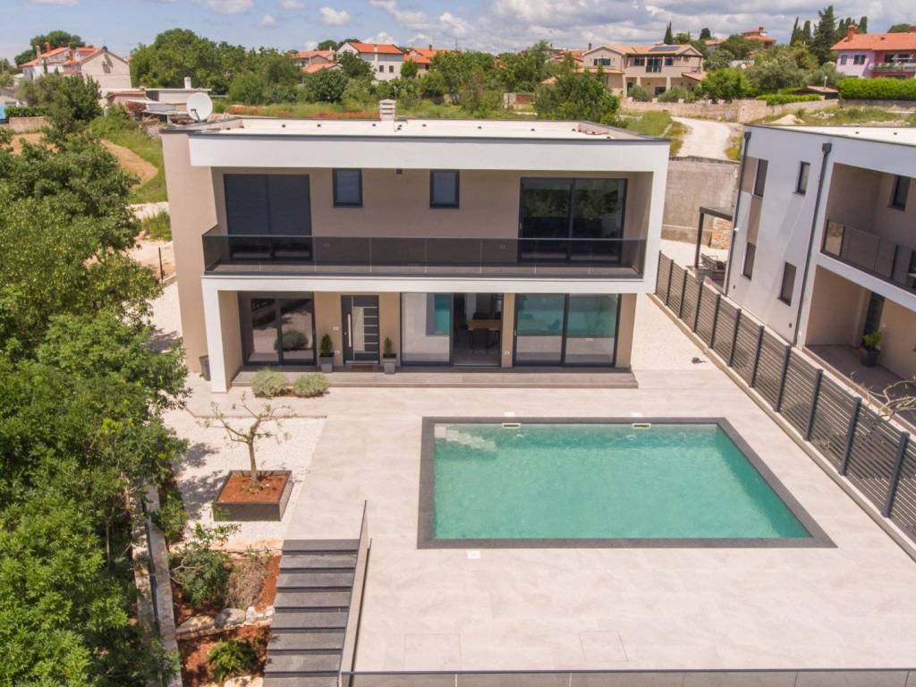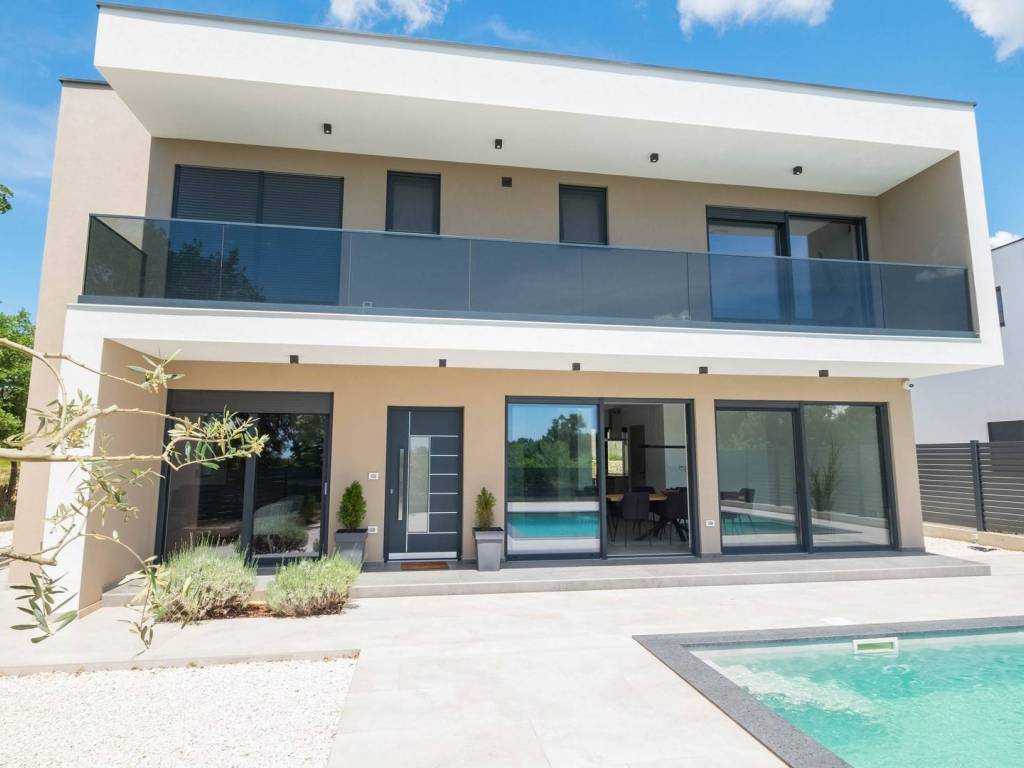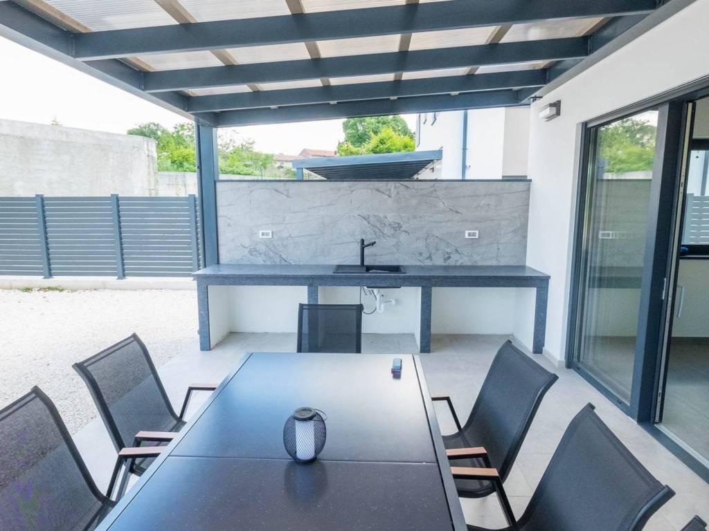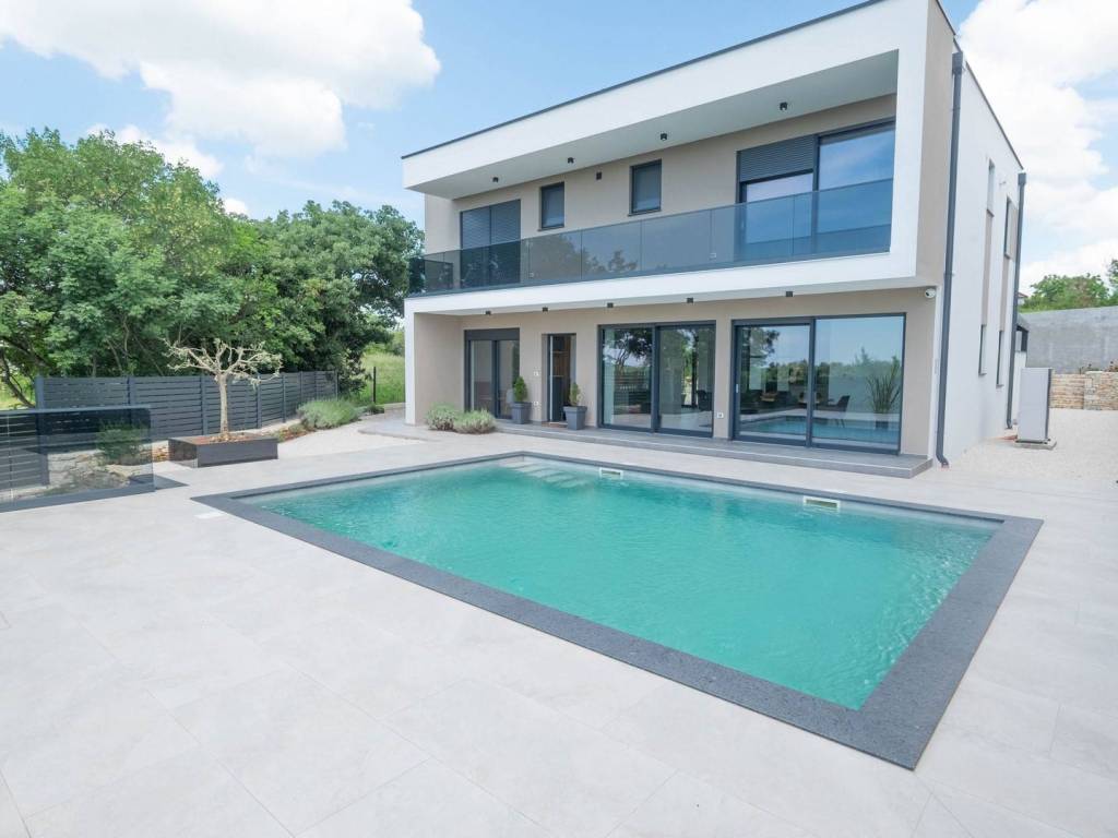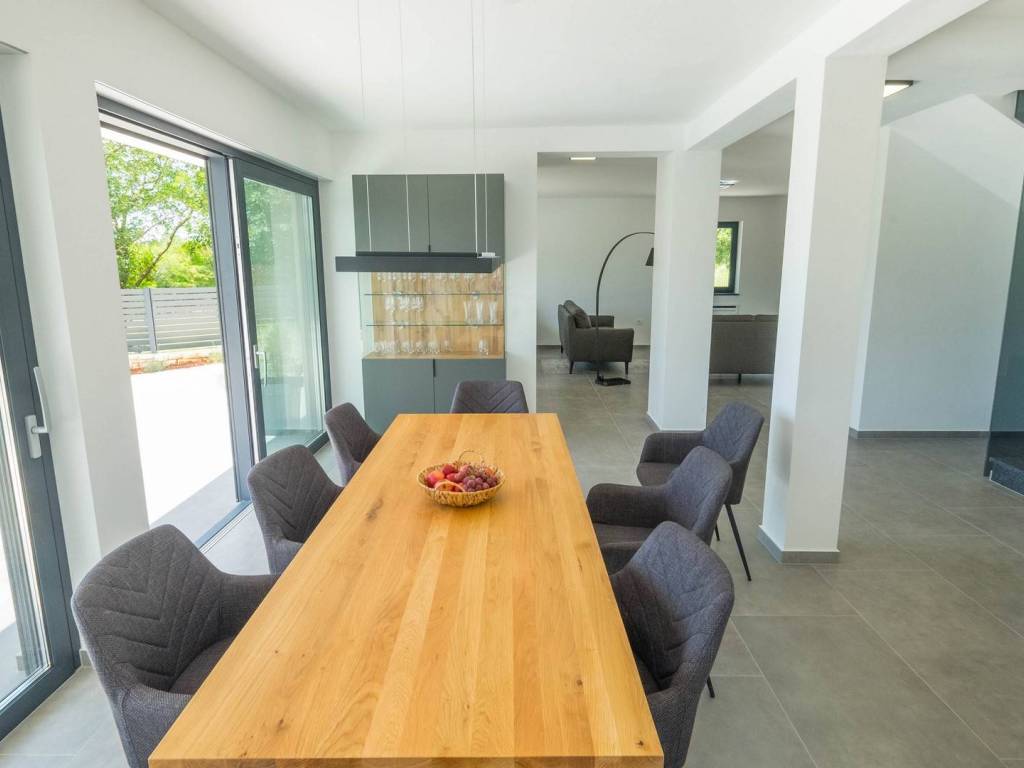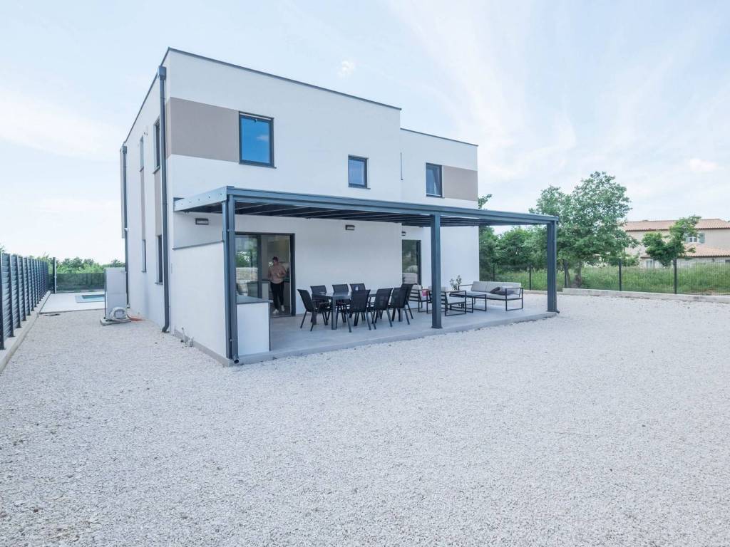 Modern villa with 4 bedrooms and 4 bathrooms. The villa extends through the ground floor and first floor, with a total net usable area of 182.5 m2. It consists of an entrance hall, an open-plan living room, a kitchen and dining room, a toilet, a utility room and a covered terrace with a summer kitchen. On the first floor there is an entrance hall, 4 bedrooms each with a bathroom. The terrace offers a beautiful panoramic view of nature and the sea. The villa is equipped with modern heating and cooling systems, and the highest quality materials and equipment are used in the construction.