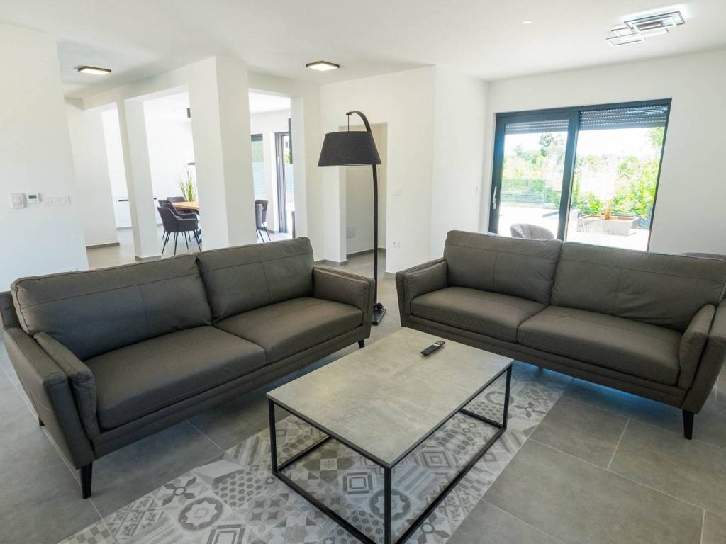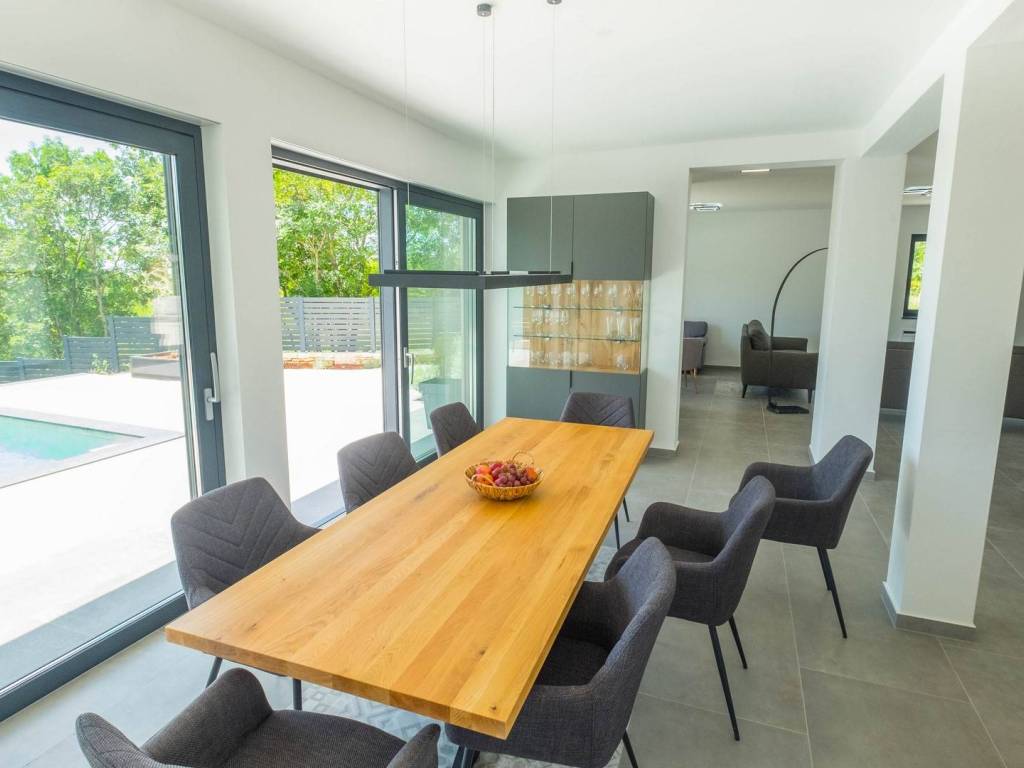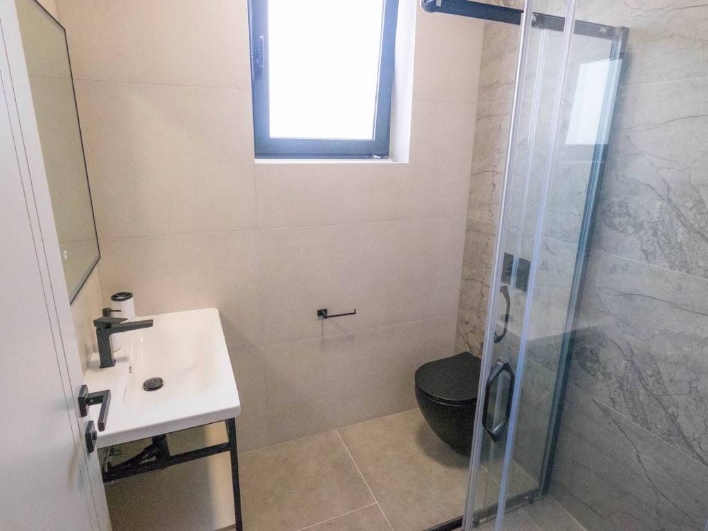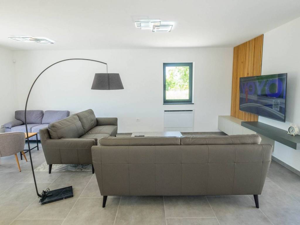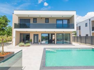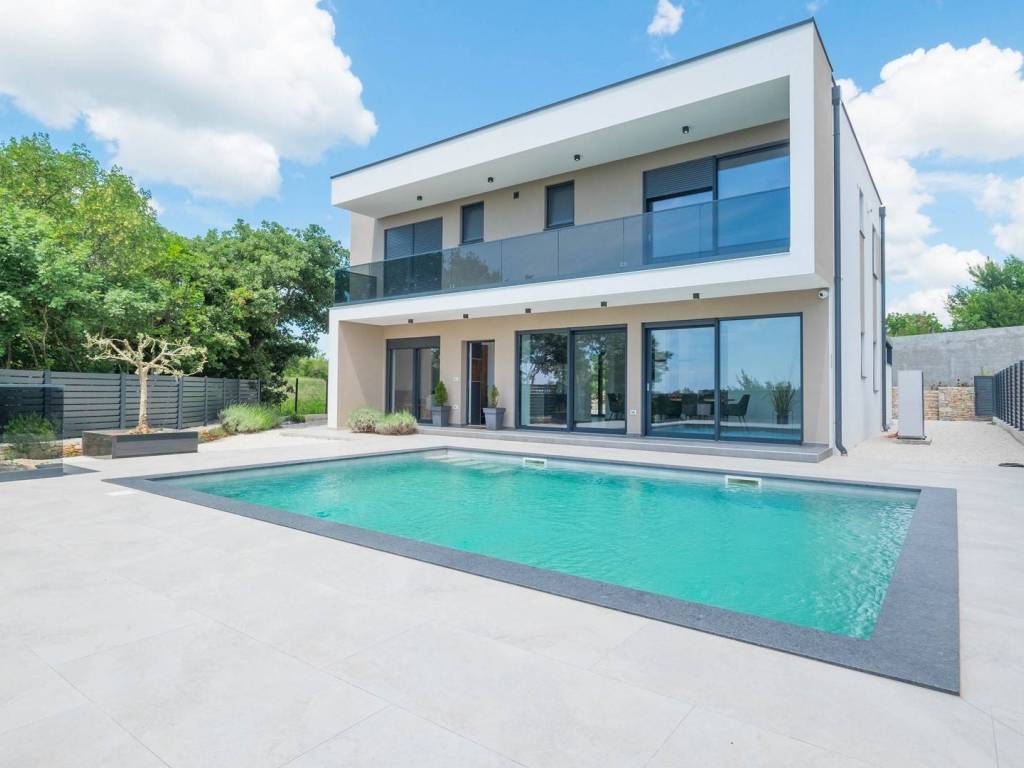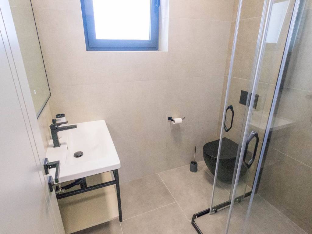 Modern villa with 4 bedrooms and 4 bathrooms. The villa extends through the ground floor and first floor, with a total net usable area of 182.5 m2. It consists of an entrance hall, an open-plan living room, a kitchen and dining room, a toilet, a utility room and a covered terrace with a summer kitchen. On the first floor there is an entrance hall, 4 bedrooms each with a bathroom. The terrace offers a beautiful panoramic view of nature and the sea. The villa is equipped with modern heating and cooling systems, and the highest quality materials and equipment are used in the construction.