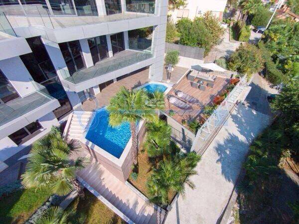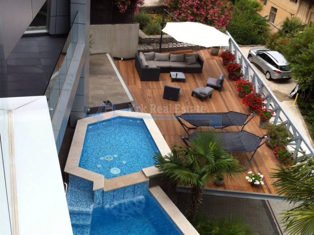 For sale is a detached villa with residential area of 758 sqm in the center of Opatija, built on a plot of 722 sqm. It consists of a basement, first and second floors. In the basement there is a tavern with grill, sauna, gym, engine room and a garage with two parking spaces. The ground floor consists of two apartments with separate entrances. The first apartment has a living room, kitchen, dining room, bathroom and two bedrooms. The second apartment consists of a living room, kitchen, dining room, bathroom and one bedroom. Each apartment has access to a beautiful garden with swimming pool, sun deck and barbecue. The first and second floor there is a three-story apartment that is associated with a basement. On the first floor there is a spacious living room, kitchen, dining room, bathroom and two bedrooms. On the second floor is the master bedroom, dressing room, bathroom and a room with a jacuzzi. Each floor has its own terrace and beautiful view of the sea which is only 150 meters.