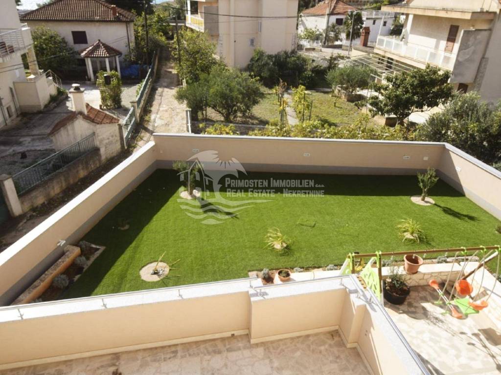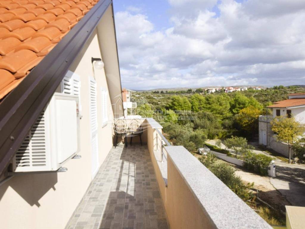 Apartment house near Brodarica with a surface of 400 m². The plot has a surface of 650 m². The house consists of ground floor and three floors. Each living unit has the same room layout and each has a surface of 100 m2. Rooms are arranged as follows: spacious living room with kitchenette which has access to a balcony, two bedrooms, a bathroom and a separate toilet. All rooms have high quality floor tiles, air conditioners, and central heating. Bathrooms have been completely adapted two years ago. In the yard there is an artificial lawn, and on the left there is a garage for two cars. The property is used for tourist purposes, and the sale is fully furnished and is ready to move immediately. Distance from the sea is ca. 150 m.