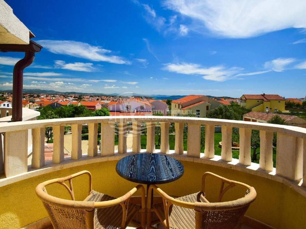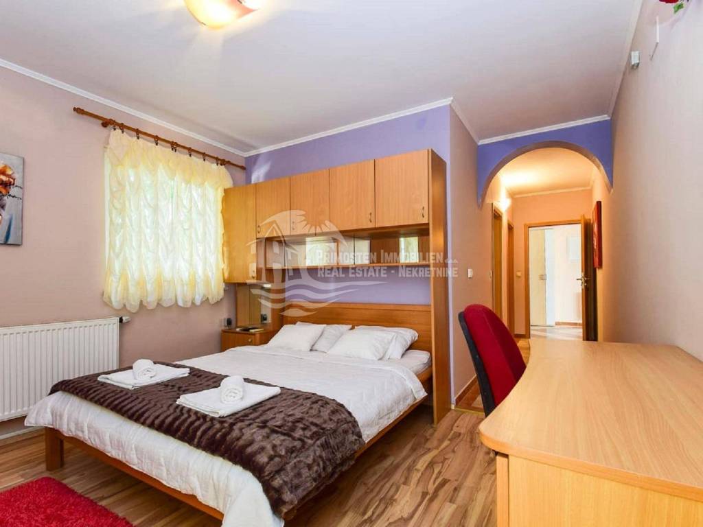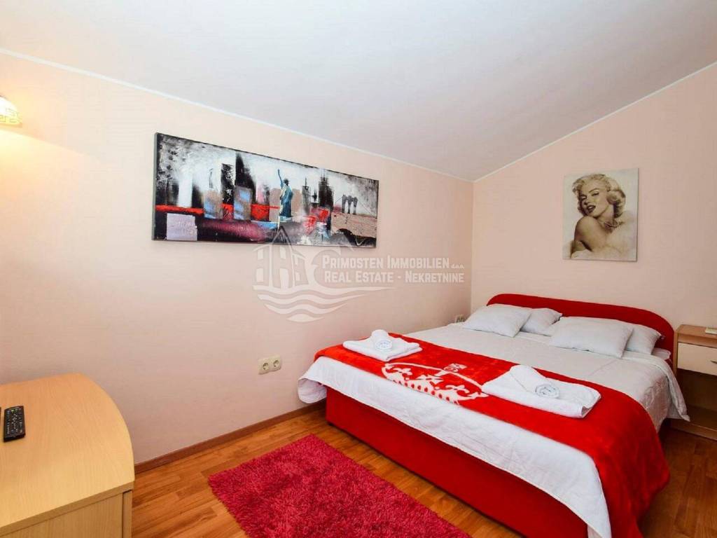 Modern design, maximum use of space and impeccable functionality are the features of this unique villa. An ideal place for your vacation or investment opportunity. This luxury property is located in the central part of Vodice, spread over three plots with a total area of 1654 m². The 350 m² residential building itself is located on an area of 954 m². It consists of: basement 50m² (billiard room, fitness room and pantry), ground floor 205m² (terrace 35m², kitchen, dining room, living room, guest toilet 100m², bedroom with bathroom and wardrobe - 45m², laundry, central heating room and garage) and floors of 100m² (3 bathrooms, 4 bedrooms and living room, 3 terraces, 2 of which have sea views and panoramas). Inside the yard there is a swimming pool 24m², a covered barbecue with a summer kitchen 15m², and an outdoor toilet. The house has central heating, fireplace, 6 air conditioners and the possibility of installing solar heating. The total area of the garden is 700m², with handmade stone walls, a large wrought iron door, a fountain in the central part, and a well of 50m3. It also contains olive trees, lawn and various other plants with automatic irrigation. It is architecturally designed with the aim of achieving privacy and comfort.