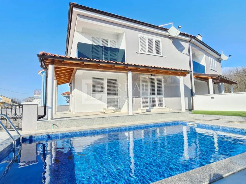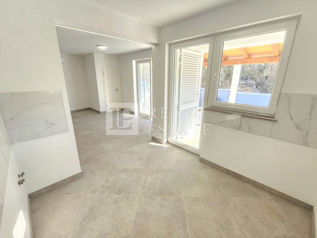 This modern new building consists of two floors, the ground floor and the first floor. The ground floor consists of a spacious open-space area consisting of a kitchen with a dining area and living room, a bathroom and a storage room. The living room leads directly to the courtyard with a swimming pool. An internal staircase leads to the first floor where there are two bedrooms (the larger of which has its own balcony overlooking the sea and greenery) and a bathroom.