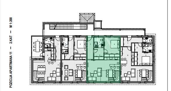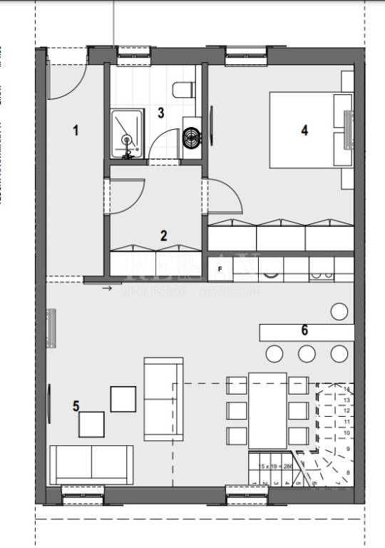 The apartment consists of an entrance hall, a bedroom, a bathroom, an open space kitchen with a dining room and a living room, from where we climb the stairs to the high attic, where we come to the hall from which we go to the bathroom and two bedrooms.