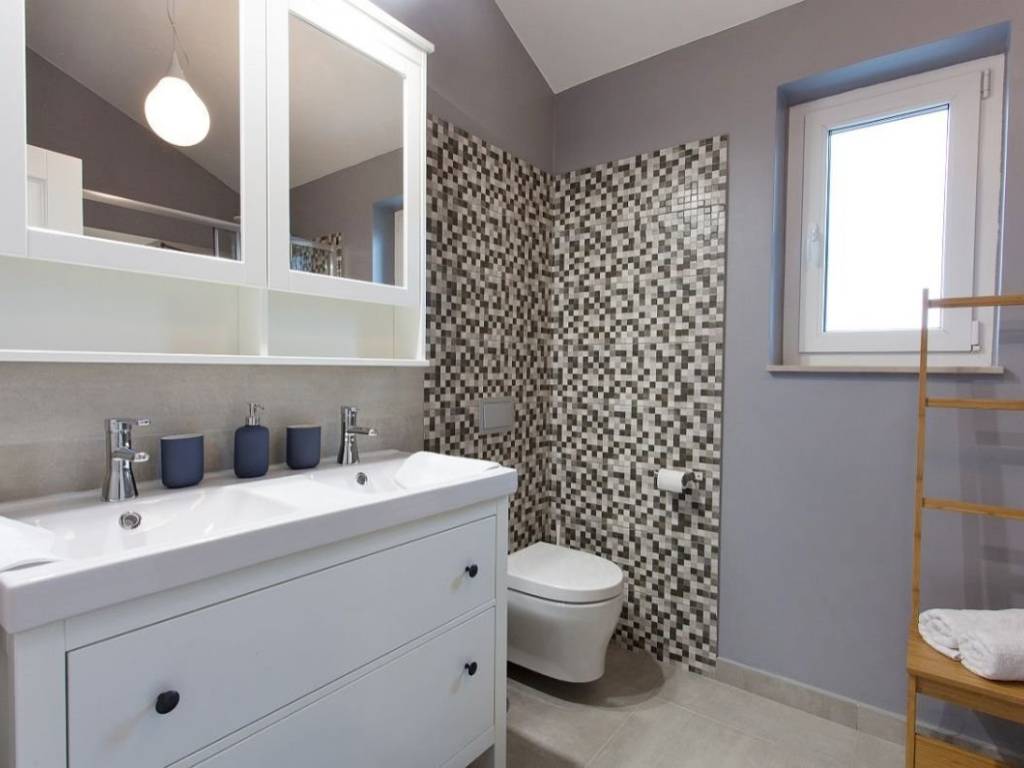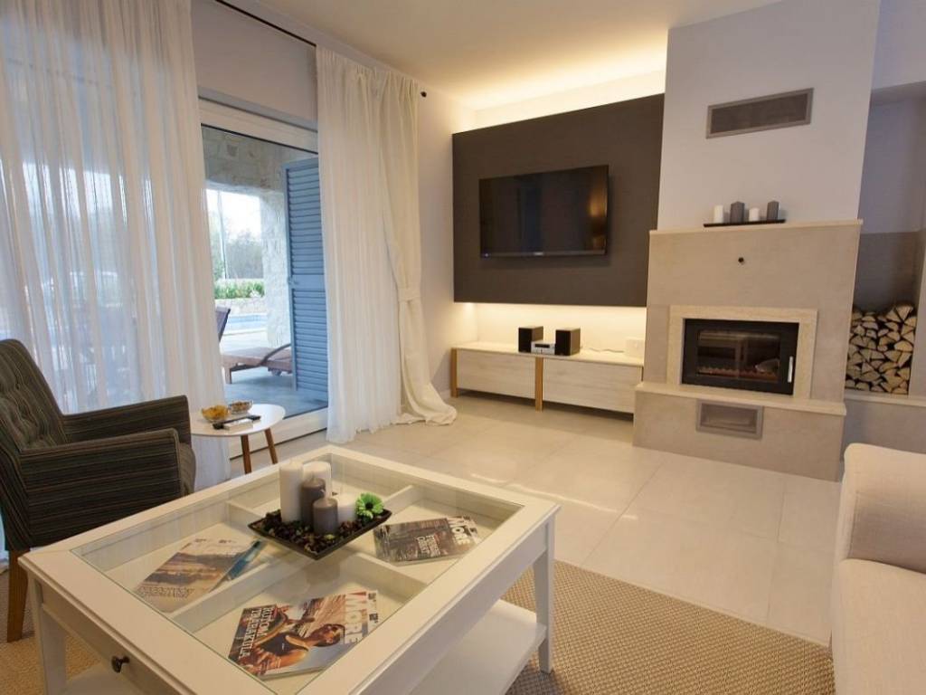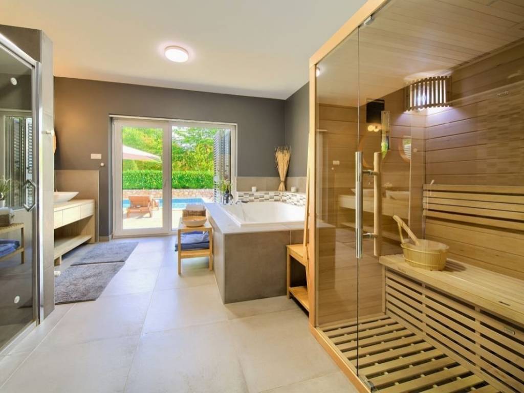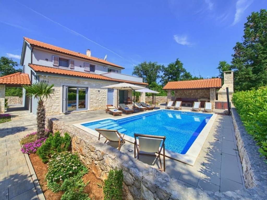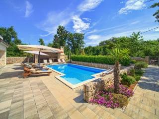 Otok Krk, Dobrinj, šire područje, prodaja samostojećae kuće površine 185 m2, s grijanim bazenom i uređenom okućnicom površine 555 m2, na mirnoj lokaciji, 4000 m od mora. Kuća se sastoji od podruma površine 70 m2, prizemlja s dnevnom sobom, kuhinjom, blagovaonom, kupaonicom, hodnikom, wellnessom, jacuzzijem, saunom, spremištem, vešerajem i natkrivenom terasom te prvog kata s četiri spavaće sobe, dvije kupaonice, hodnikom i terasom. Kvalitetna gradnja i oprema, grijanje i hlađenje pomoću dizalice topline, unutarnji i vanjski kamin, sigurnosni sustav, video nadzor, punjenje za električna vozila, navodnjavanje, tri parkirna mjesta.