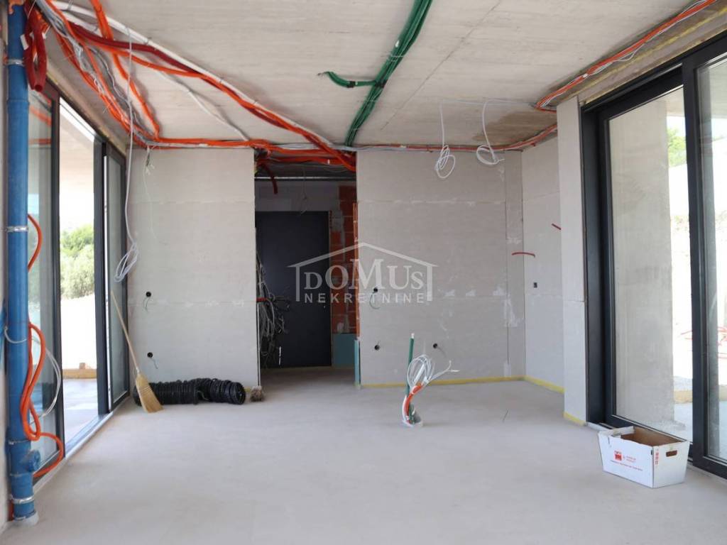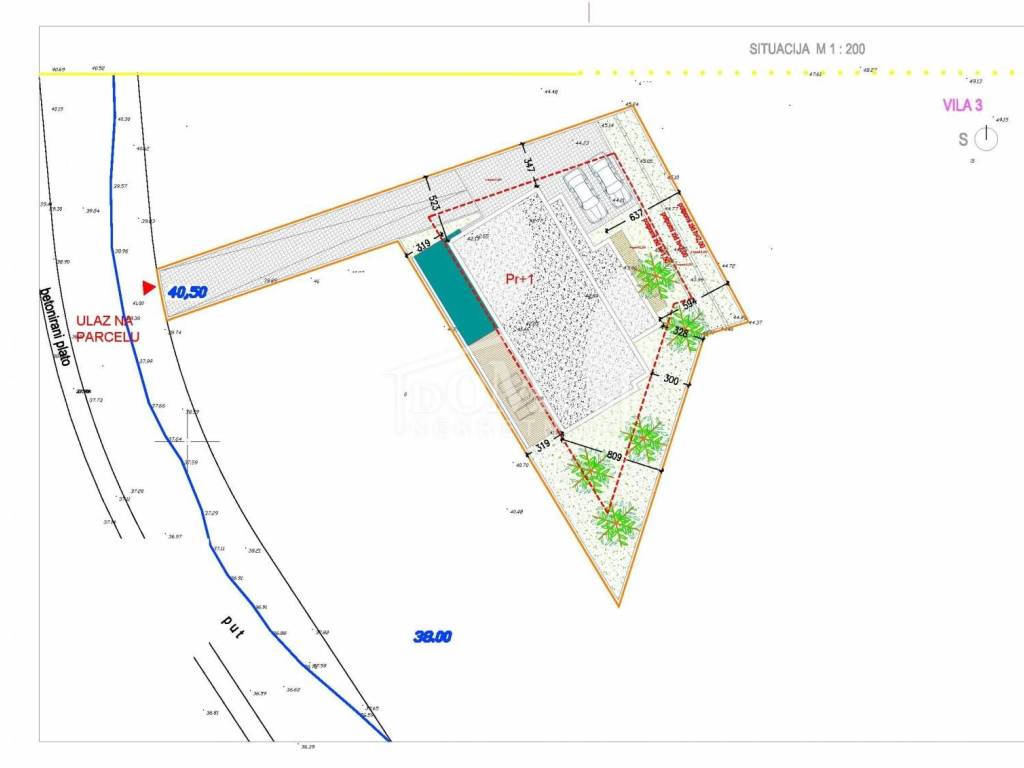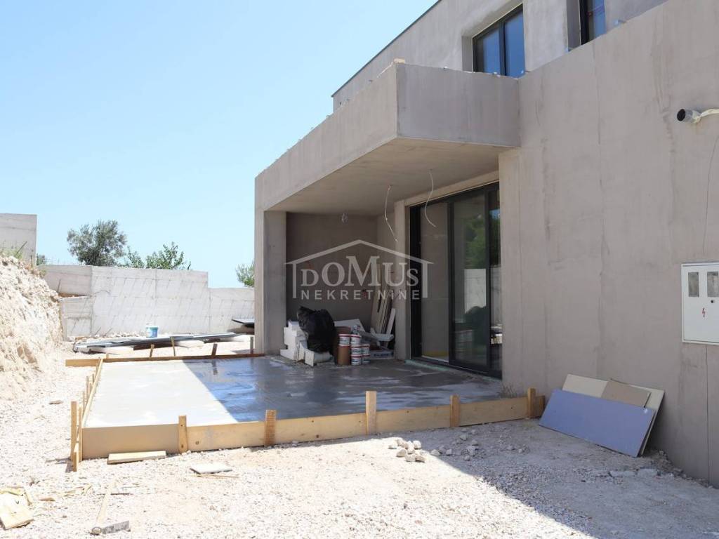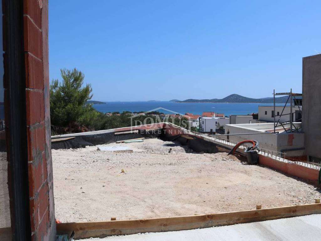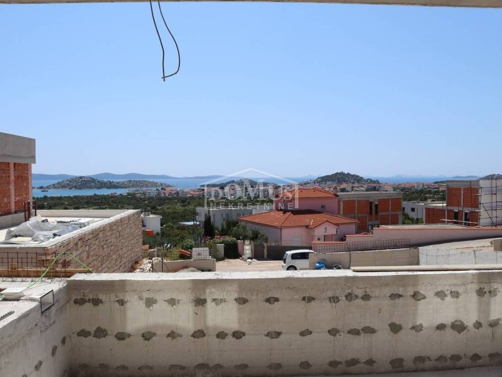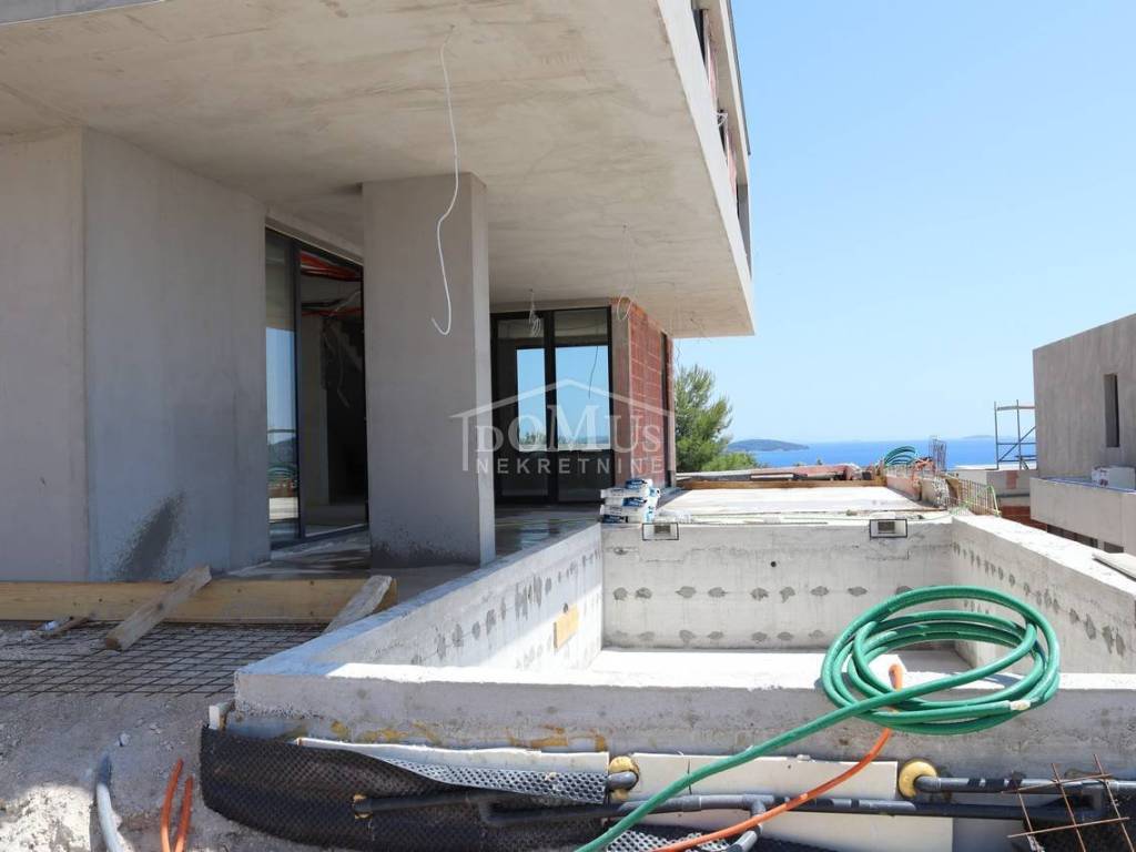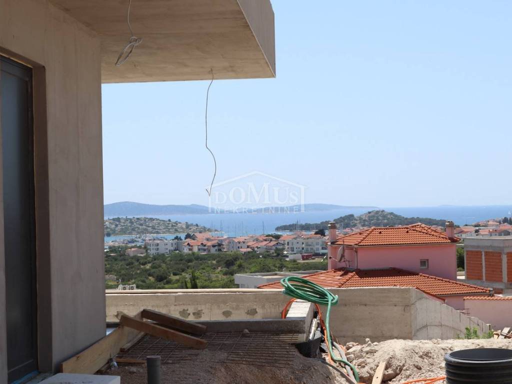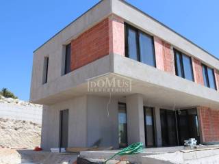 The villa that is currently in construction in Vodice stands out for its unique characteristics. Located on a plot of 613 m2 on a hill, the villa offers a spectacular panoramic view of the sea and the Vodice archipelago. Surrounded by nature and far from the hustle and bustle of the city, the villa offers its residents a peaceful and relaxing environment to escape from everyday stress and enjoy privacy. Designed with modern architecture, the villa is a symbol of contemporary style and elegance. Clean lines, spacious terraces and carefully selected materials create an impressive aesthetic impression. With its two-story structure, the villa has 215.01 usable area and offers plenty of space for comfortable living. The spacious outdoor area includes a 35 m2 swimming pool surrounded by a sun deck, creating an ideal place to relax and socialize outdoors. The spacious interior of the villa includes the main entrance, hallway, storage room, dining room, living room, kitchen, which leads to two terraces, guest toilet. On the first floor there are four spacious bedrooms, each with its own bathroom, and a laundry room. Although located in a quiet environment, the villa is only 700 meters from the sea/beach and 1000 meters from the city center, providing a balance between privacy and ease of access to all necessary amenities.