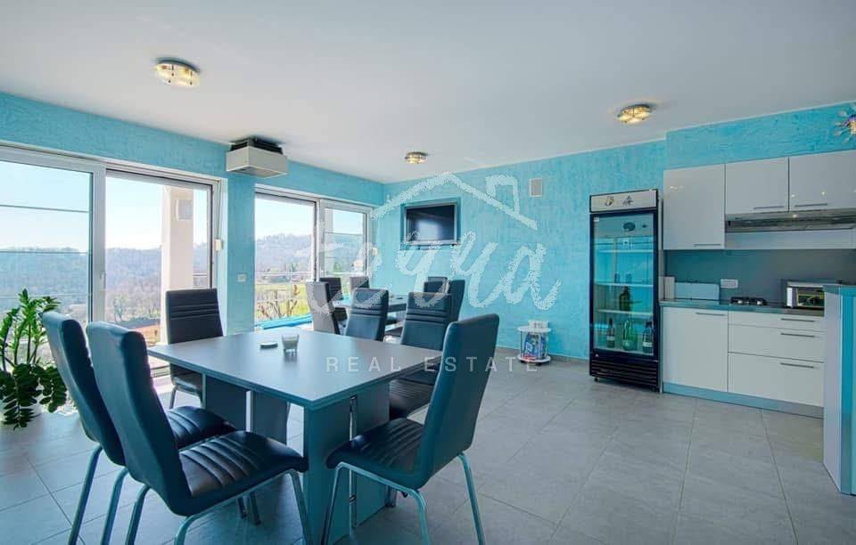 Technical features include solar collectors for water heating, radiator and fan-coil heating, underfloor heating in bathrooms and the pool, a central air conditioning system, and a dehumidification system. The house is equipped with video surveillance and installed connections for TV, Internet, telephone, and audio systems.
