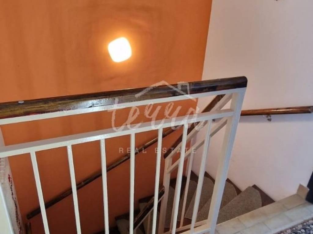 The apartment consists of a garage with a basement, on the first floor there is a living room, a kitchen with a dining area and a toilet. In the back there is an exit to a small covered terrace with a fireplace. On the upper floor there are 3 bedrooms and a bathroom.
