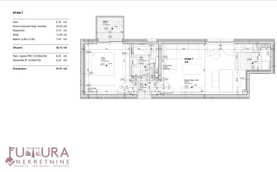 Stan se sastoji od: jedne spavaće sobe, kuhinje + blagovaone i dnevnog boravka, kupaone, i balkona.