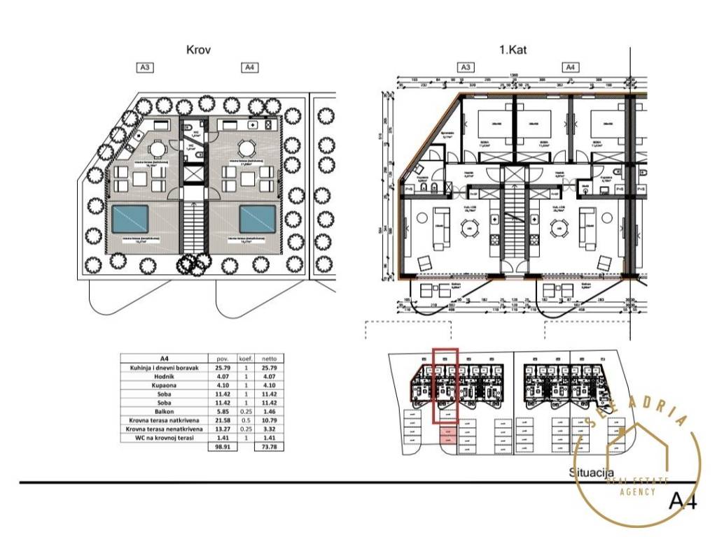 A one-room apartment on the 1st floor + a roof terrace of 84,64 m2 in Tar is for sale. It consists of a living room with a kitchen, bathroom, hallway, storage room, 2 bedrooms and terraces. The apartment has 2 parking spaces. Expected completion of construction 04/2024.