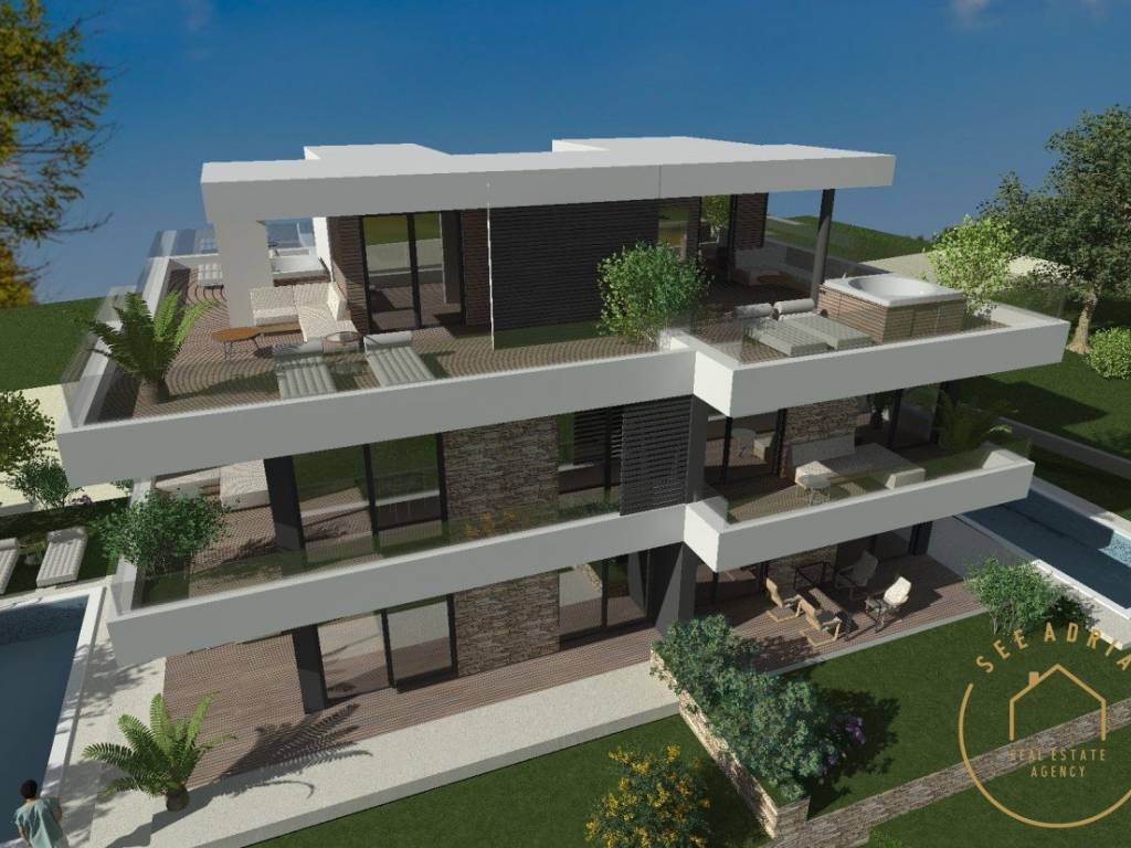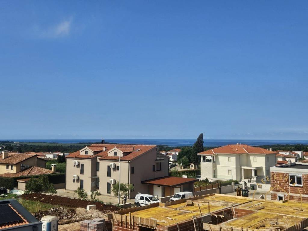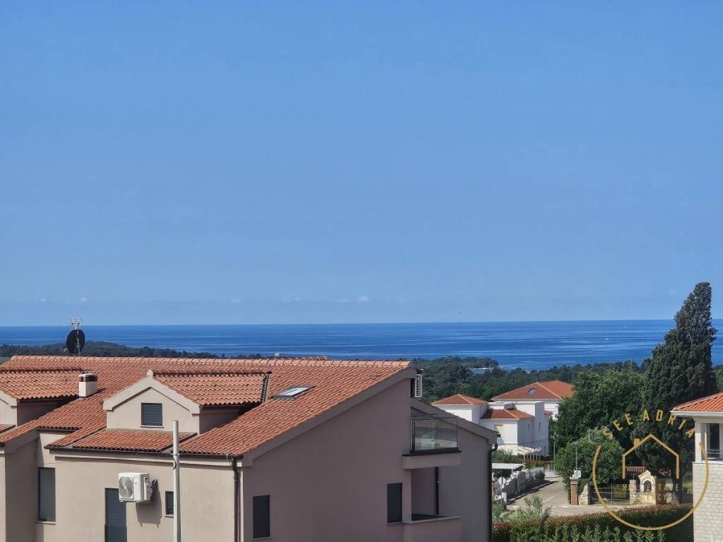 An apartment for sale on the 1st floor in a smaller residential building with 4 apartments. The apartment has 99.08 m2 and consists of an entrance hall, 2 bedrooms, bathroom, living room with kitchen and dining room in an "open space" version from which exits to a covered terrace. From the apartment, stairs lead to the roof terrace from which offers a beautiful view of the sea. On the roof terrace there is a toilet and a space for a sauna and jacuzzi. The apartment has 1 parking space!
