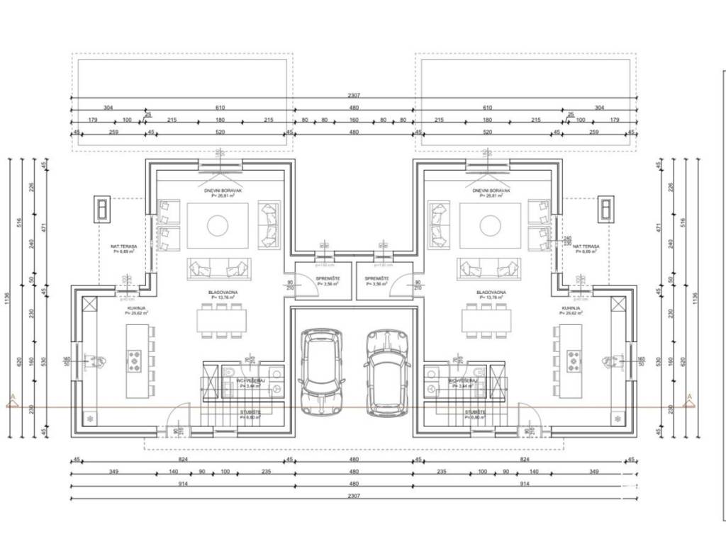 On the 1st floor there are two bedrooms, each with its own bathroom and access to a terrace. On the third floor there is another bedroom with a large bathroom, a wardrobe and a space for a sauna. The room opens onto a spacious covered terrace with a sea view.