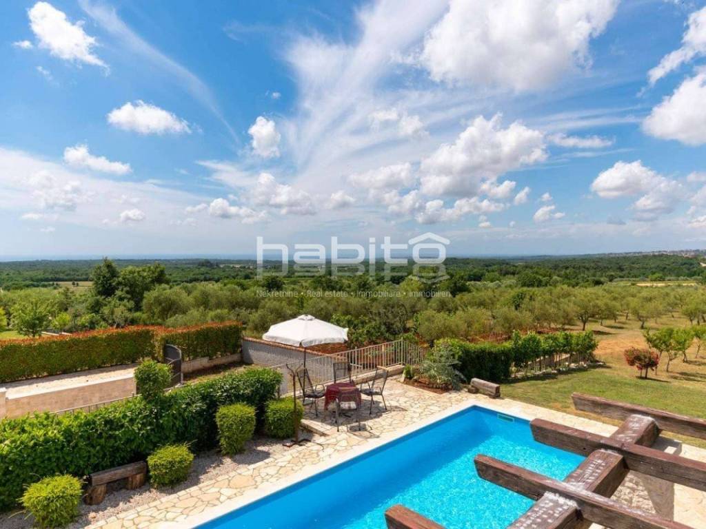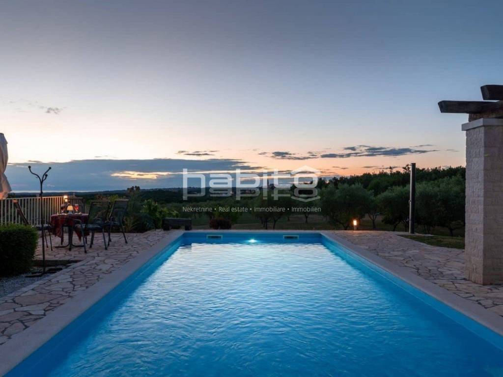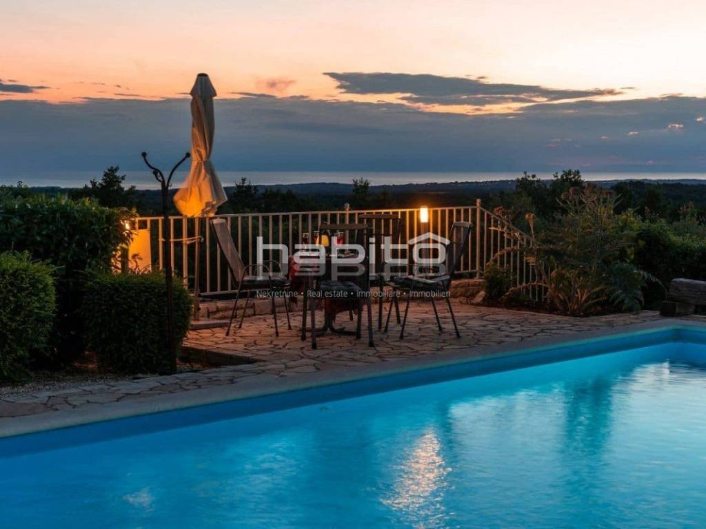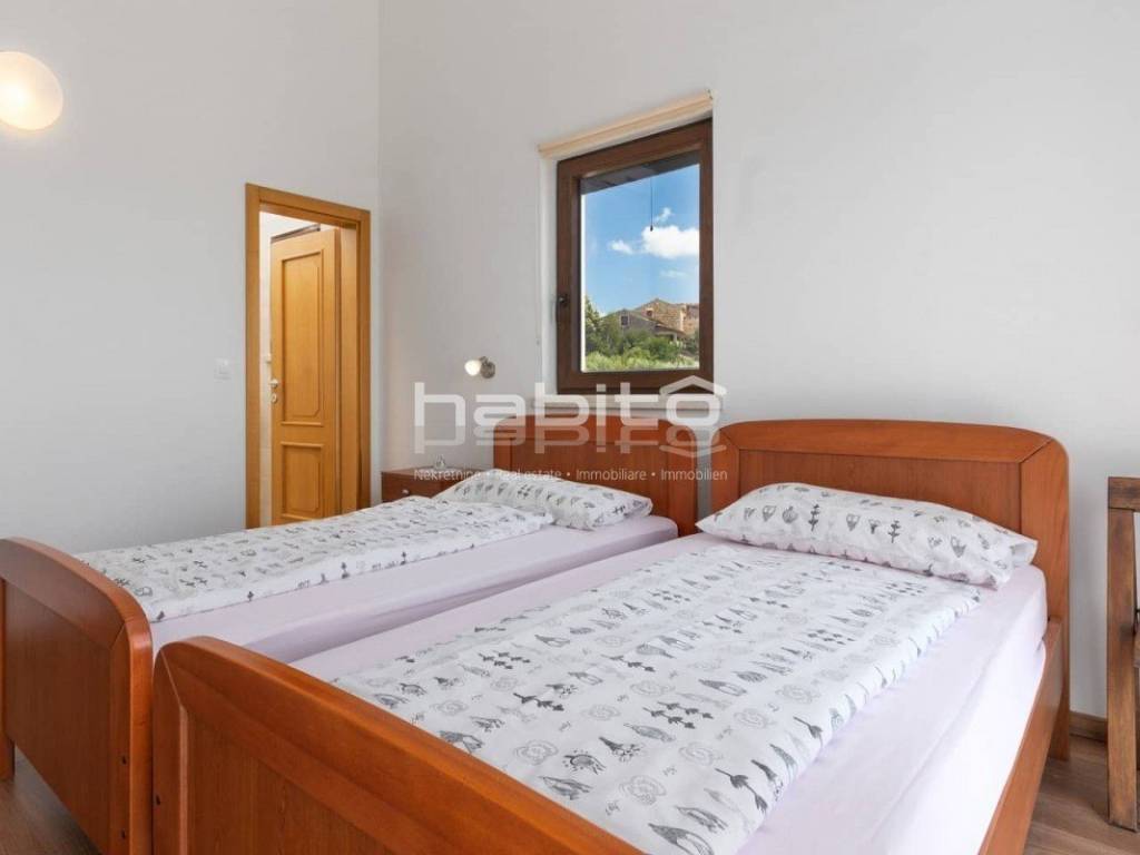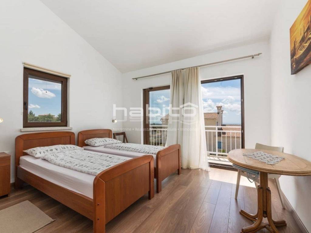 The house of approx. 160 m on two floors consists of a ground floor where you will find a kitchen with a dining room and a spacious living room with a fireplace and two exits to a covered terrace, one bedroom with with its own bathroom, a separate toilet. On the first floor of the house there are two bedrooms with its own bathroom. Both rooms have a beautiful panoramic sea view and the view of the village of Visnjan.